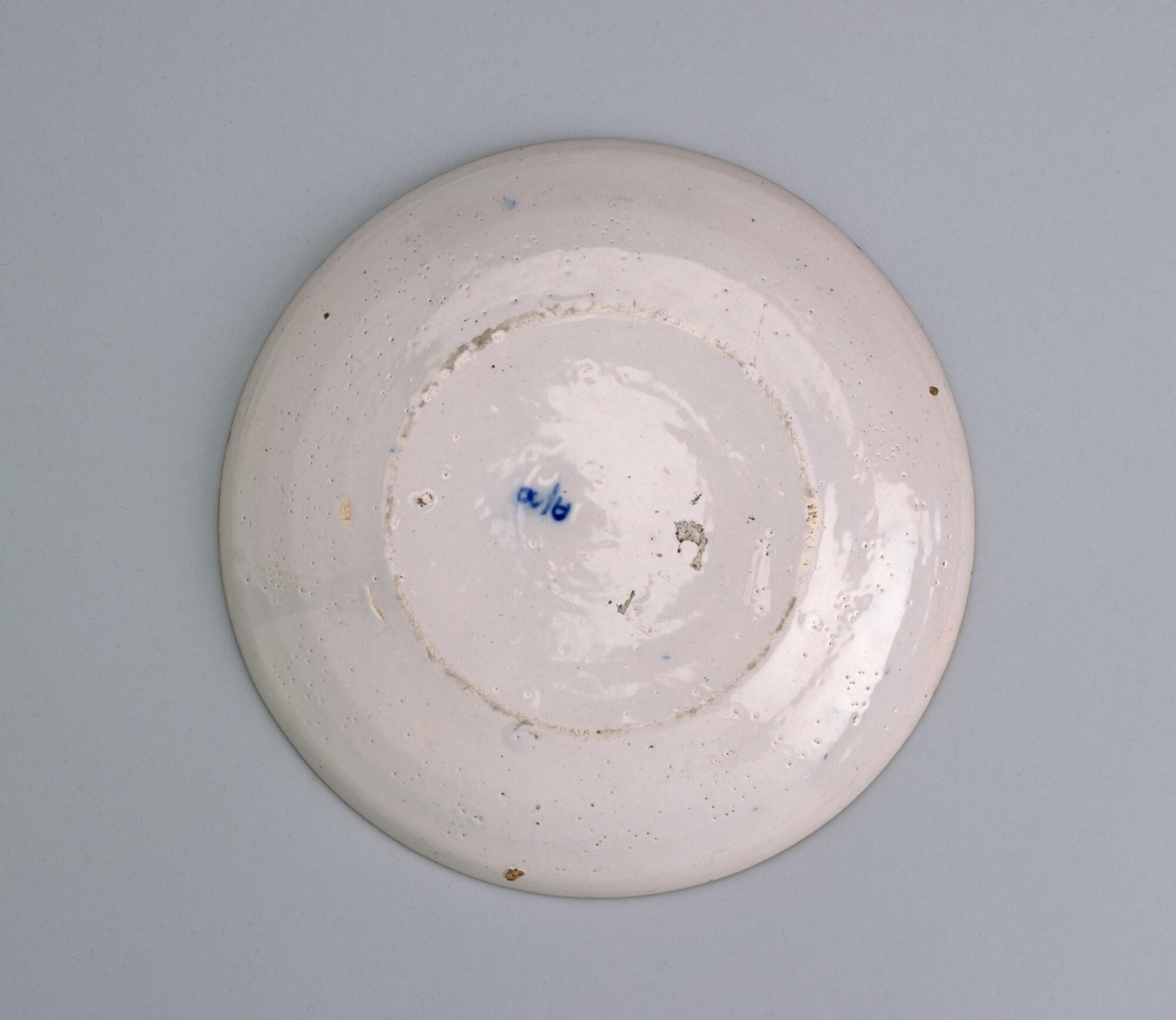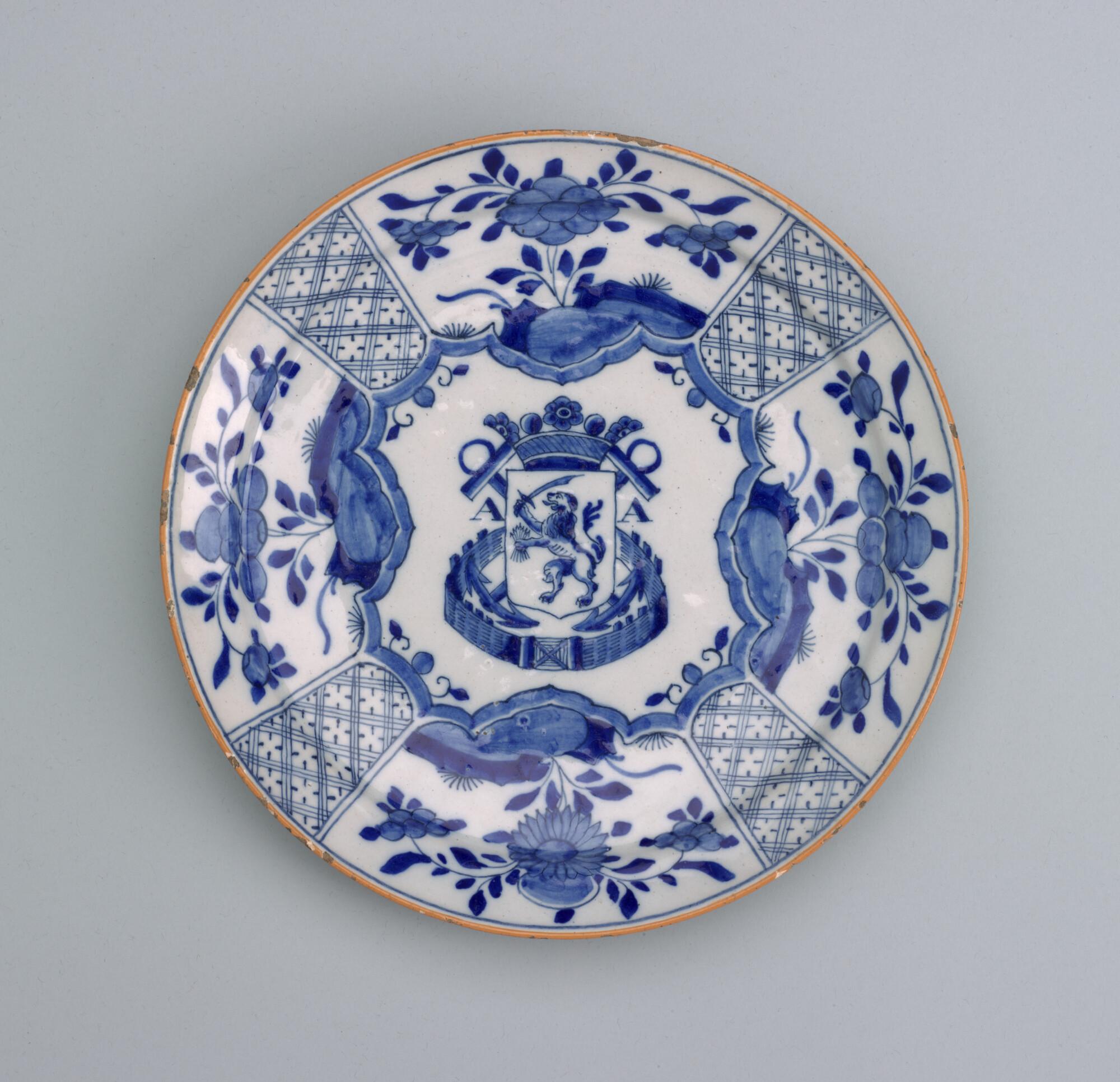 Bord, blauw gedecoreerd, in het midden de leeuw met pijlenbundel in de gesloten tuin, waarachter twee gekroonde ankers met de letters AA