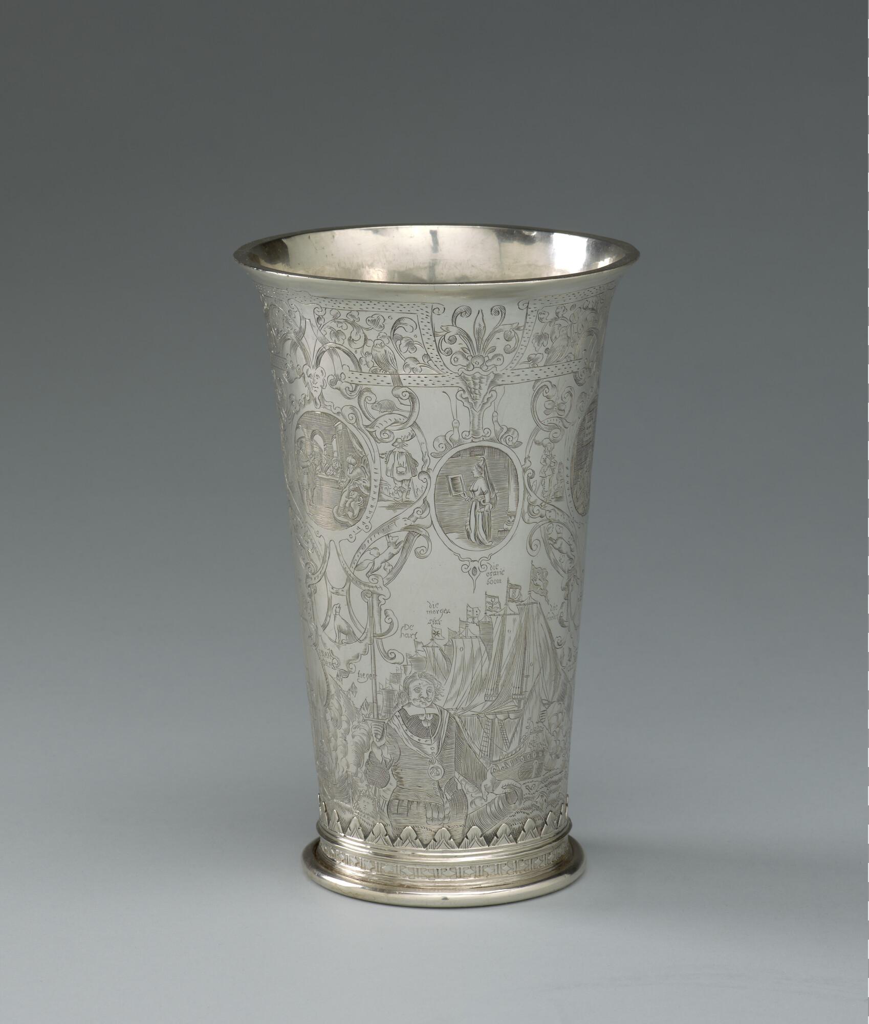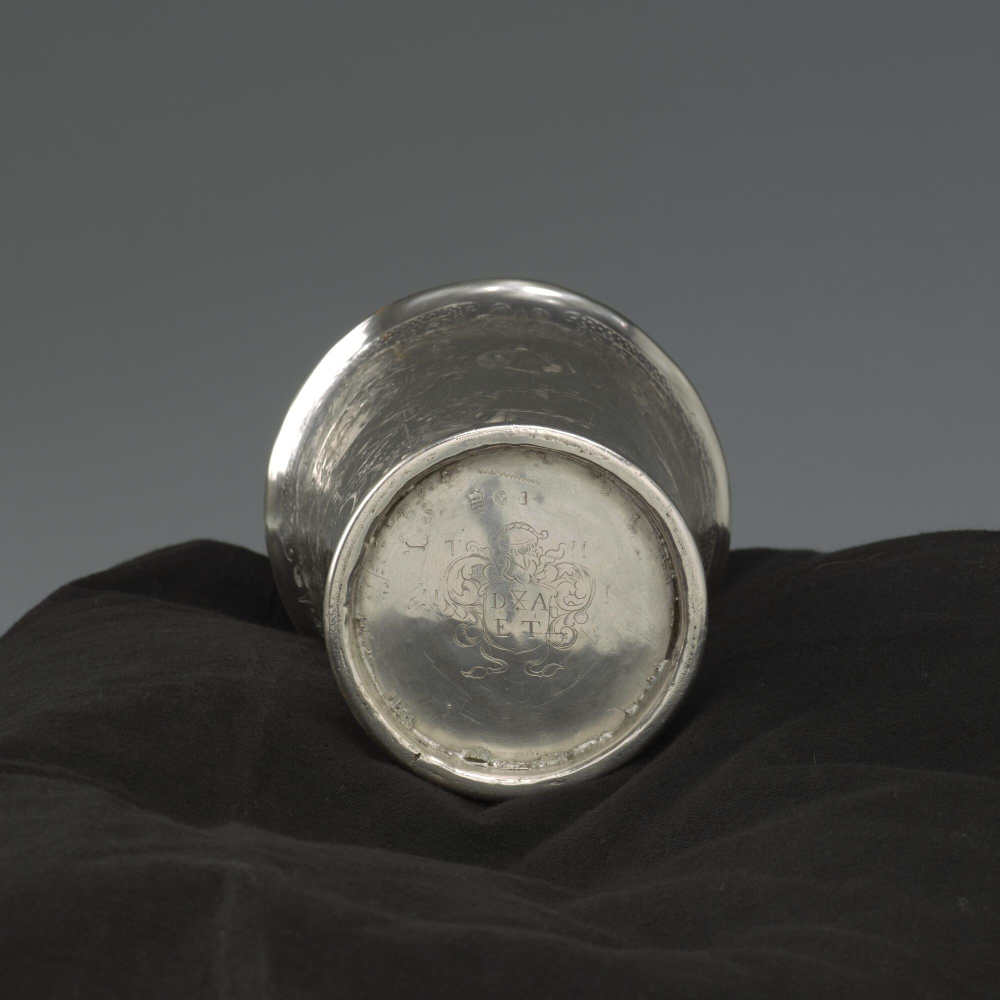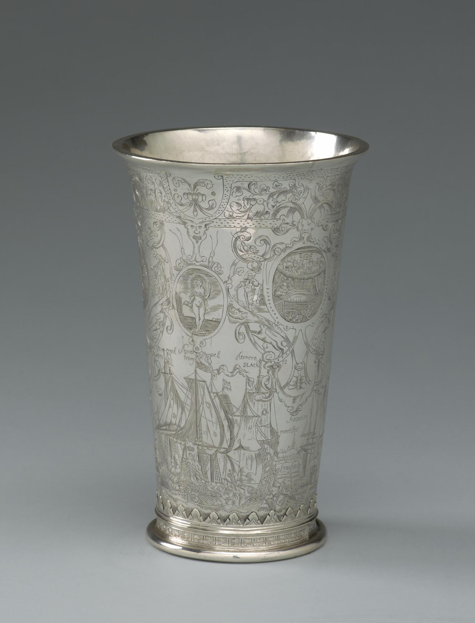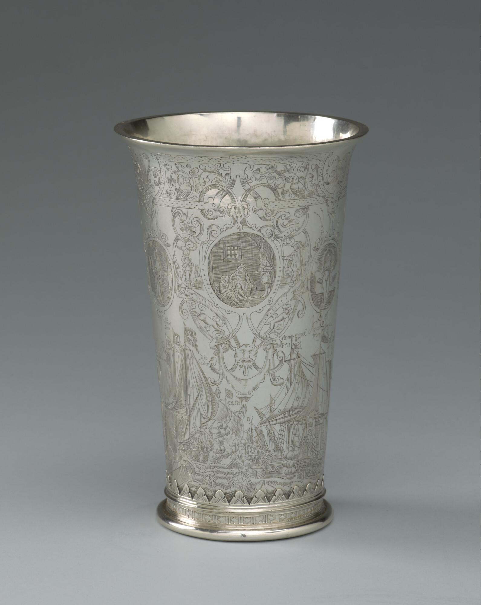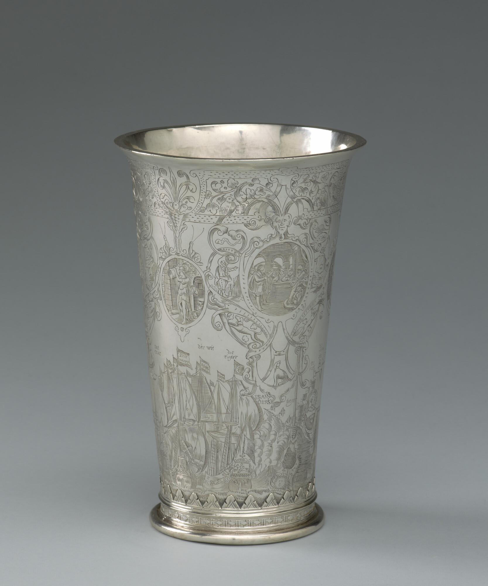 Zilveren beker, langs voetrand gedecoreerd met een voorstelling van de Driedaagse Zeeslag bij Portland van 26 februari tot 2 maart 1653 en een portret van Maarten Harpertsz. Tromp.