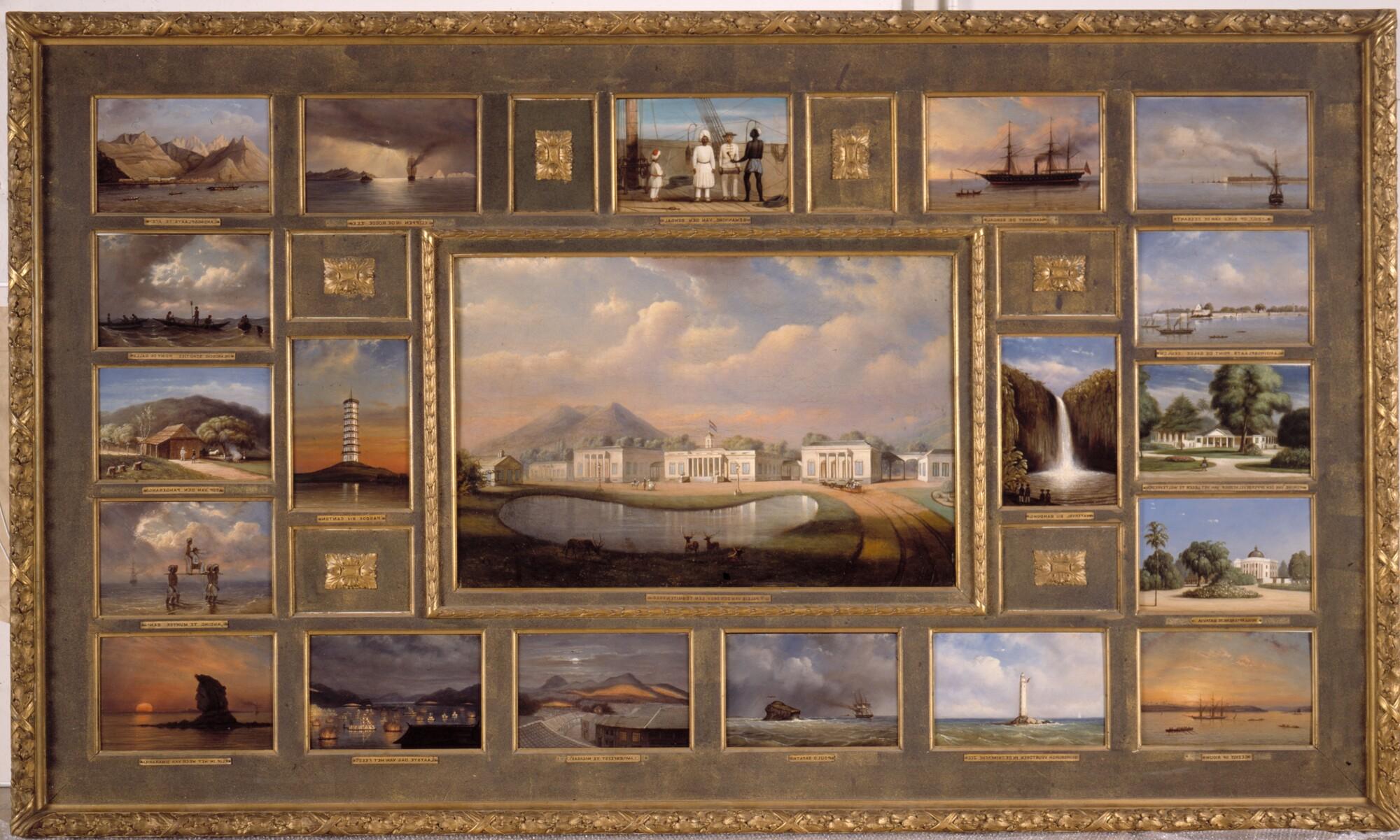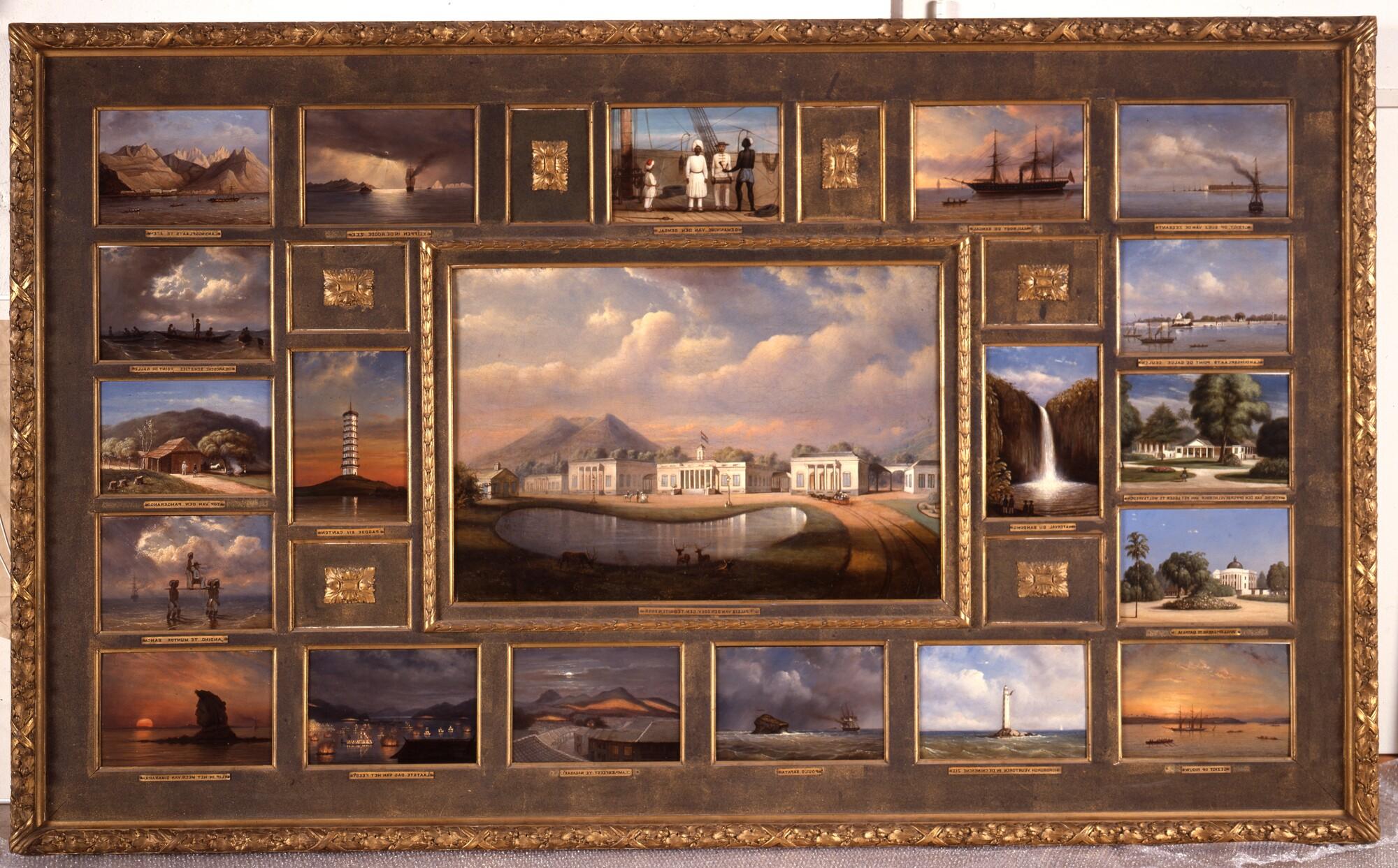 Schilderij van een reis van Suez naar Nagasaki via Oost-Indië. Bestaande uit een grote afbeelding op doek en negentien panelen in lijst, geschilderd door Willem Troost naar tekeningen van Johan Maurits graaf van Lynden.