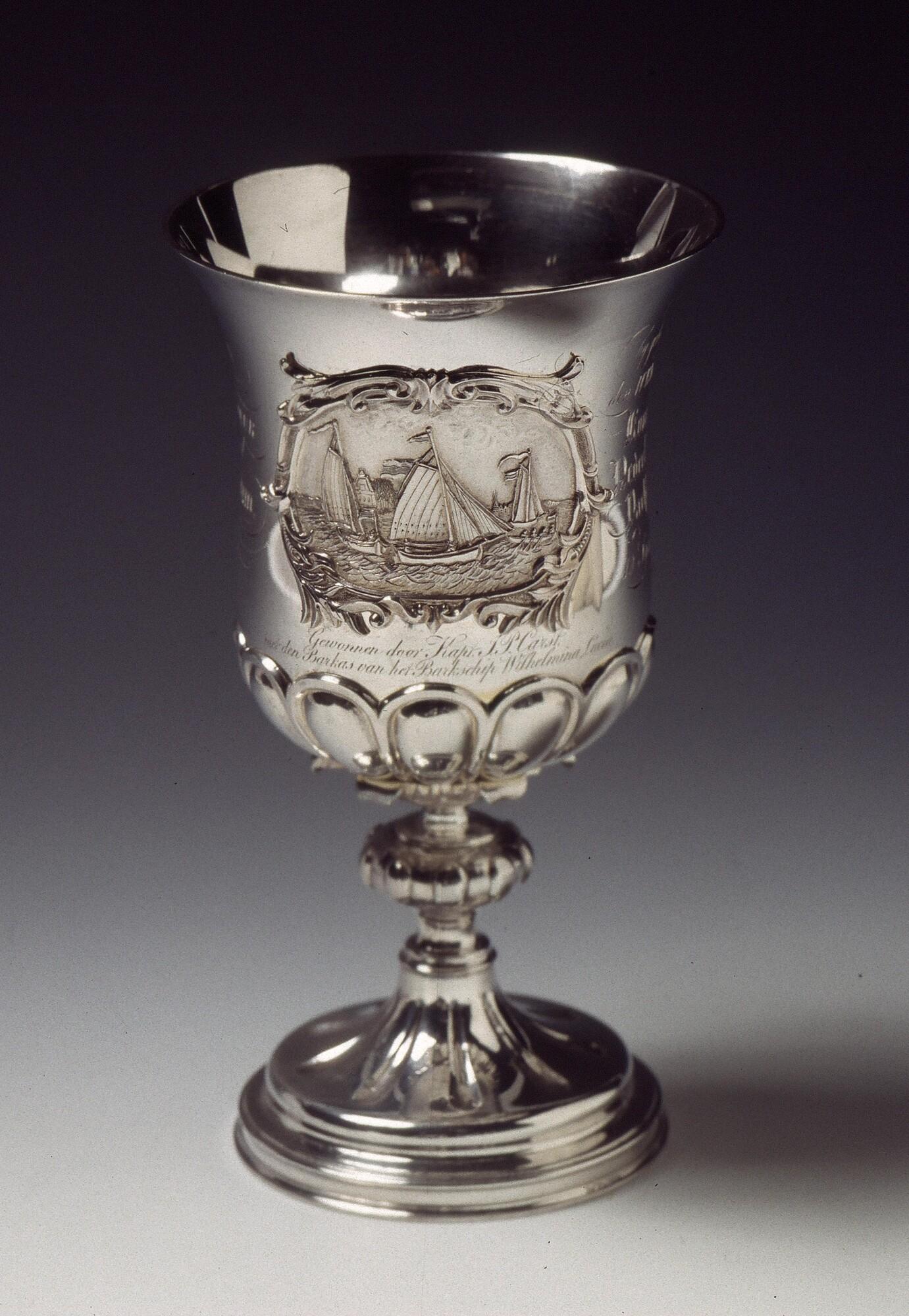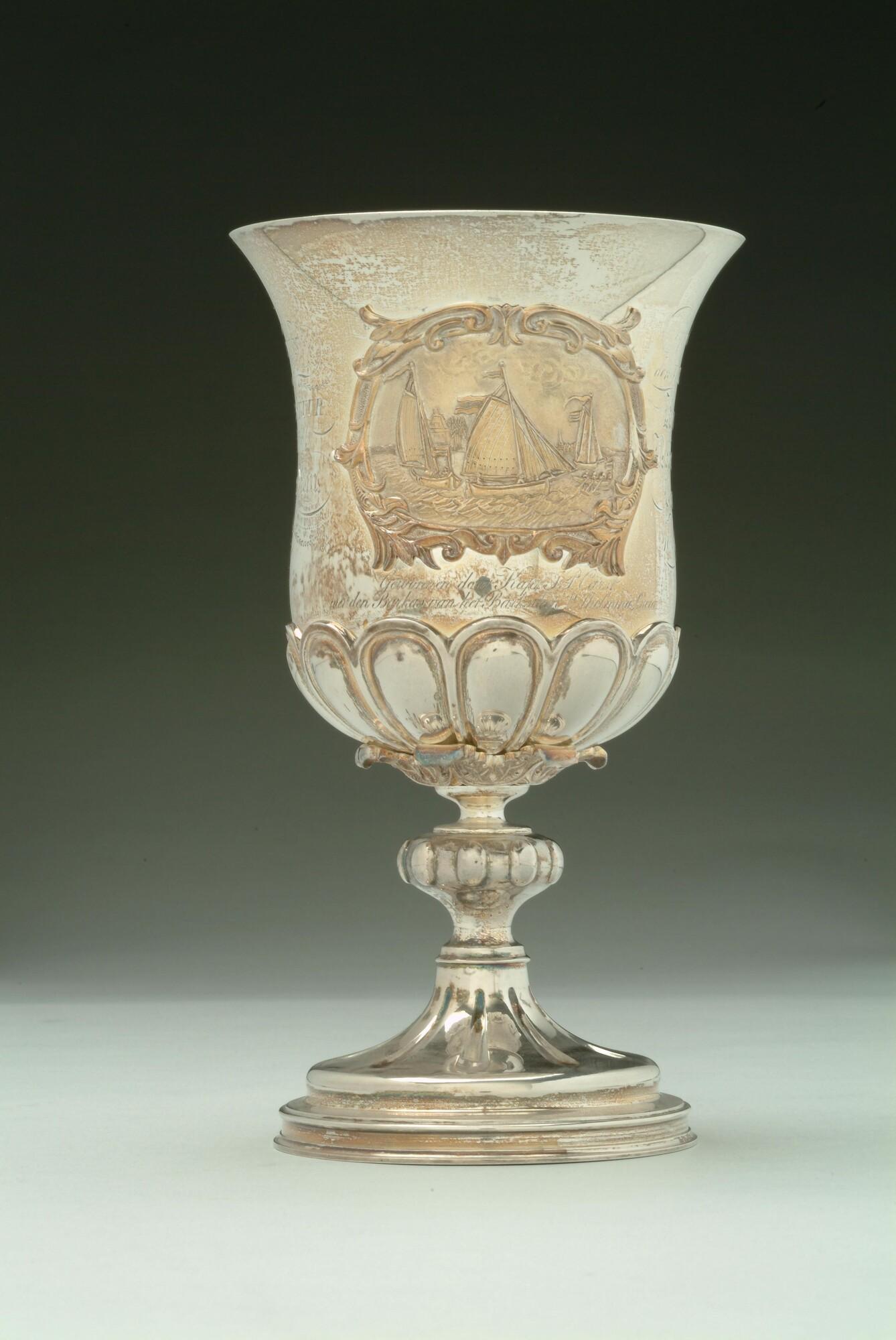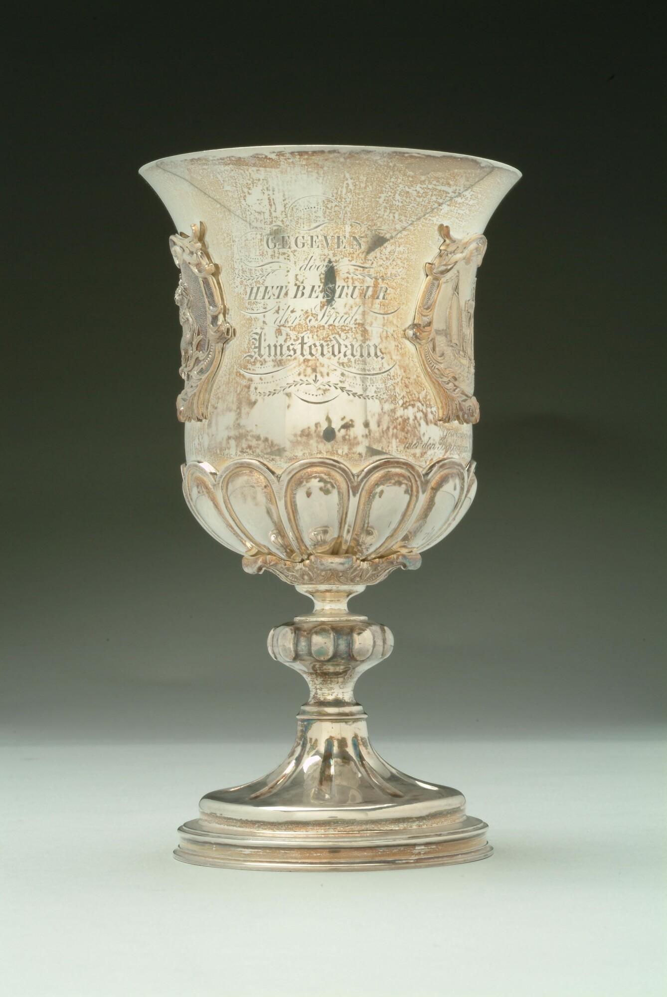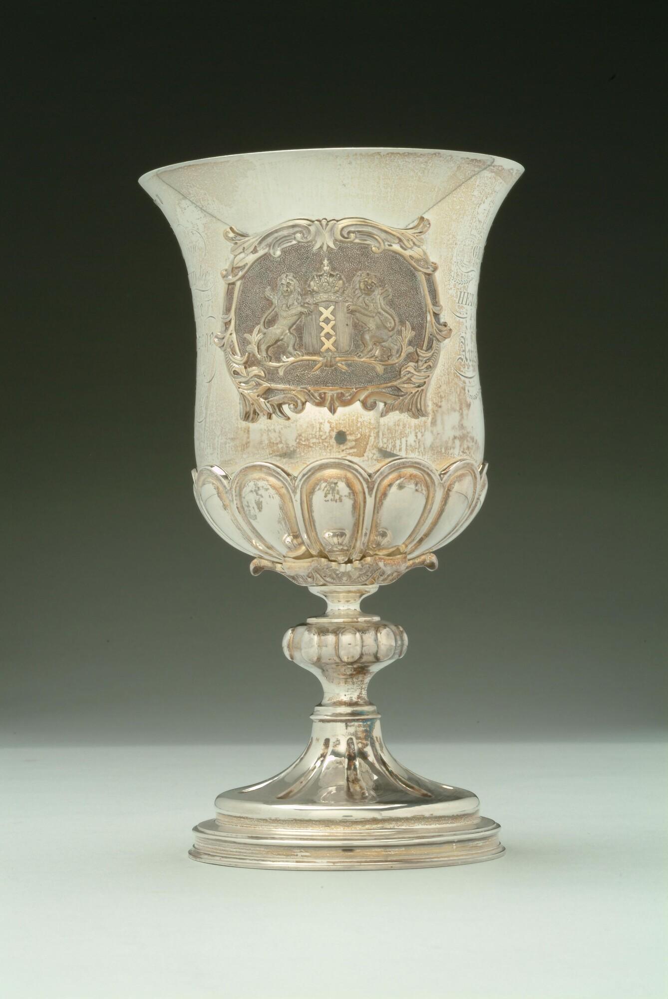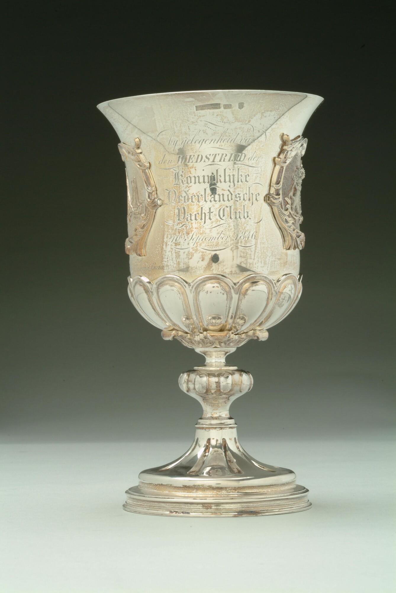 Zilveren prijsbeker, met appliek, wapen van Amsterdam en zeiljachten. Uitgereikt aan J.P. Carst na een wedstrijd van de Koninklijke Nederlandsche Yachtclub op 10 september 1846.