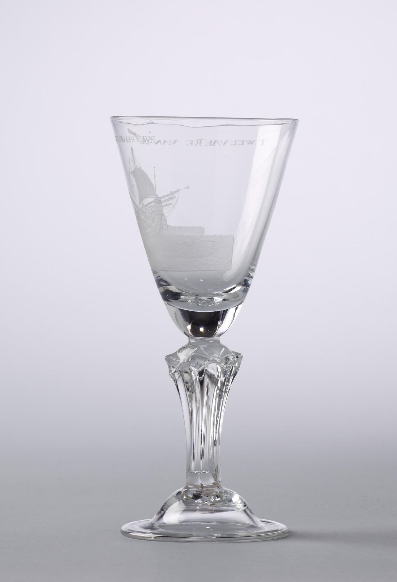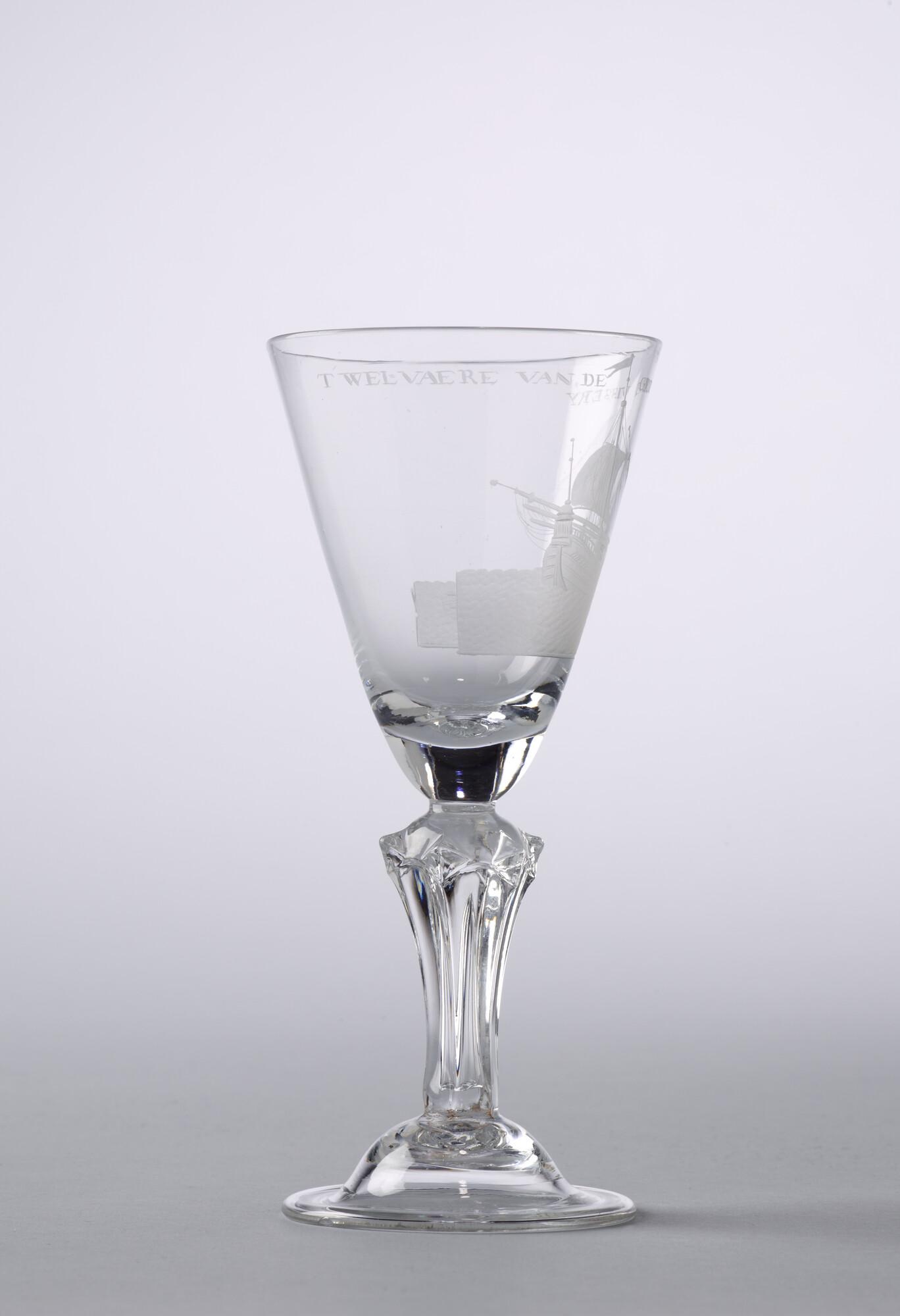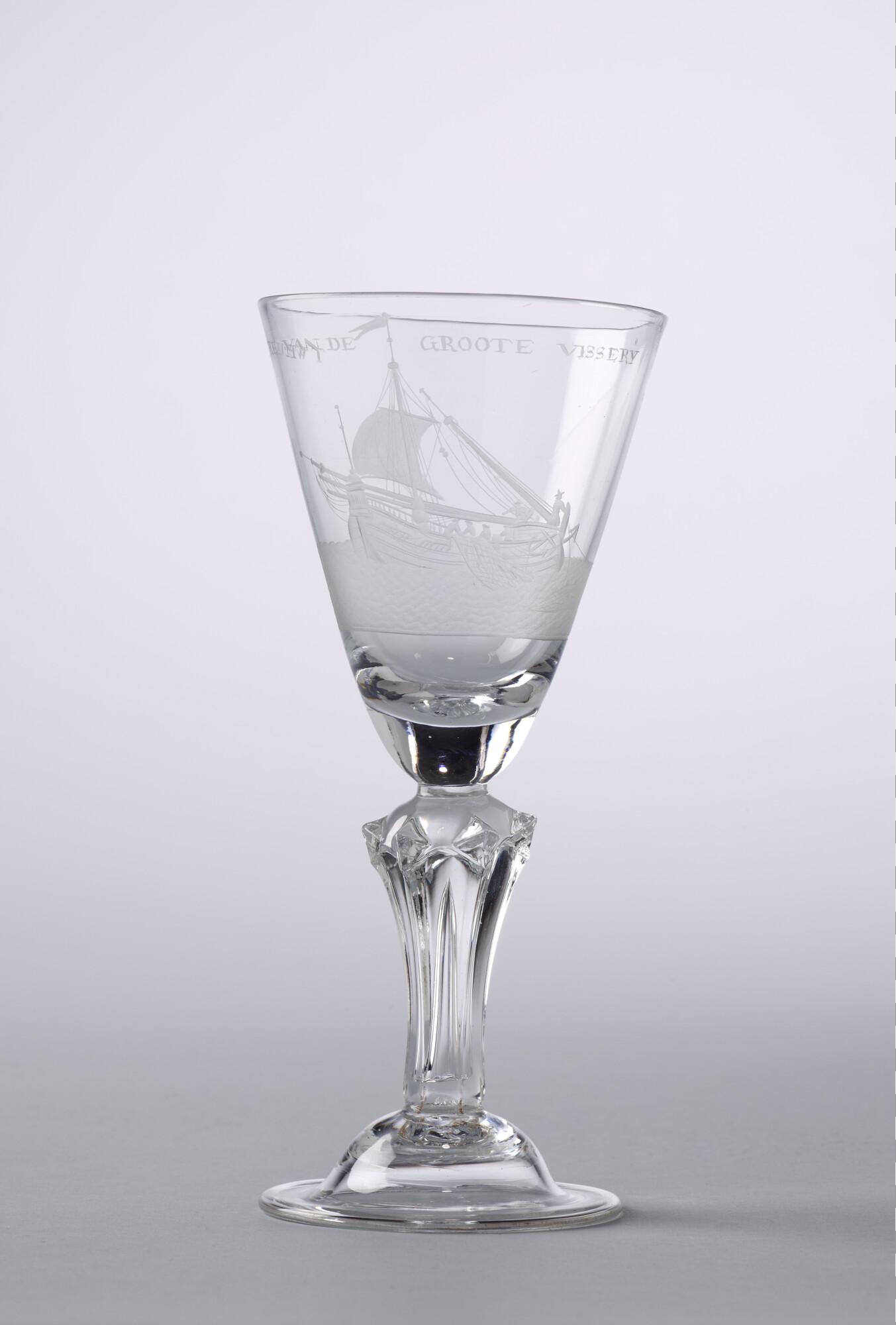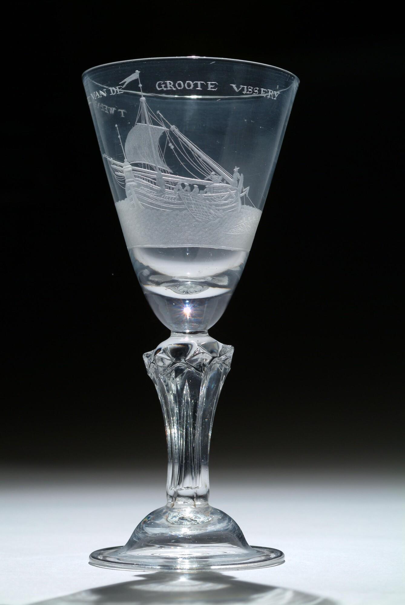 Kelkglas met een radgravure van een haringbuis die haar netten inhaalt en het opschrift "Welvaere van de Groote Visserij".