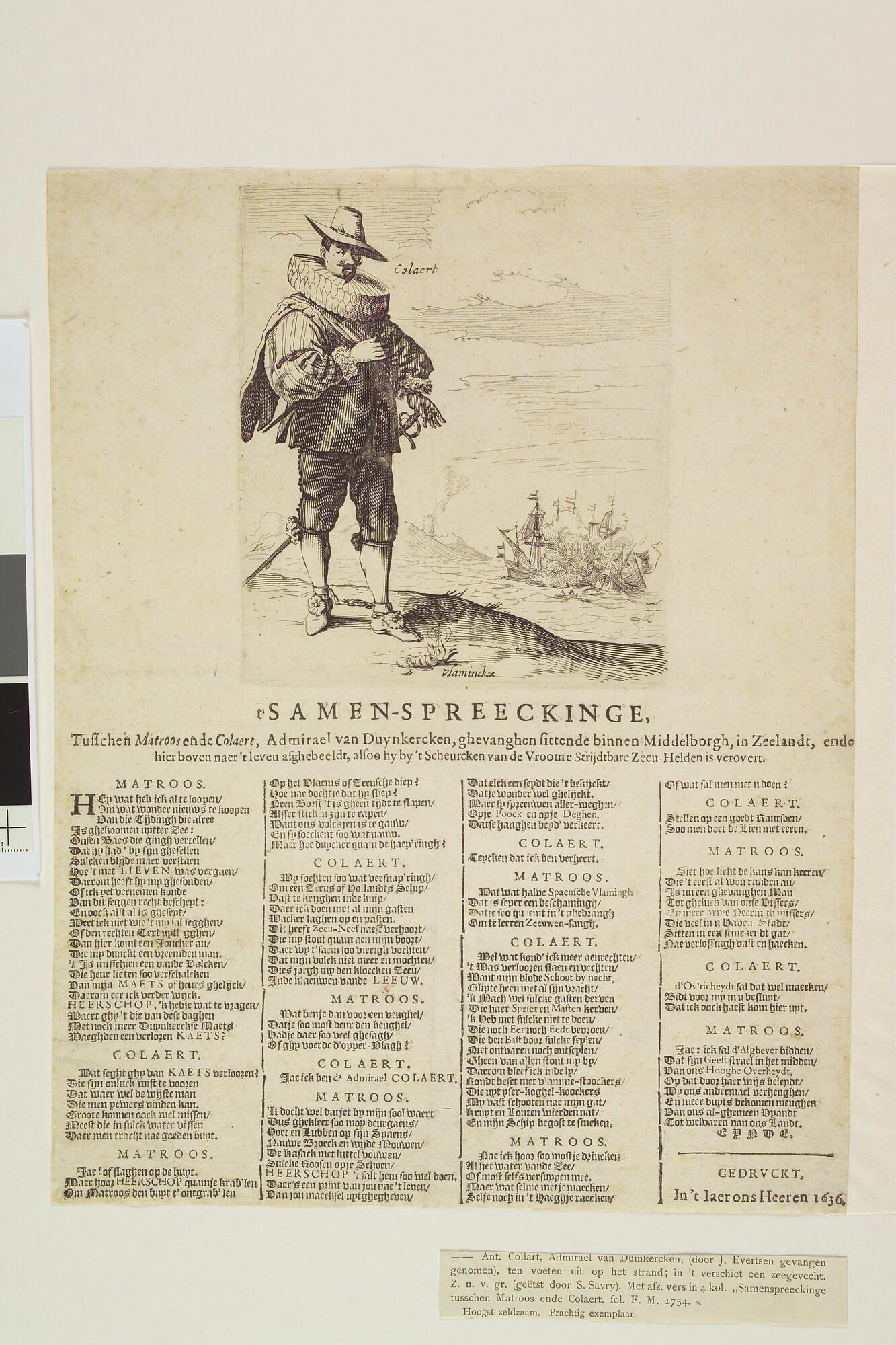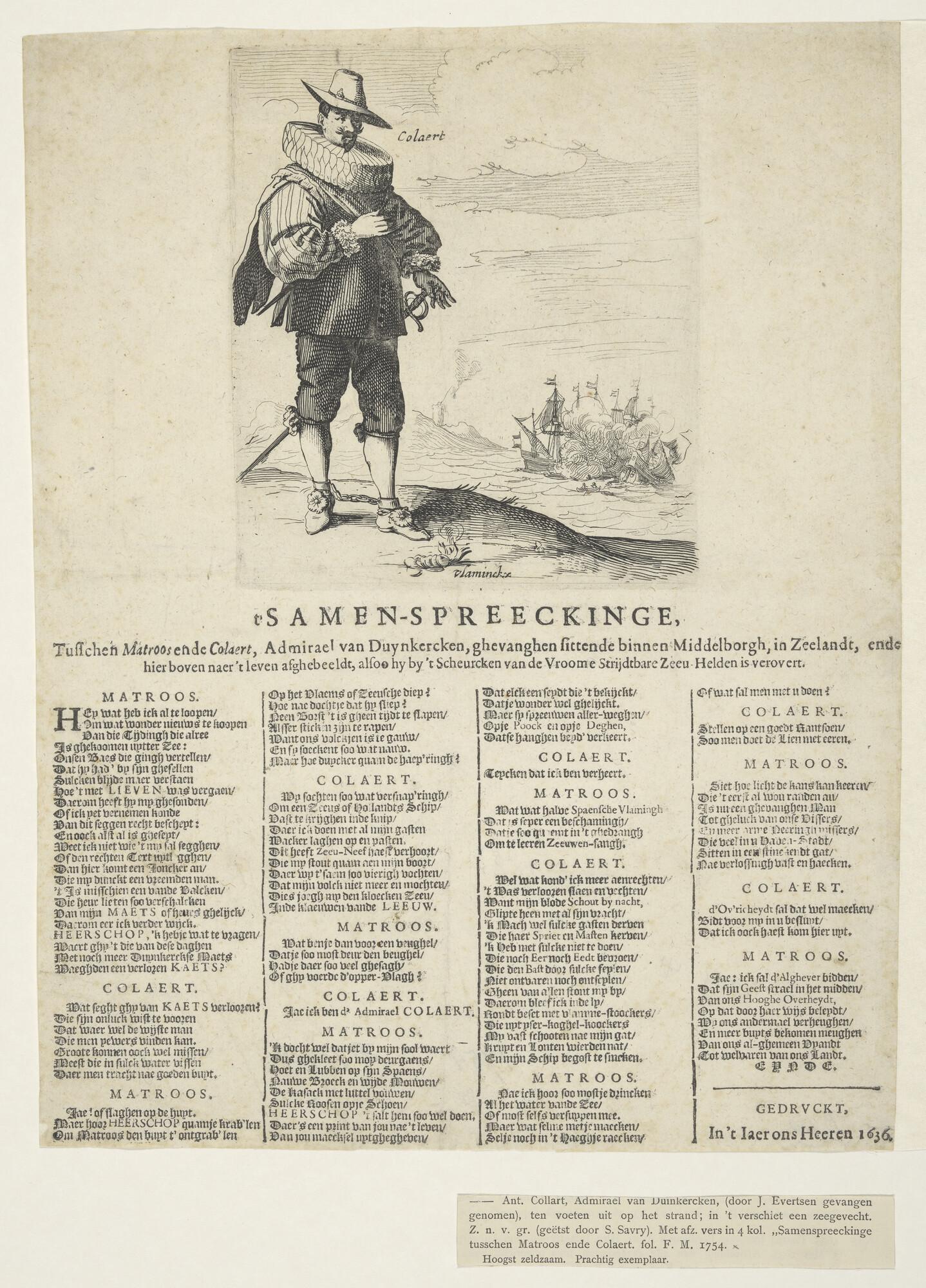 Spotprent op Collaart, Admiraal van Duinkerken, na een gevecht door Joan Evertsen gevangen genomen en naar Middelburg gebracht. Onder het portret ten voeten uit, een samenspraak tussen Colaert en een matroos.