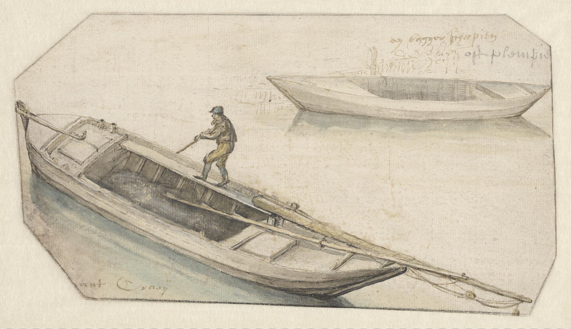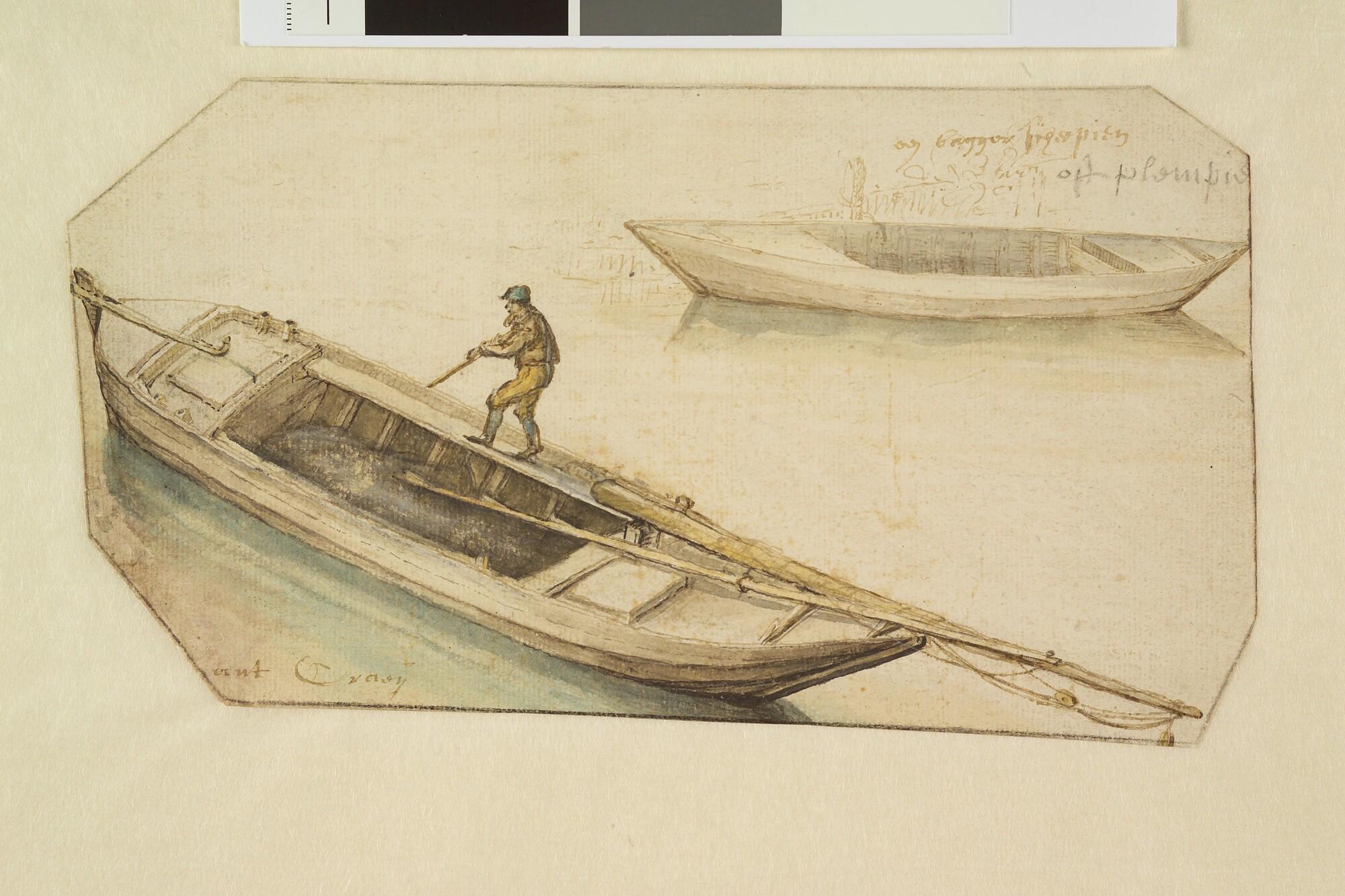 Twee baggerscheepjes of 'plempies'. Op de voorste een baggeraar met baggerbeugel.