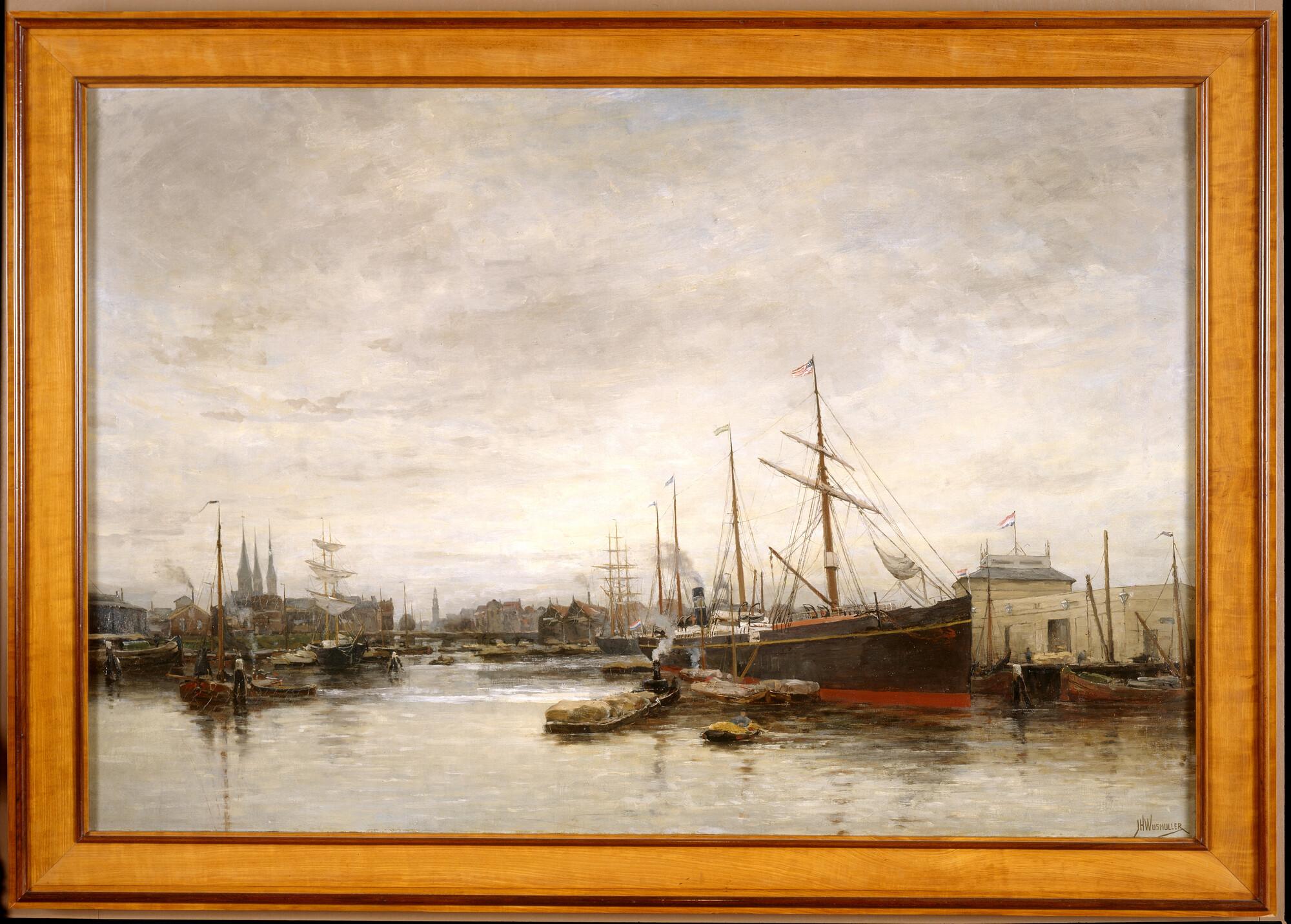 Het passagiersschip ss. Amsterdam II van de NASM ligt afgemeerd aan de Suez-steiger te Amsterdam, omstreeks 1890.