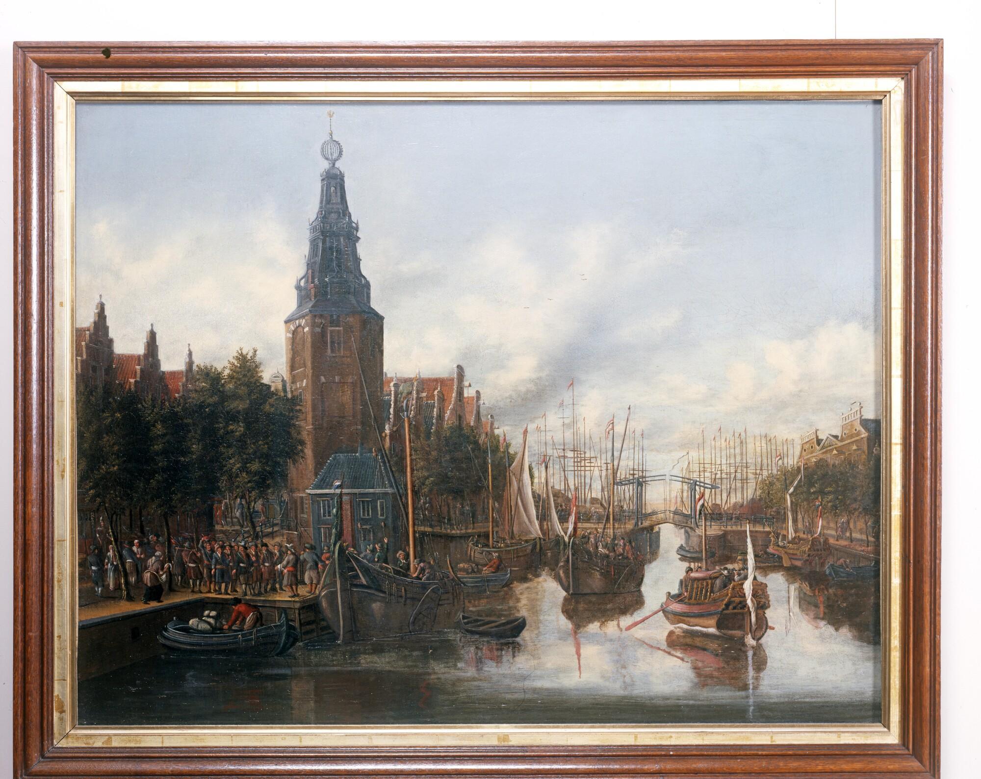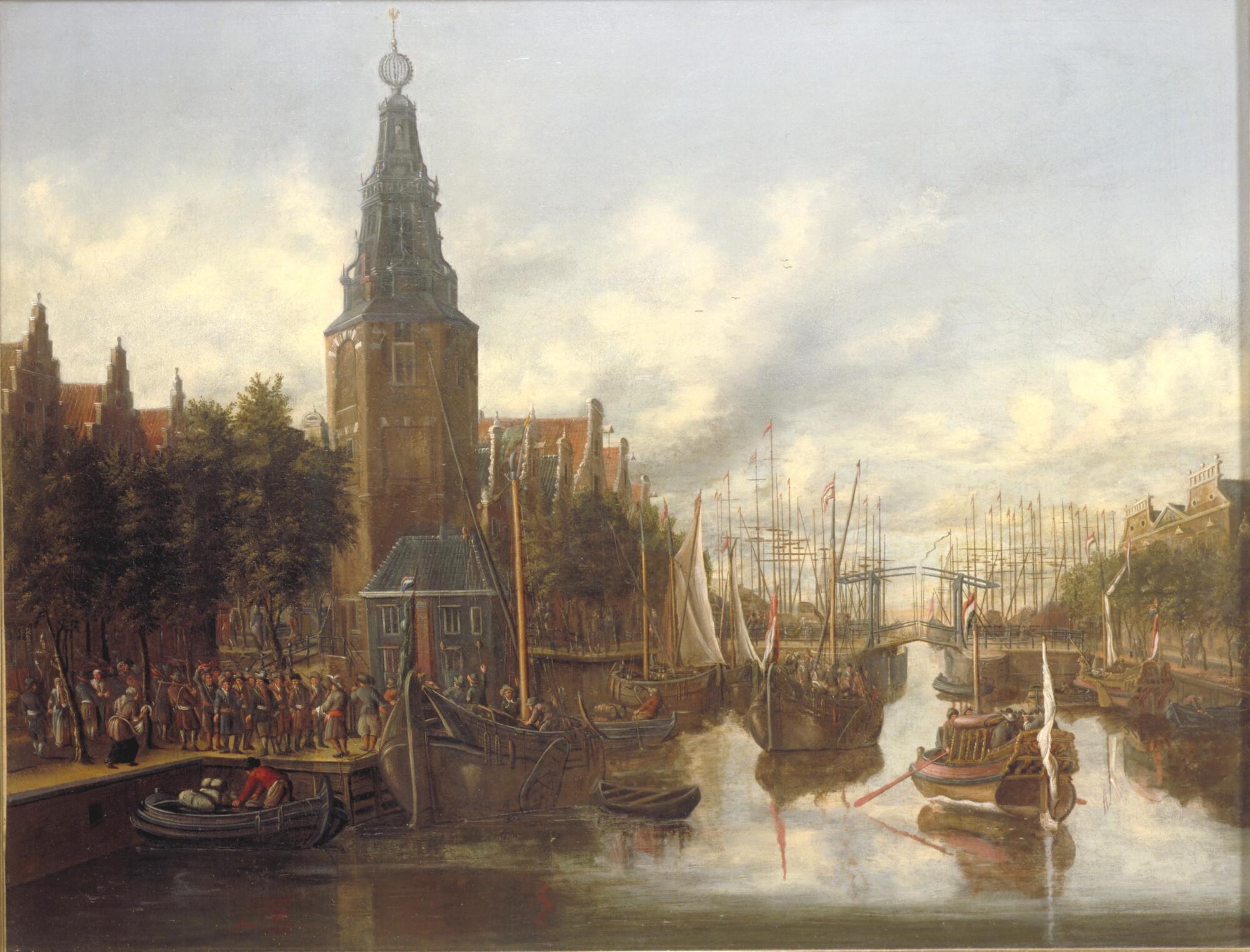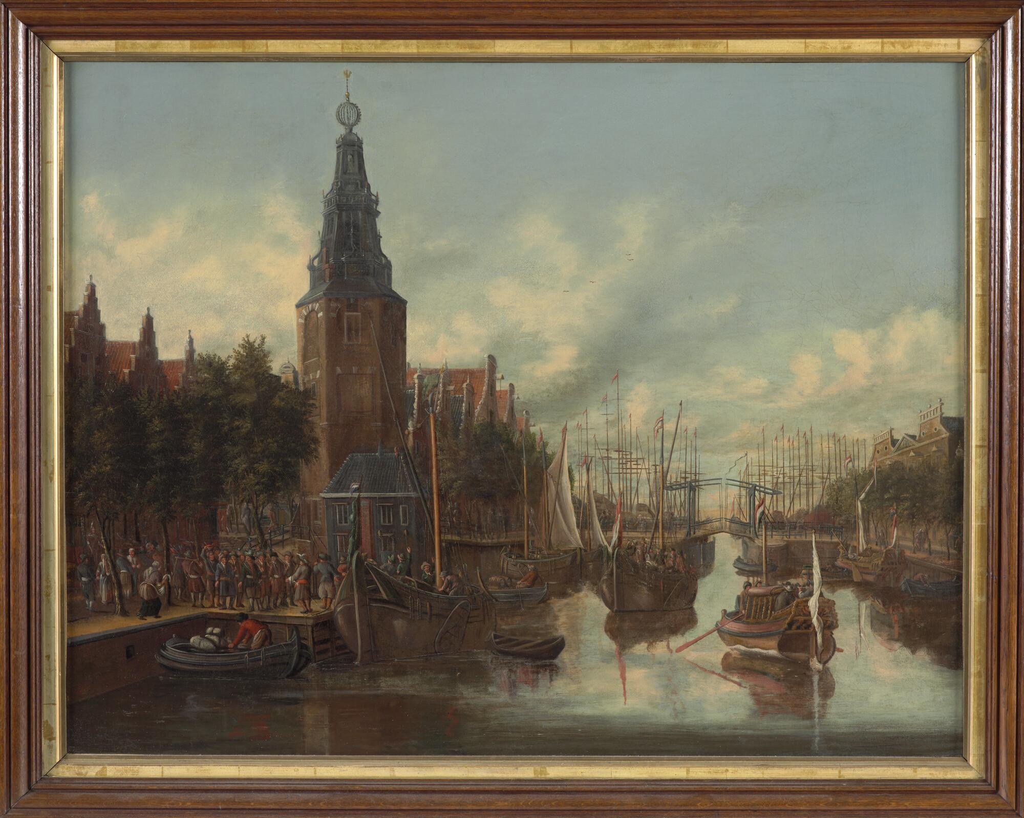 Schilderij in lijst van inscheping van soldaten bij de Montelbaanstoren, omstreeks 1690.