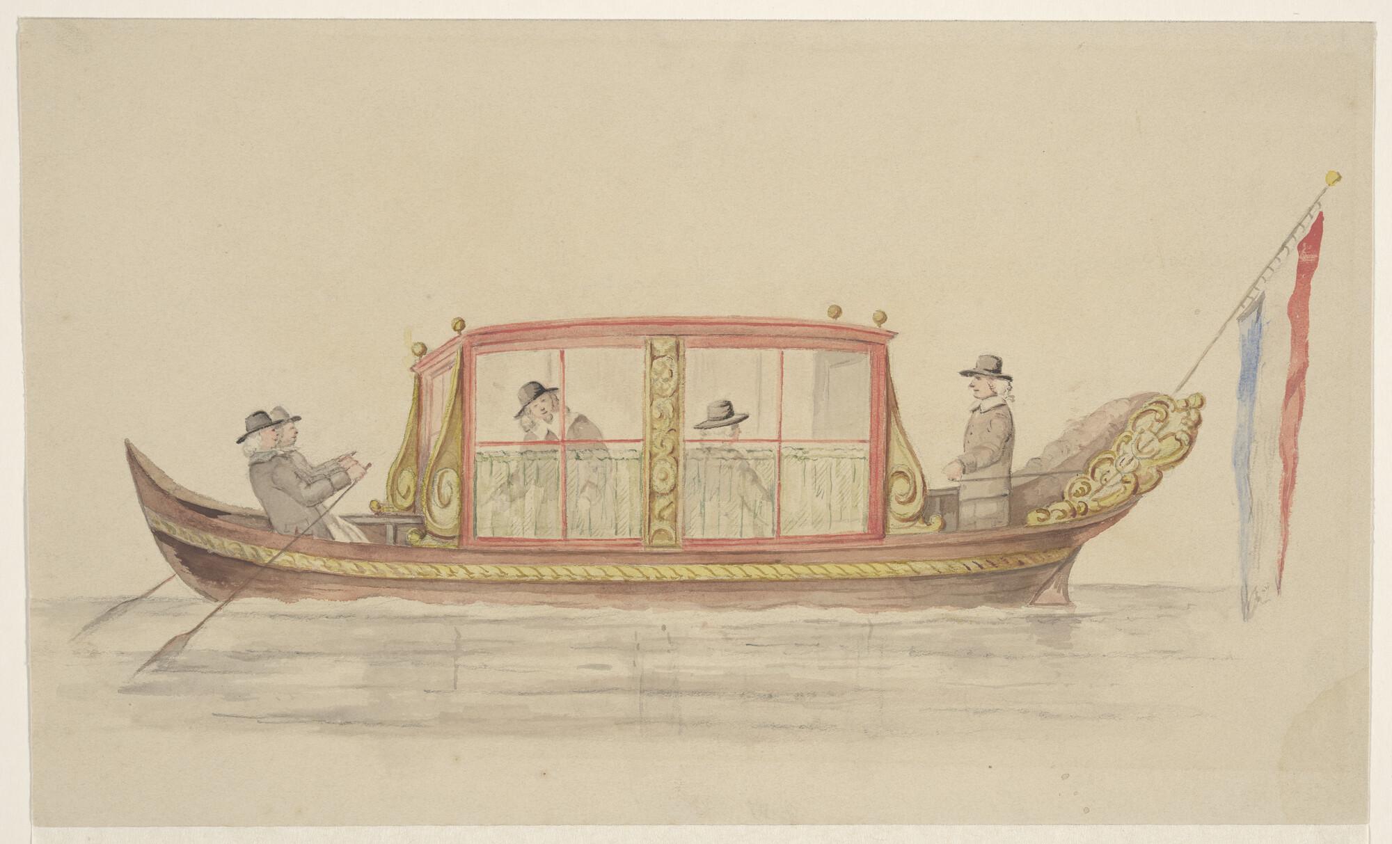 Een tentjacht, geroeid door twee roeiers, met een aantal heren aan boord
