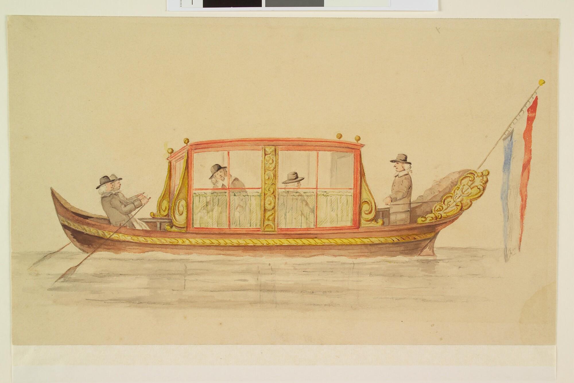Een tentjacht, geroeid door twee roeiers, met een aantal heren aan boord.