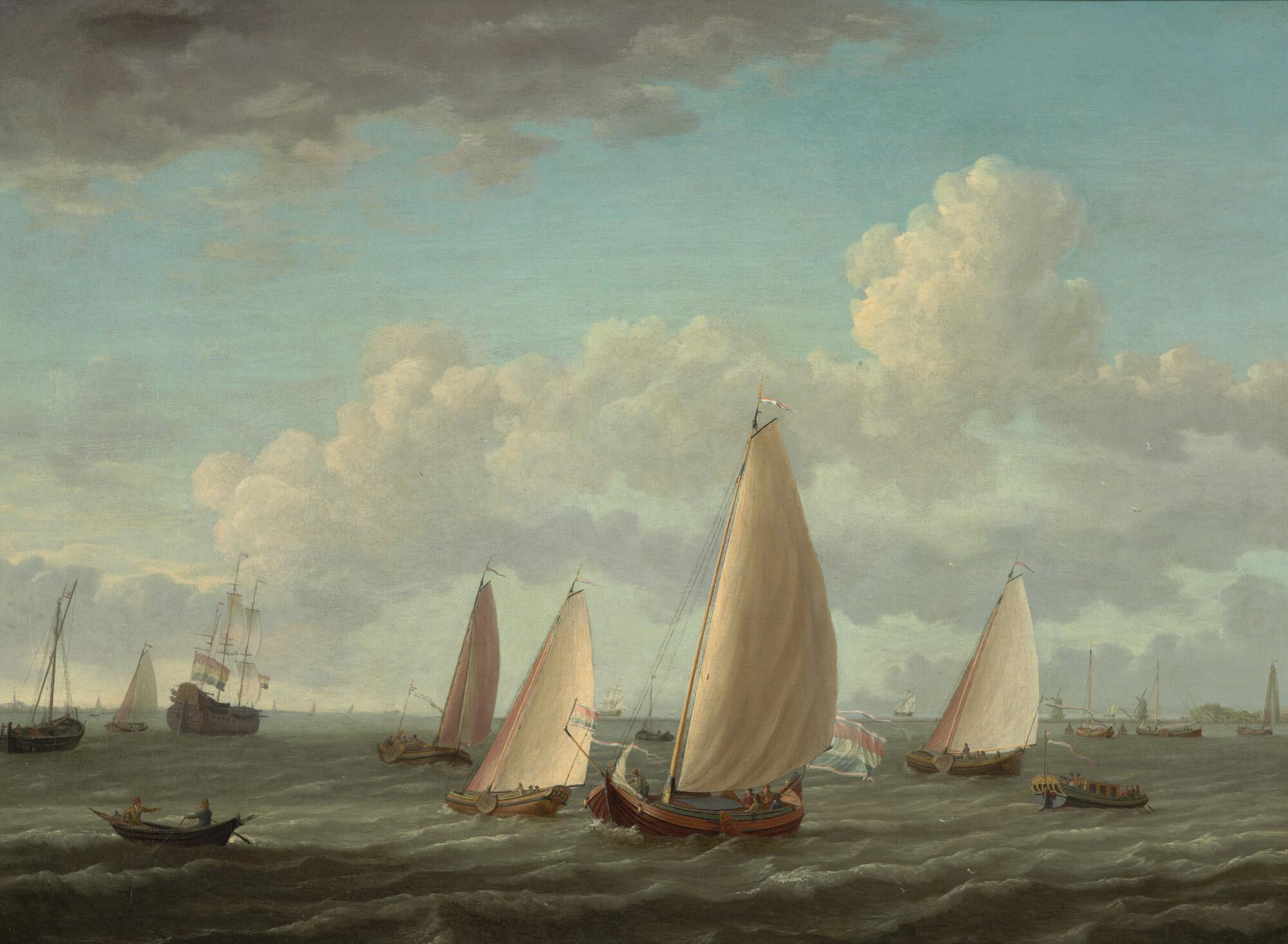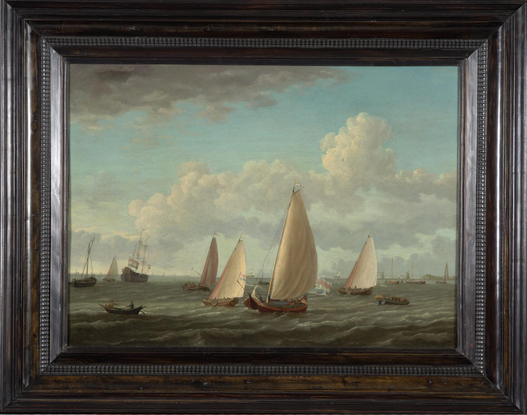 Schilderij in lijst van een gezicht op het IJ in westelijke richting met verschillende zeilschepen en roeiboten.