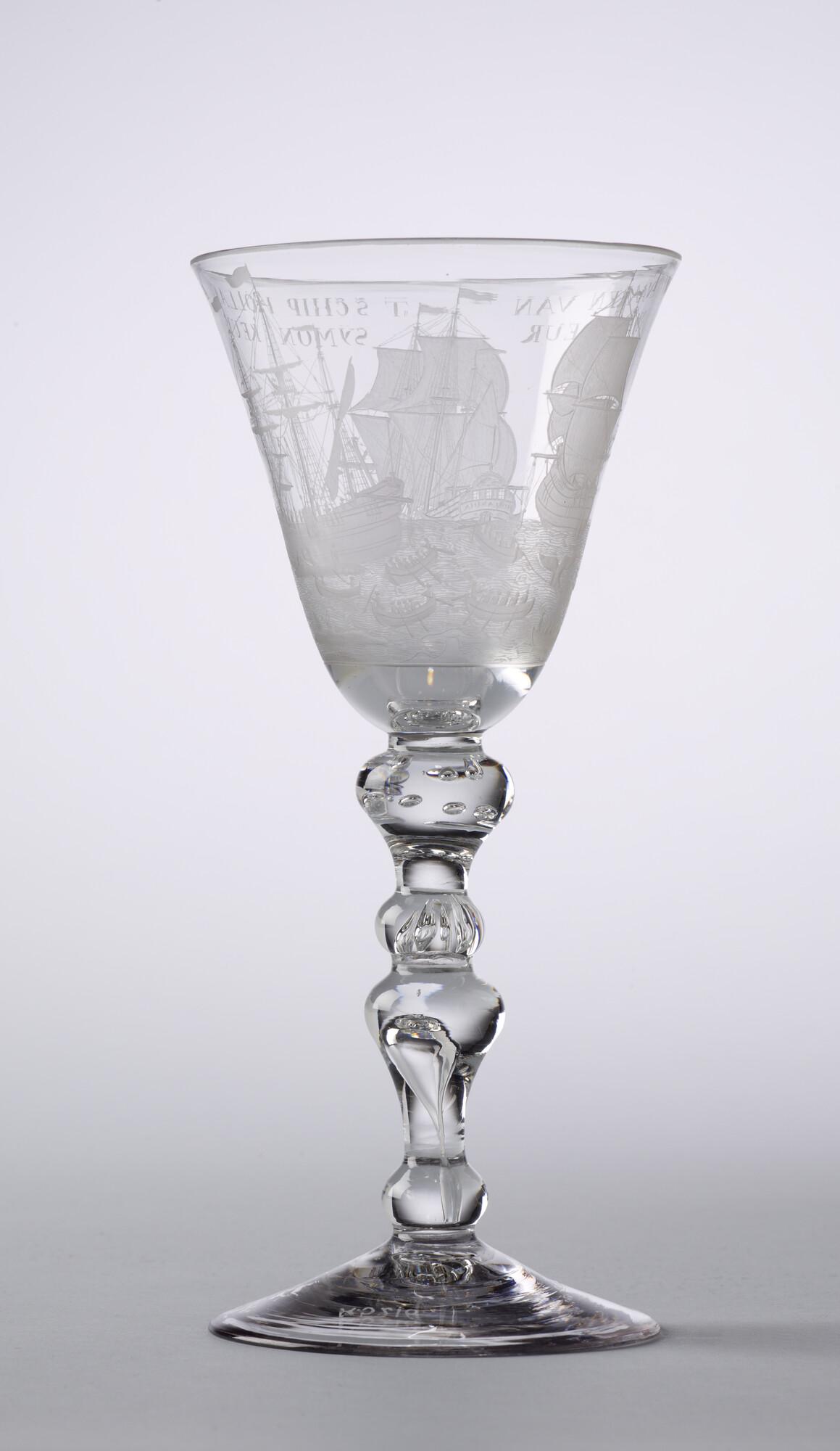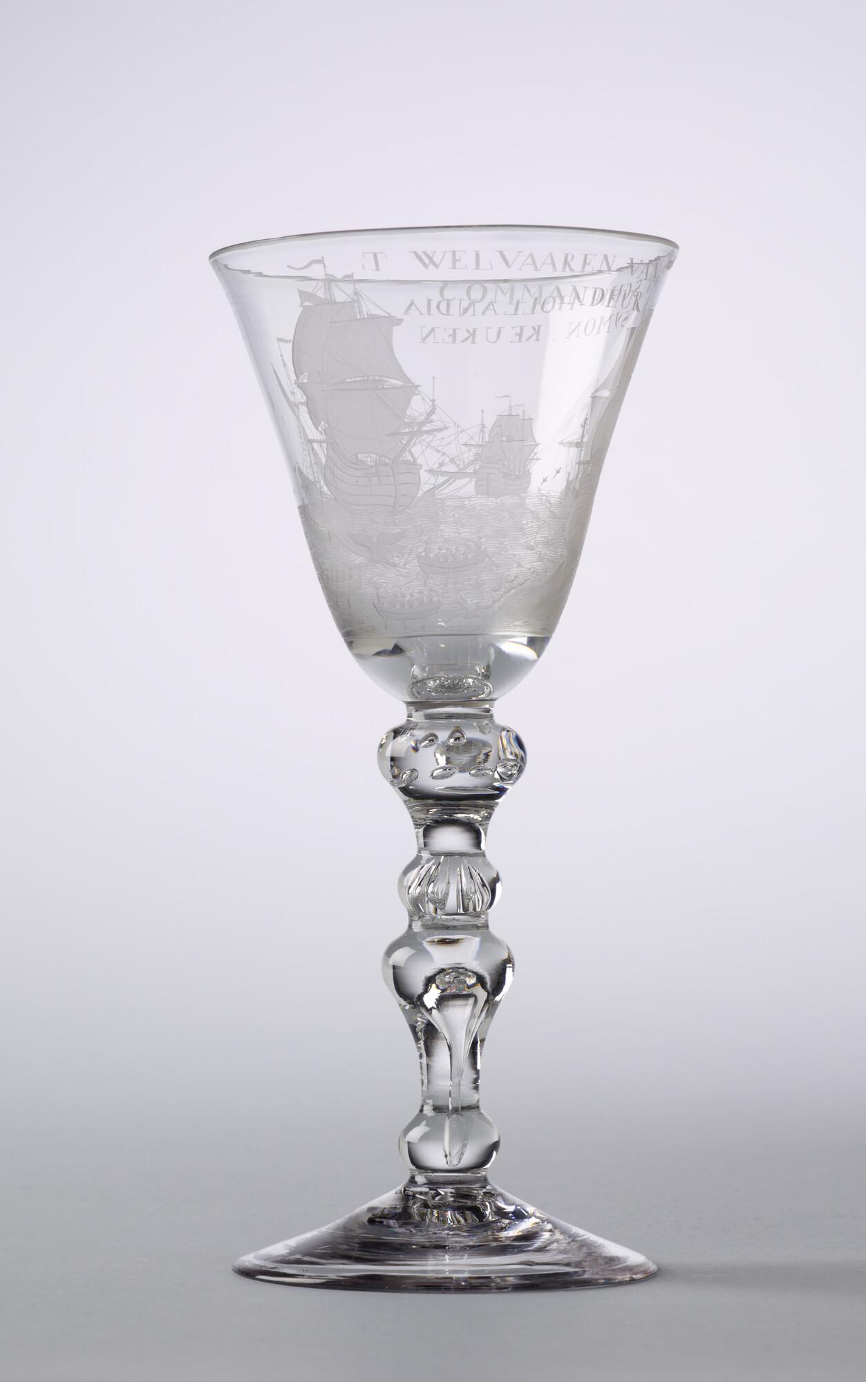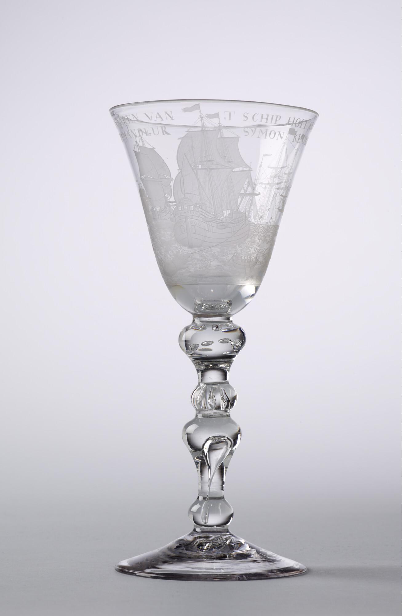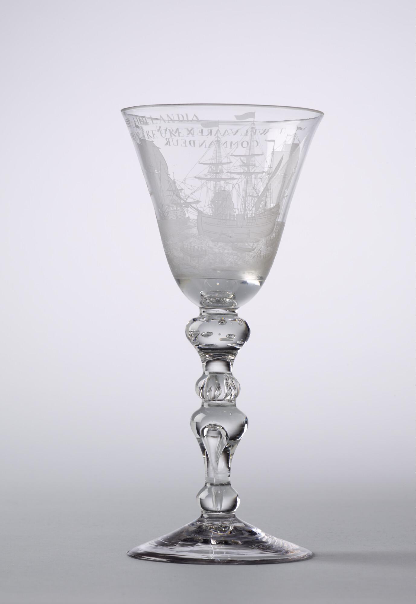 Bokaal met een radgravure van de walvisvaart en het opschrift "het welvaaren van 't schip Hollandia"