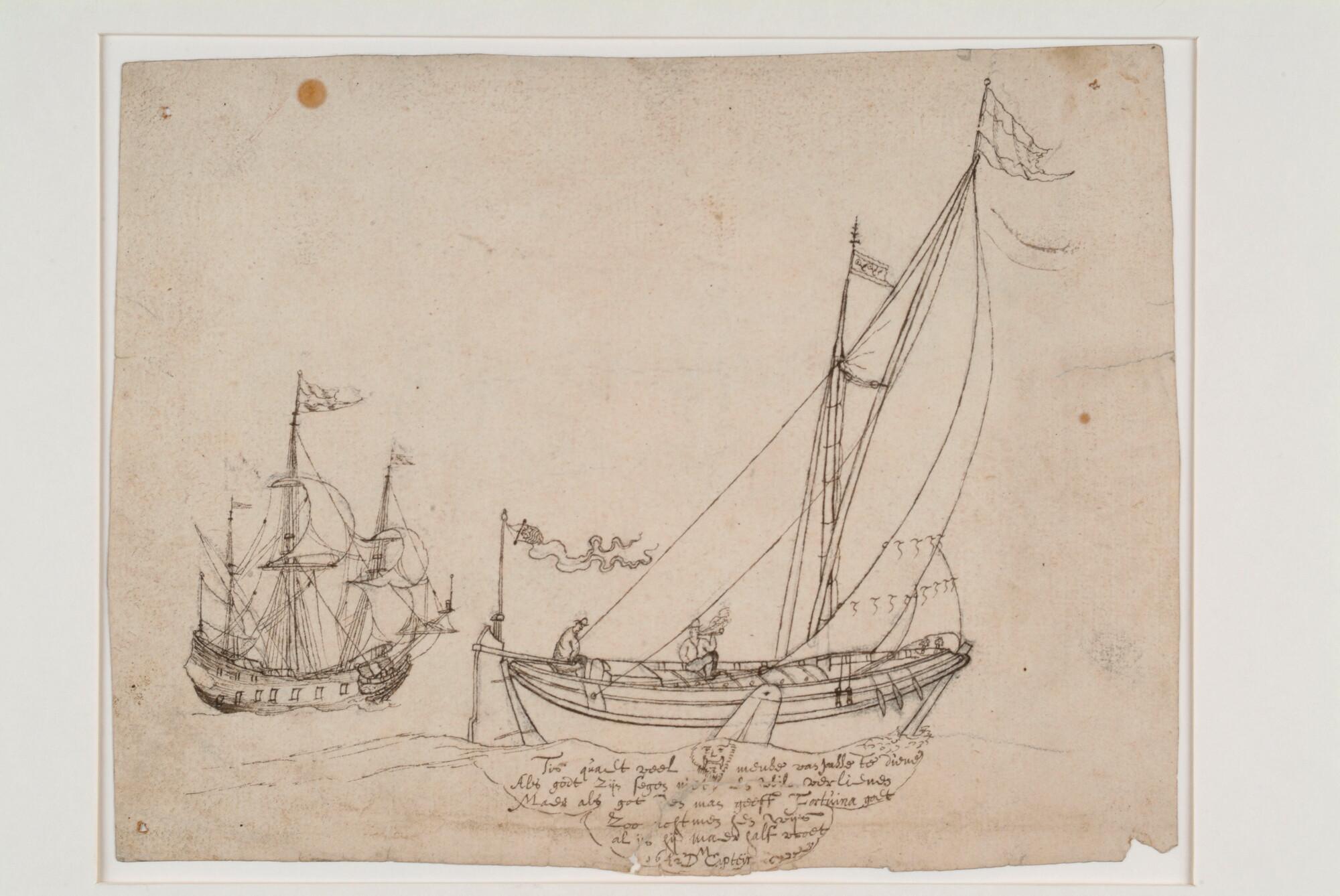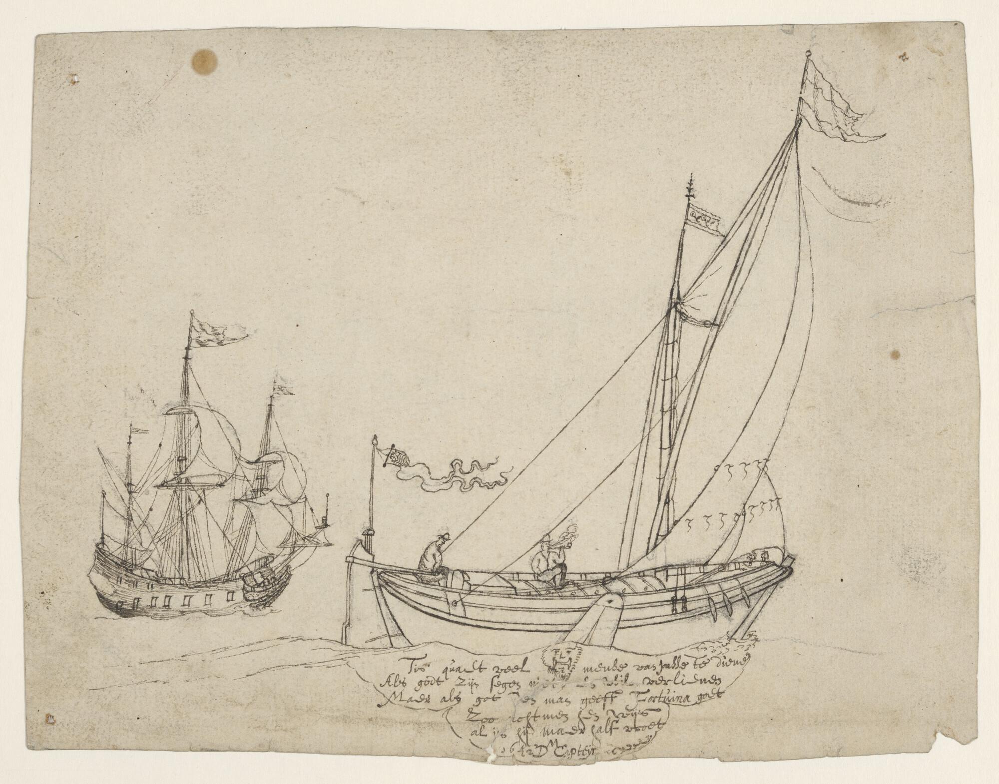 Een vrachtkaag, met daarop twee figuren, waarvan er één een pijp rookt. Op het roer een vlaggestok met een wimpel met het Zeeuwse wapen, aan de mast een vlag met drie banen en twee oranjeappels (?) in de middelste baan.