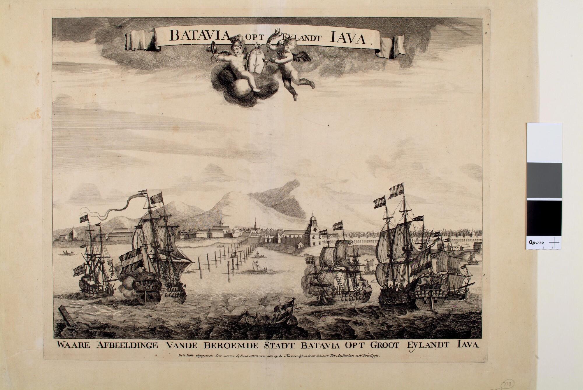 Gezicht op Batavia met op de rede vijf Nederlandse schepen.