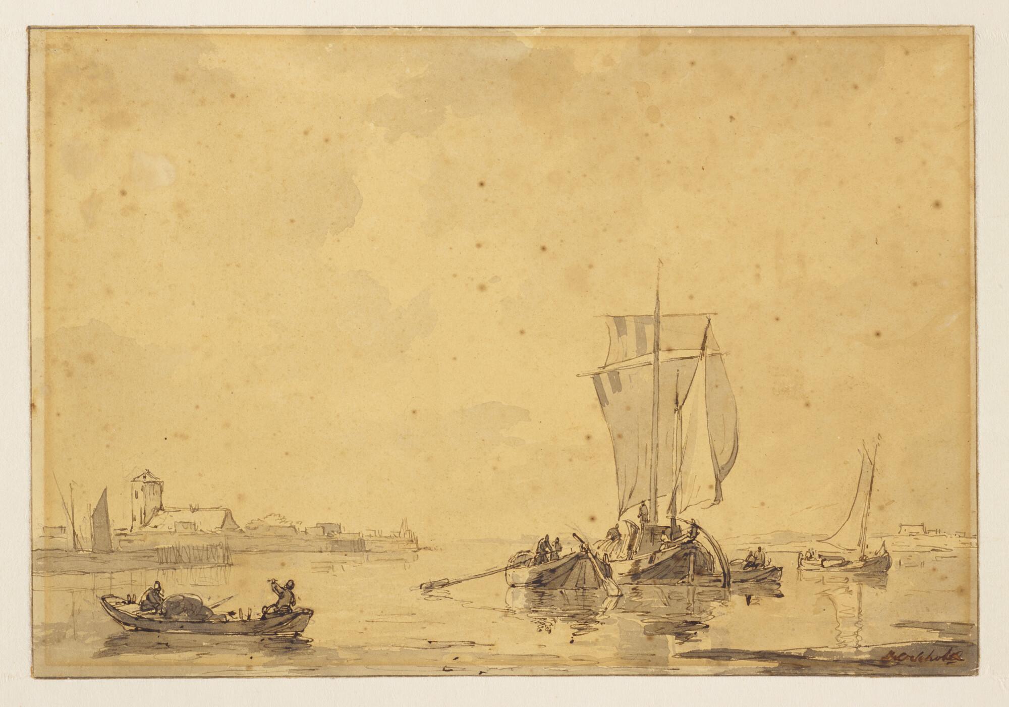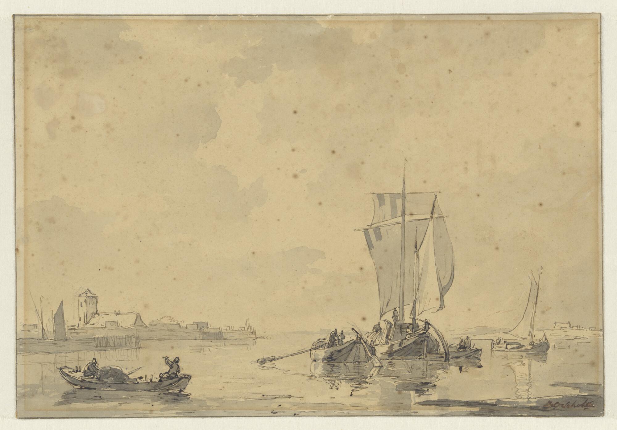 Een samoreus en andere binnenvaartschepen bij een stadje aan een rivier