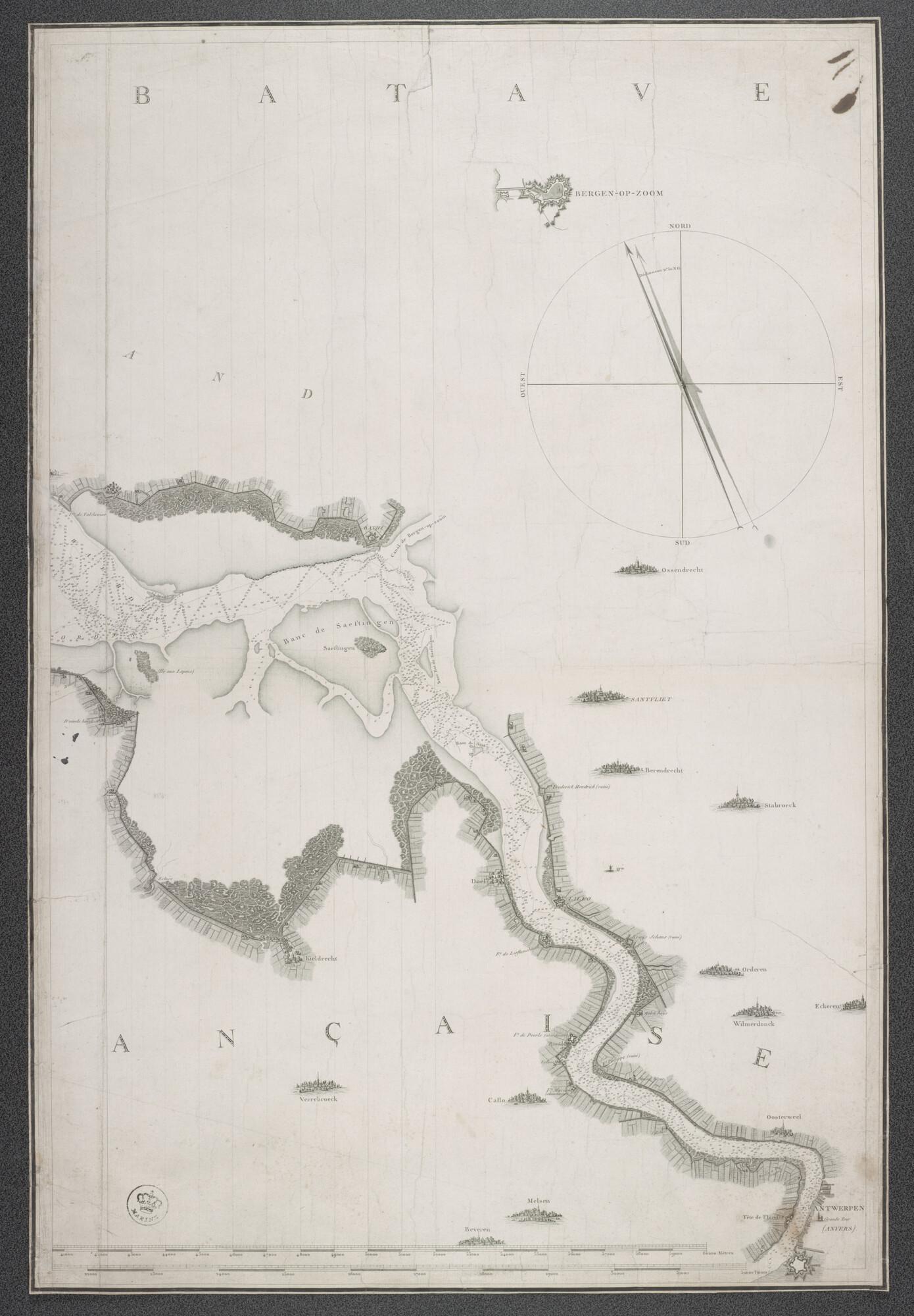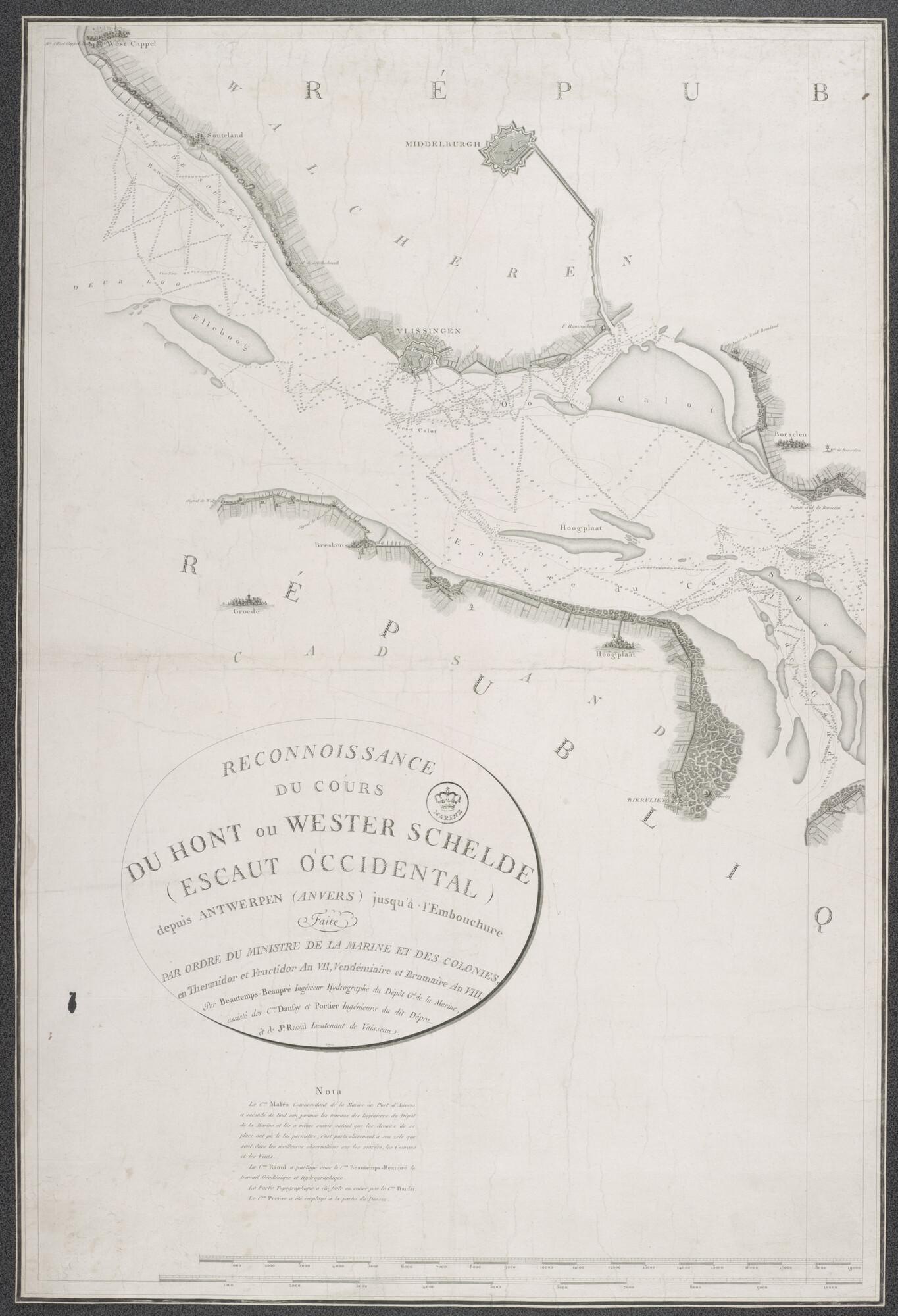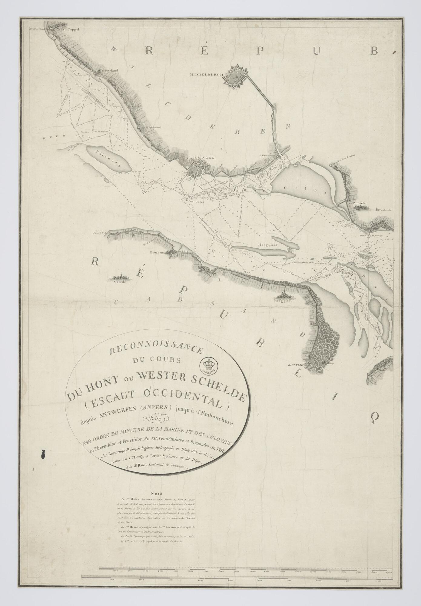 Kaart in drie delen van de Schelde, opgenomen door C-F. Beautemps-Beaupré (1766-1854), P. Daussy (1792-1860), Portier & A.M.A. Raoul (1769-1843), tekenaar J.P. Besançon (werkzaam 1798-1835), gegraveerd door E. Collin (werkzaam 1798-1829) en Le Roy. De opname van de kaart is uitgevoerd in 1799.