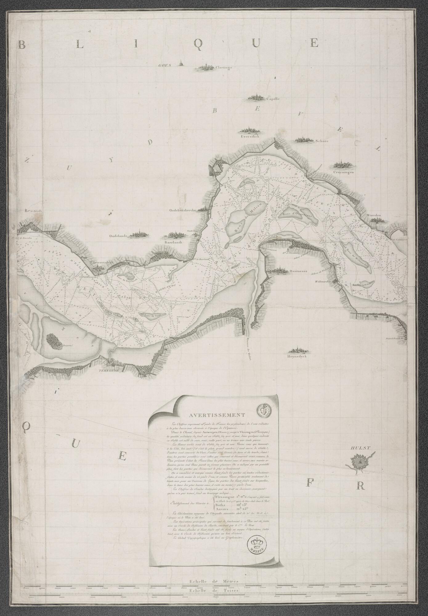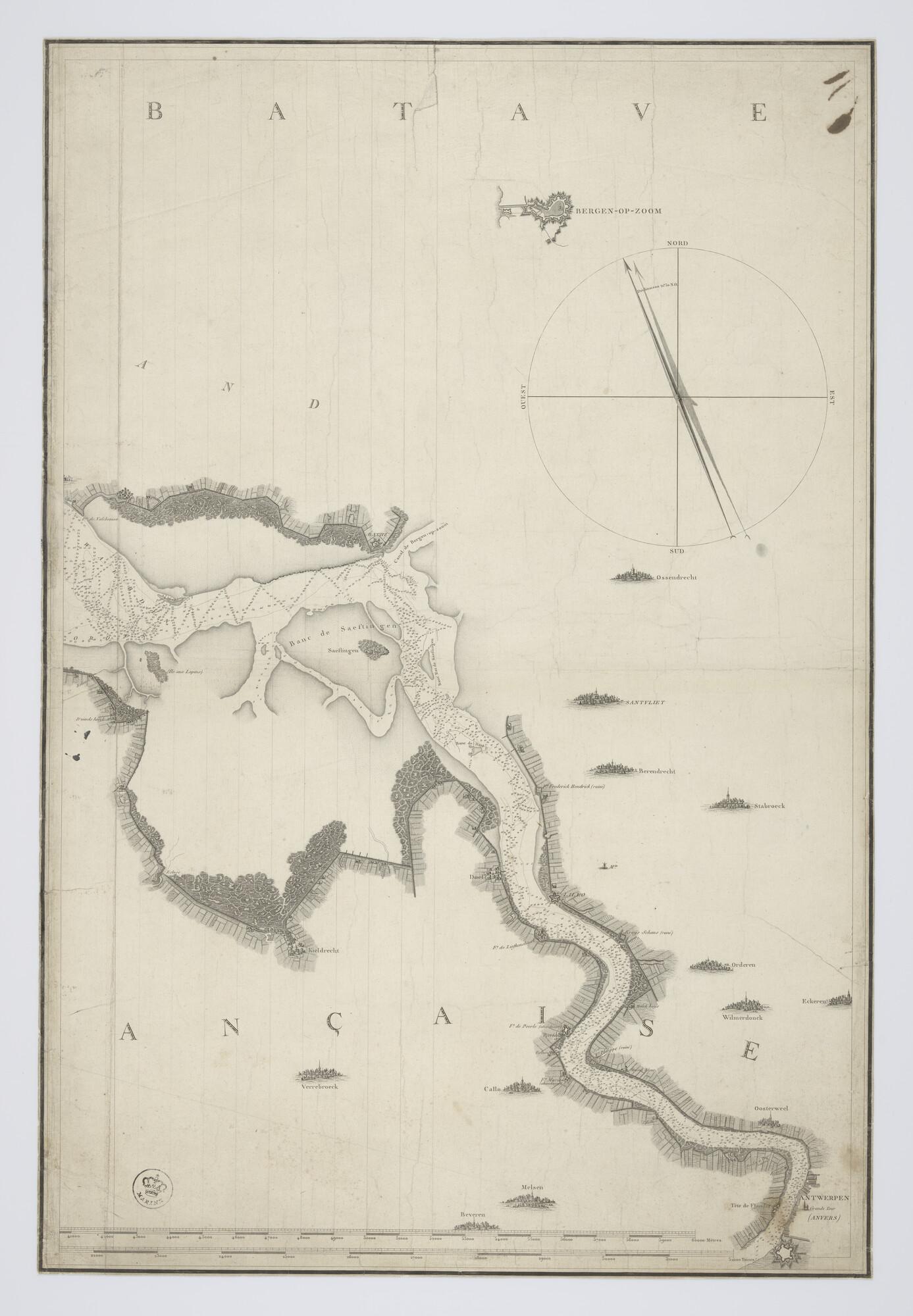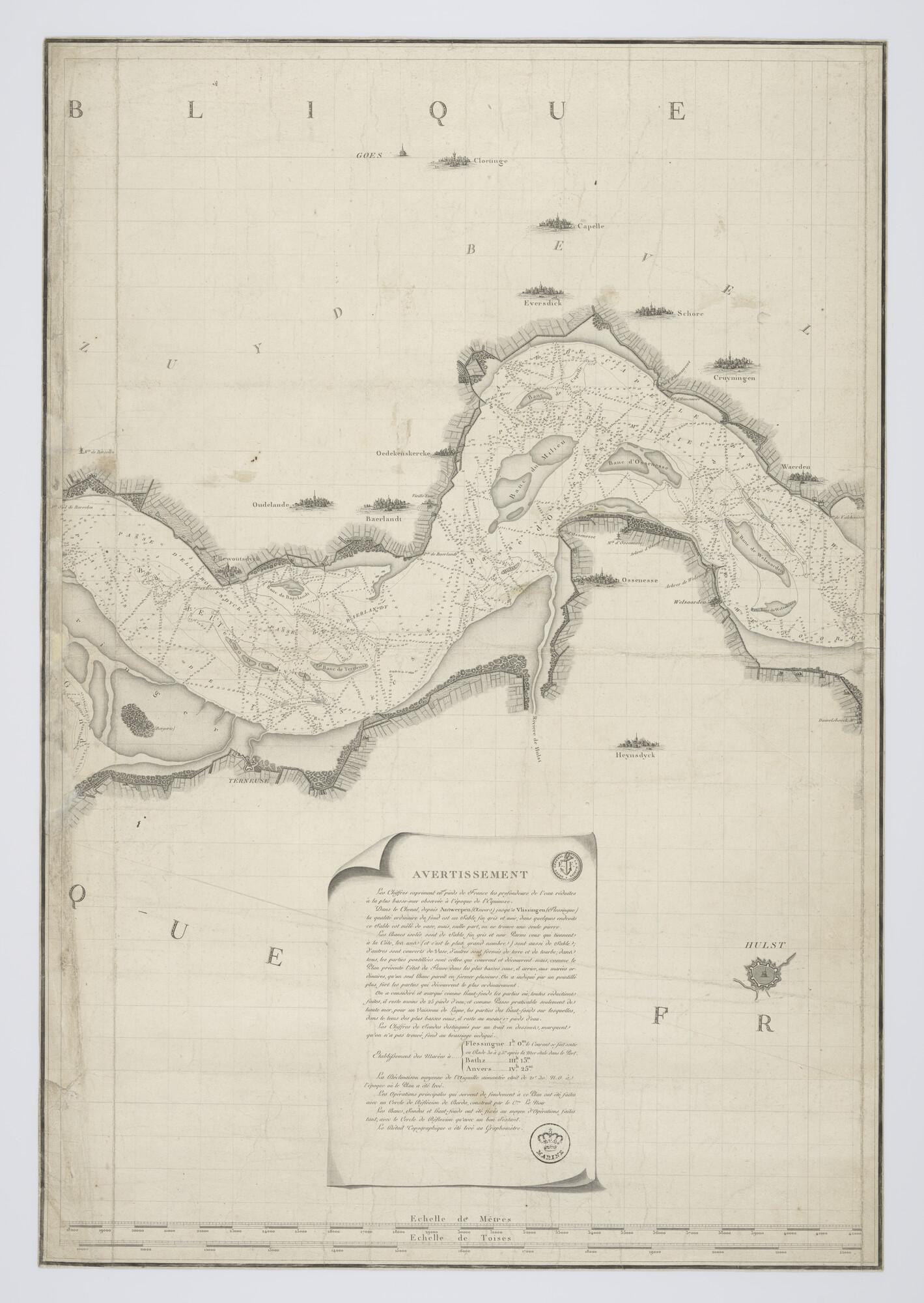 Kaart in drie delen van de Schelde, opgenomen door C-F. Beautemps-Beaupré (1766-1854), P. Daussy (1792-1860), Portier & A.M.A. Raoul (1769-1843), tekenaar J.P. Besançon (werkzaam 1798-1835), gegraveerd door E. Collin (werkzaam 1798-1829) en Le Roy. De opname van de kaart is uitgevoerd in 1799.