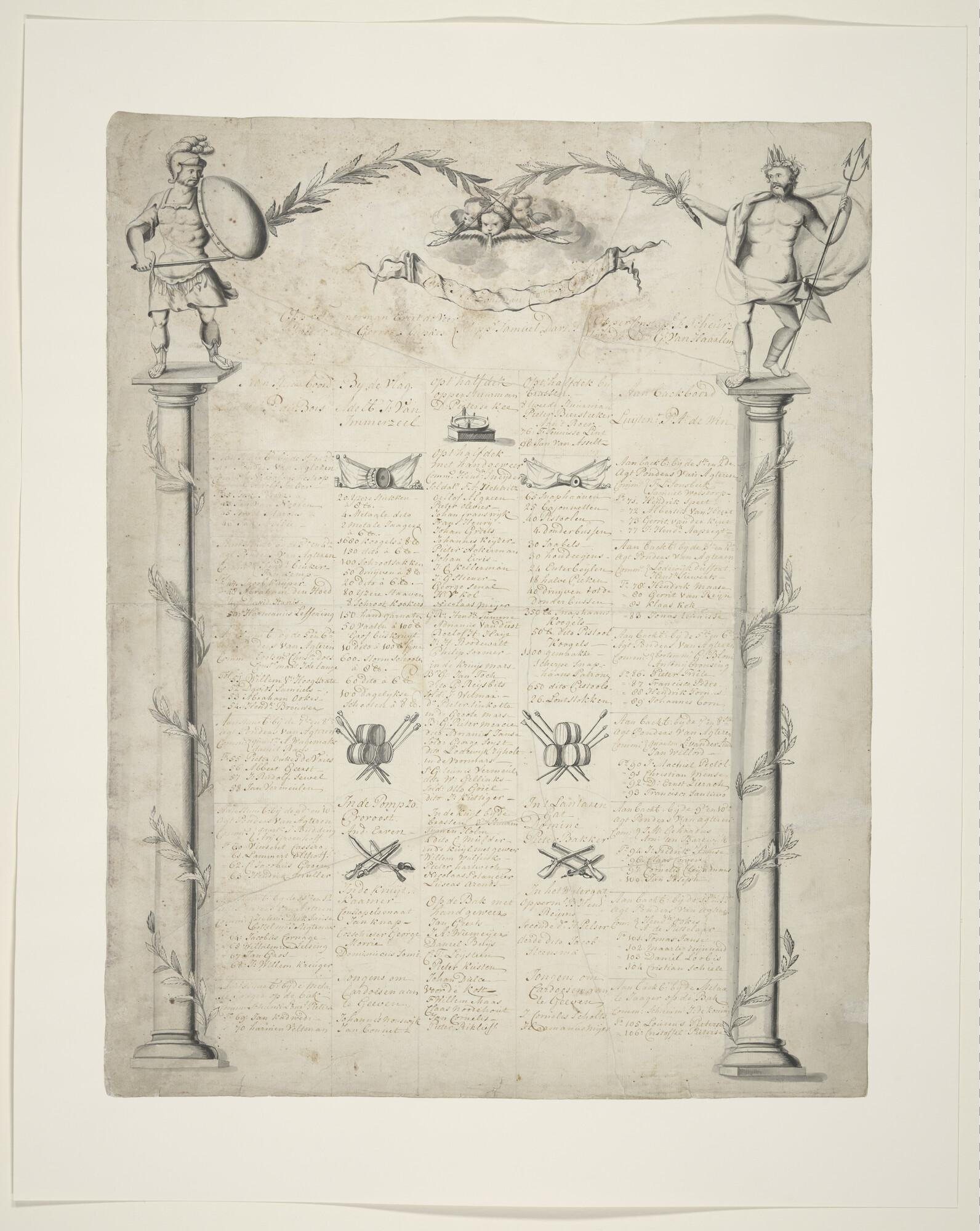 Geschutsrol van het fregat "Weststellingwerf", 5 kolommen tekst tussen twee zuilen, waarop links een krijgsman en rechts Neptunis en diverse decoraties tussen de tekst.