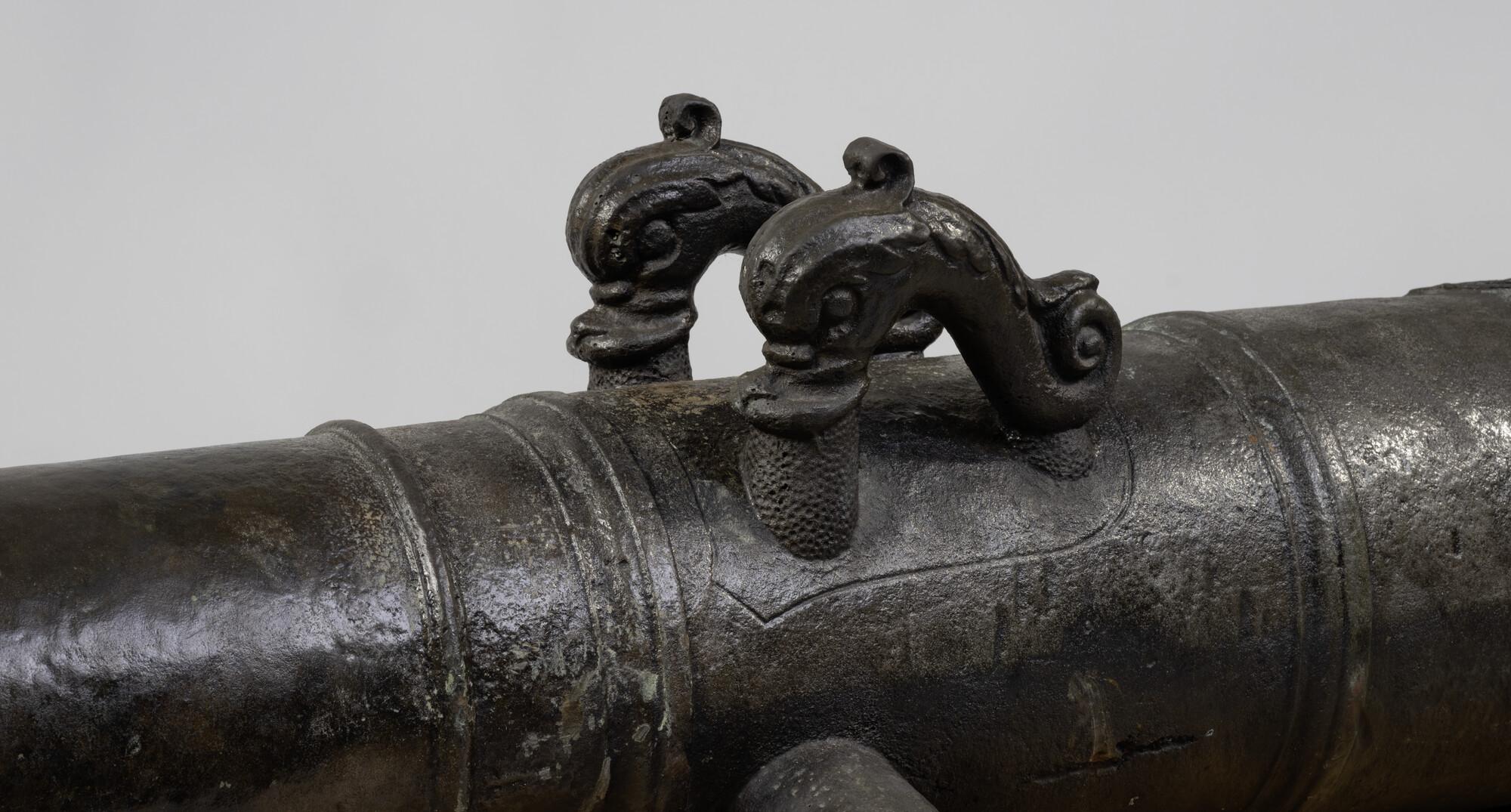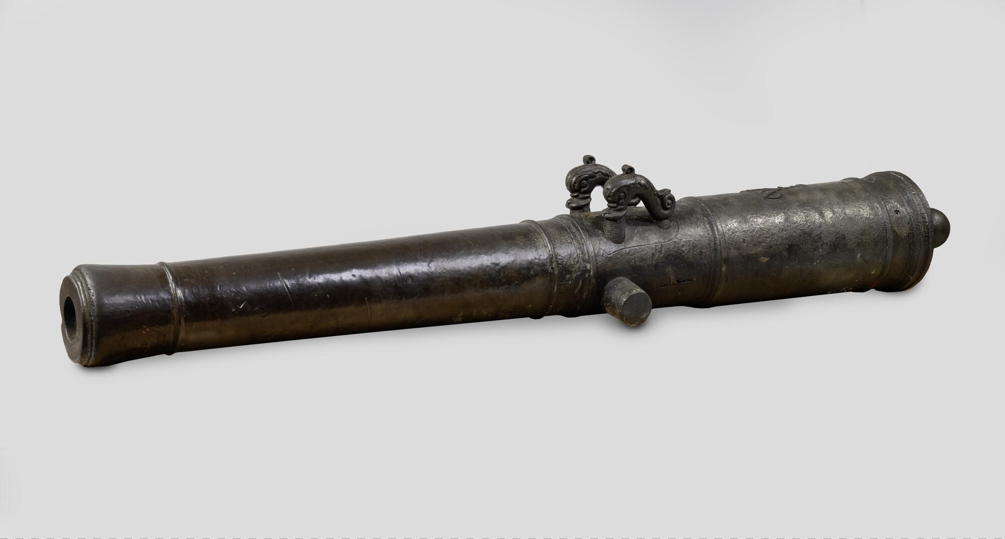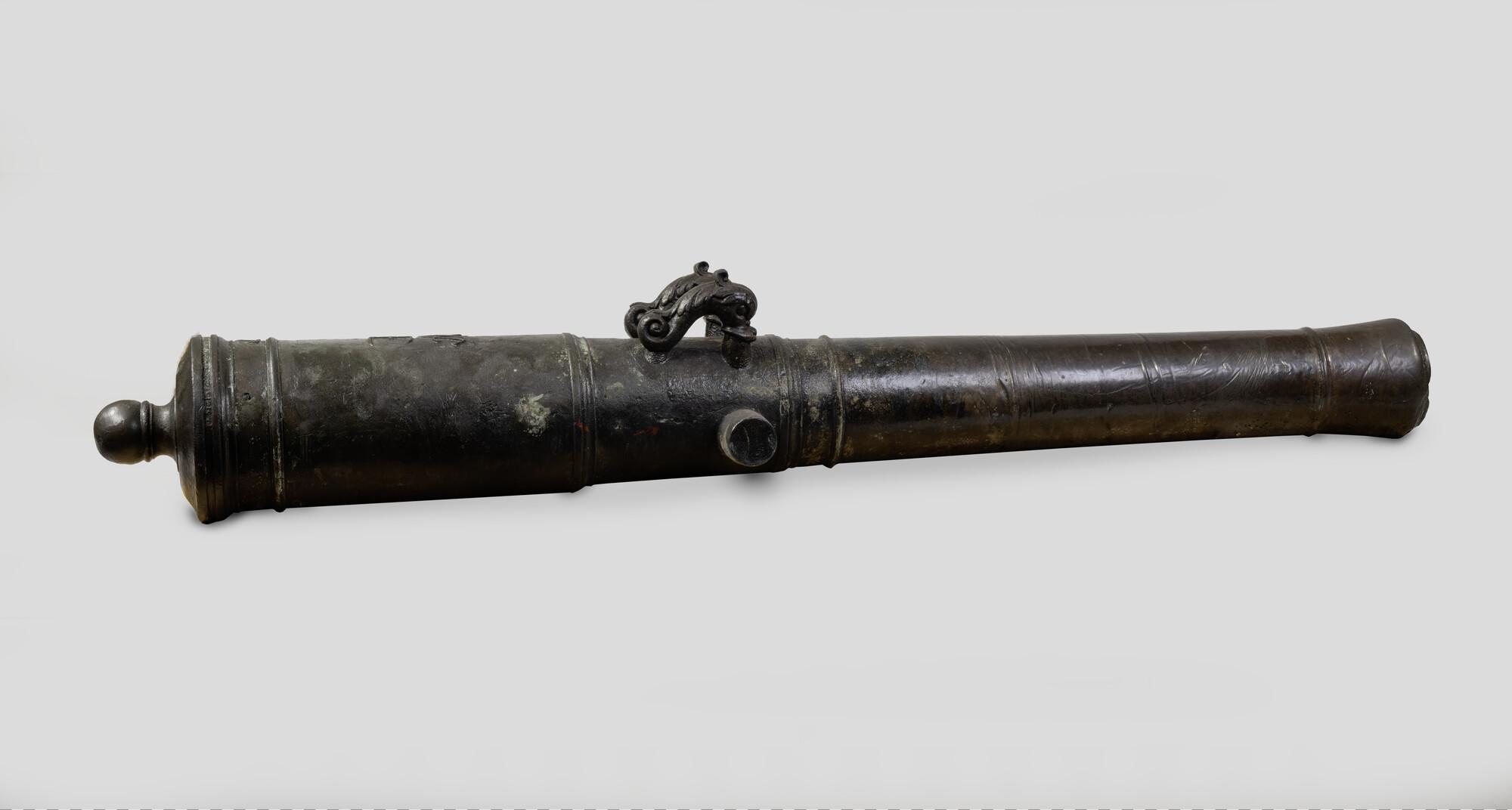 Bronzen kanon, geboord voor 6-ponds kogels, in 1715 gegoten voor de kamer Enkhuizen van de VOC, geborgen uit het VOC-schip "'T Vliegend Hart", dat in 1735 bij Zeeland verging.