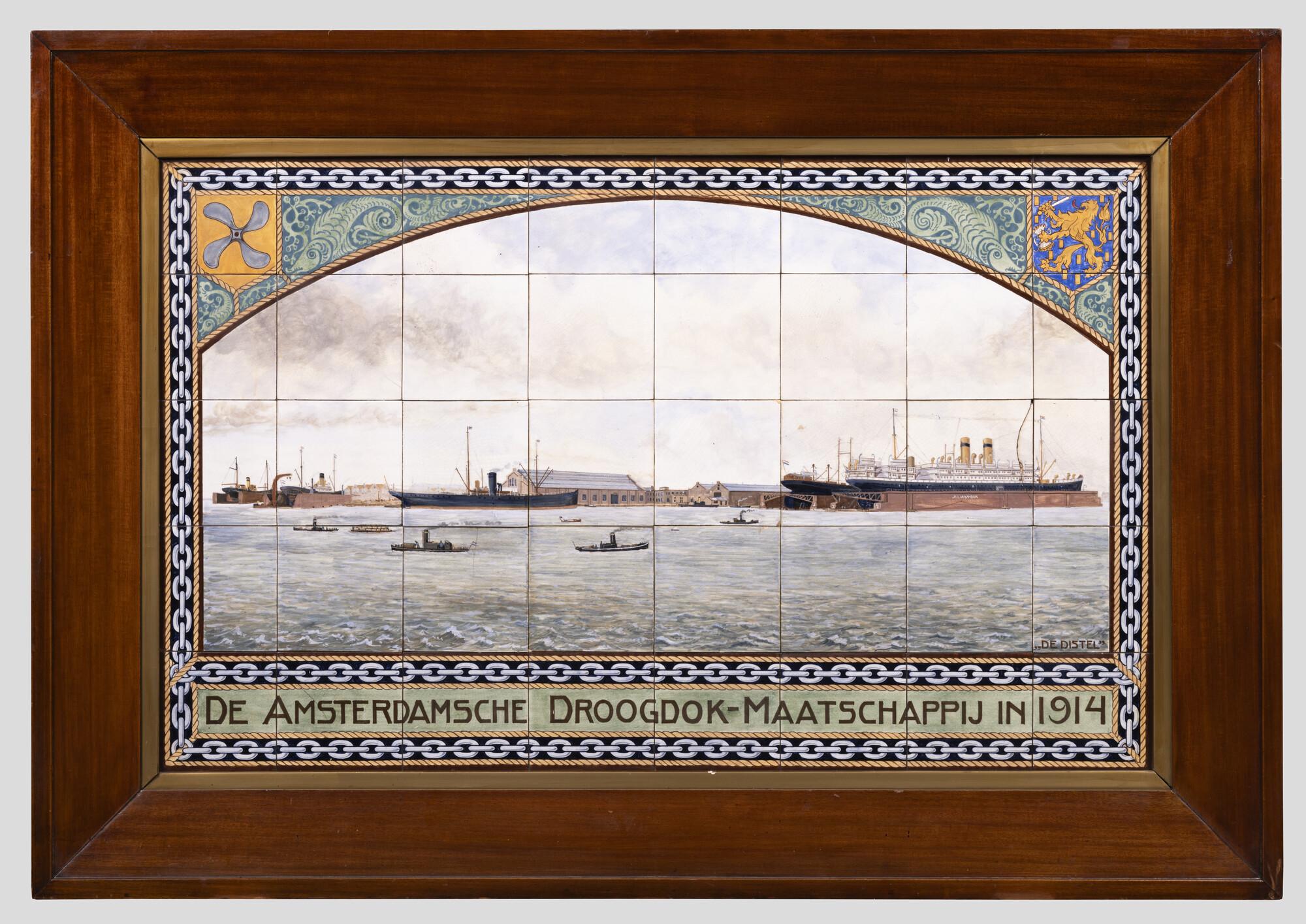 Tegeltableau met voorstelling van de Amsterdamsche Droogdok Maatschappij in 1879.