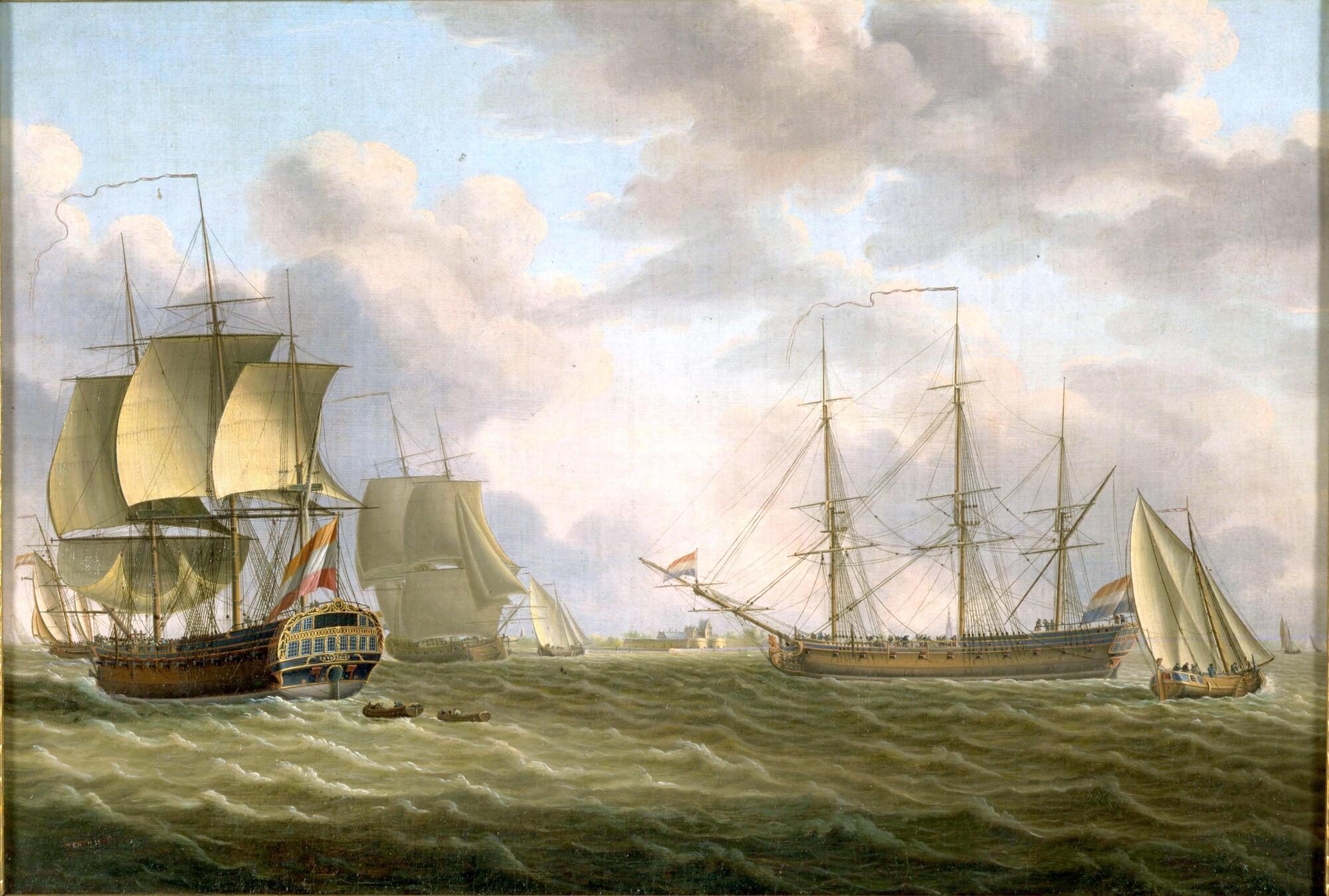 De Rede van Rammekens bij Vlissingen met het retourschip Zuiderburg van de Zeeuwse kamer van de VOC. Tussen de schepen zijn op de achtergrond de ronde vestingmuren van Fort Rammekens zichtbaar.