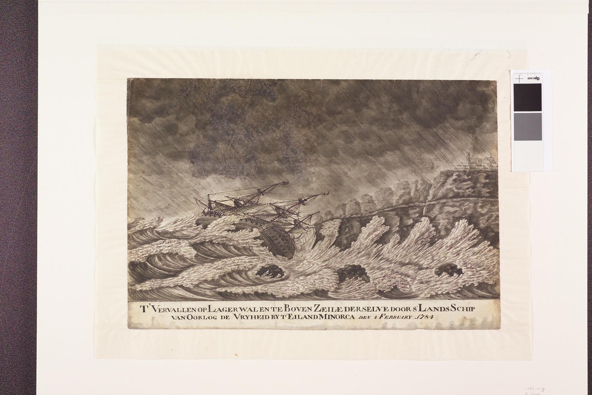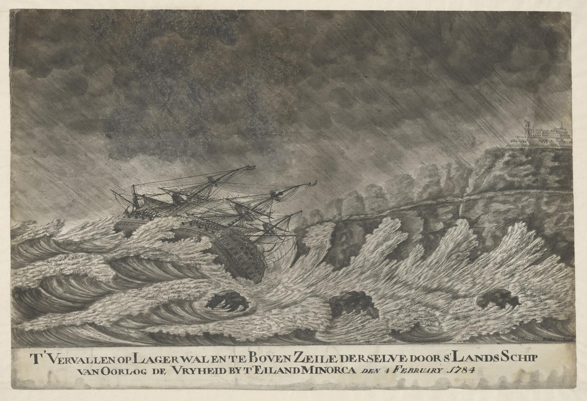 Schipbreuk van 's Lands oorlogsschip de "Vrijheid" op de kust van het eiland Minorca op 4 Februari 1784.