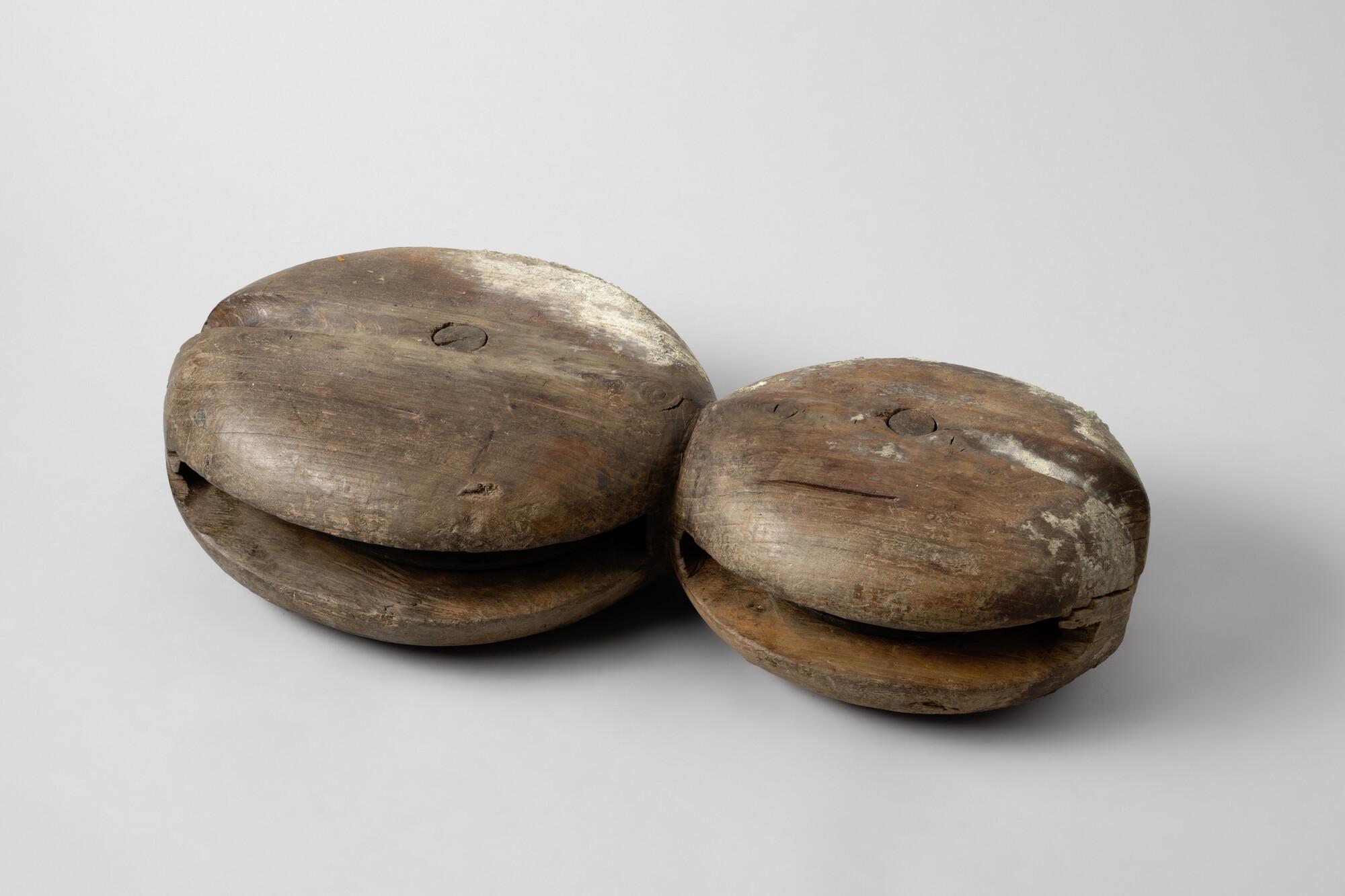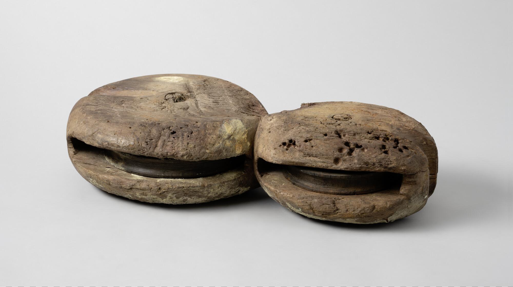 Het blok heeft twee pokhouten schijven, afkomstig uit het middenschip van het wrak "'T Vliegend Hart", gezonken op 3 februari 1735 op de bank het Schoneveld bij Zeeland. Afkomstig uit de campagne 1988.