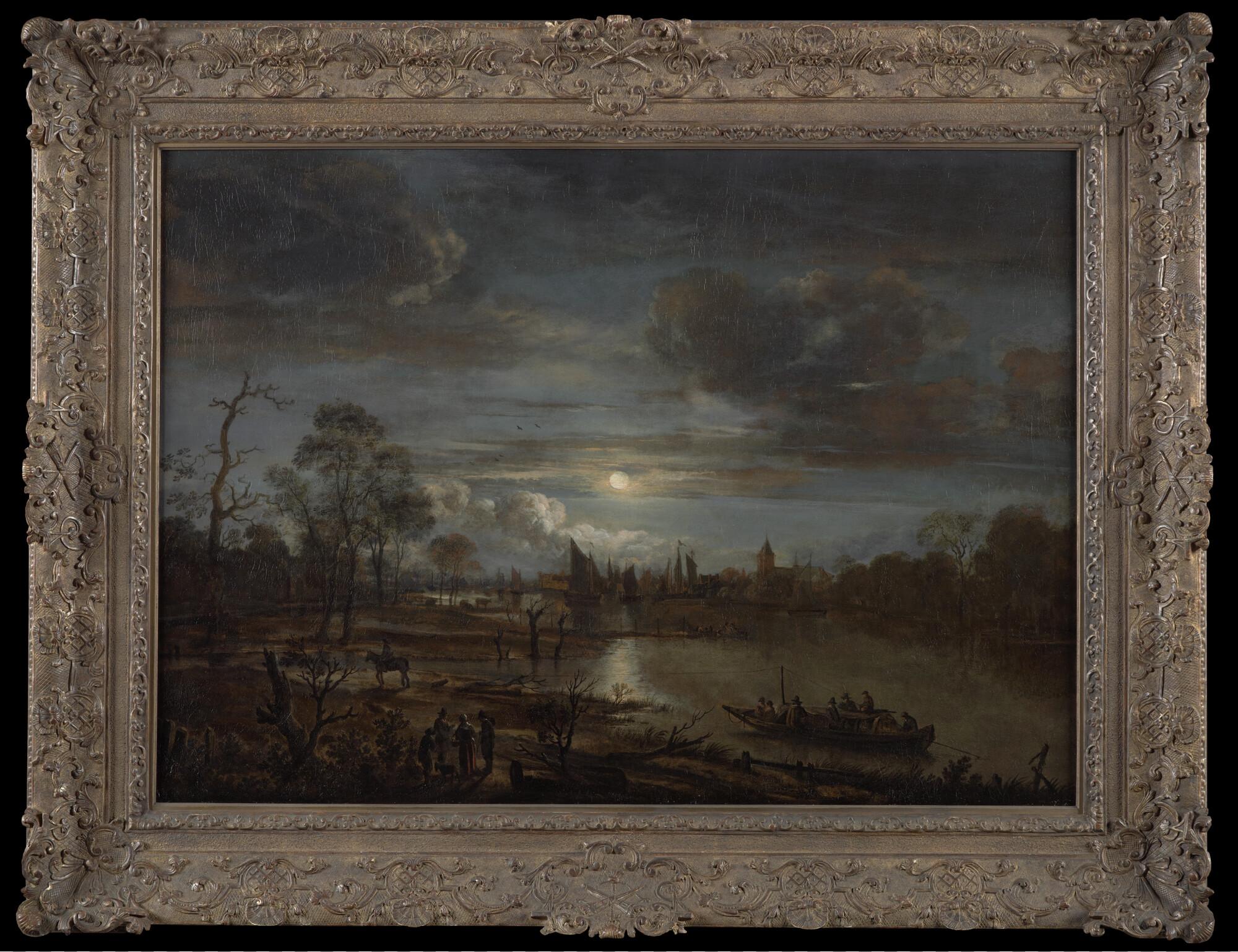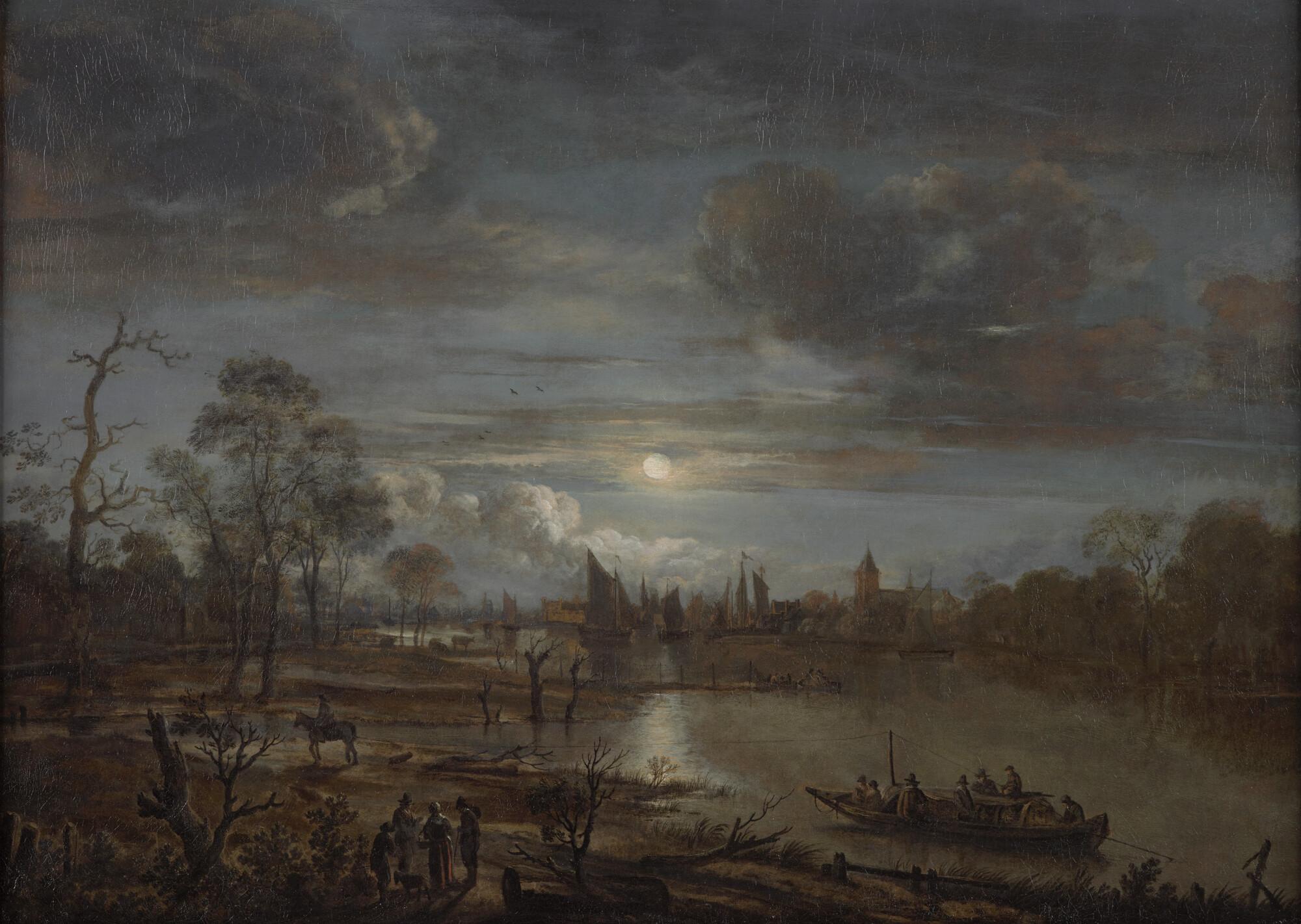 Riviergezicht met trekschuit bij maanlicht