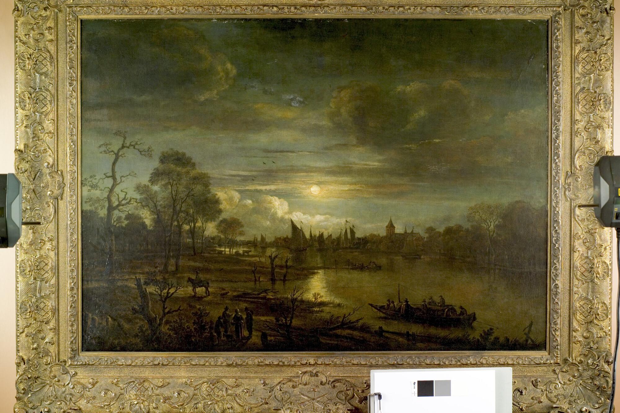 Schilderij in lijst van een riviergezicht met trekschuit bij maanlicht. In vergulde lijst.