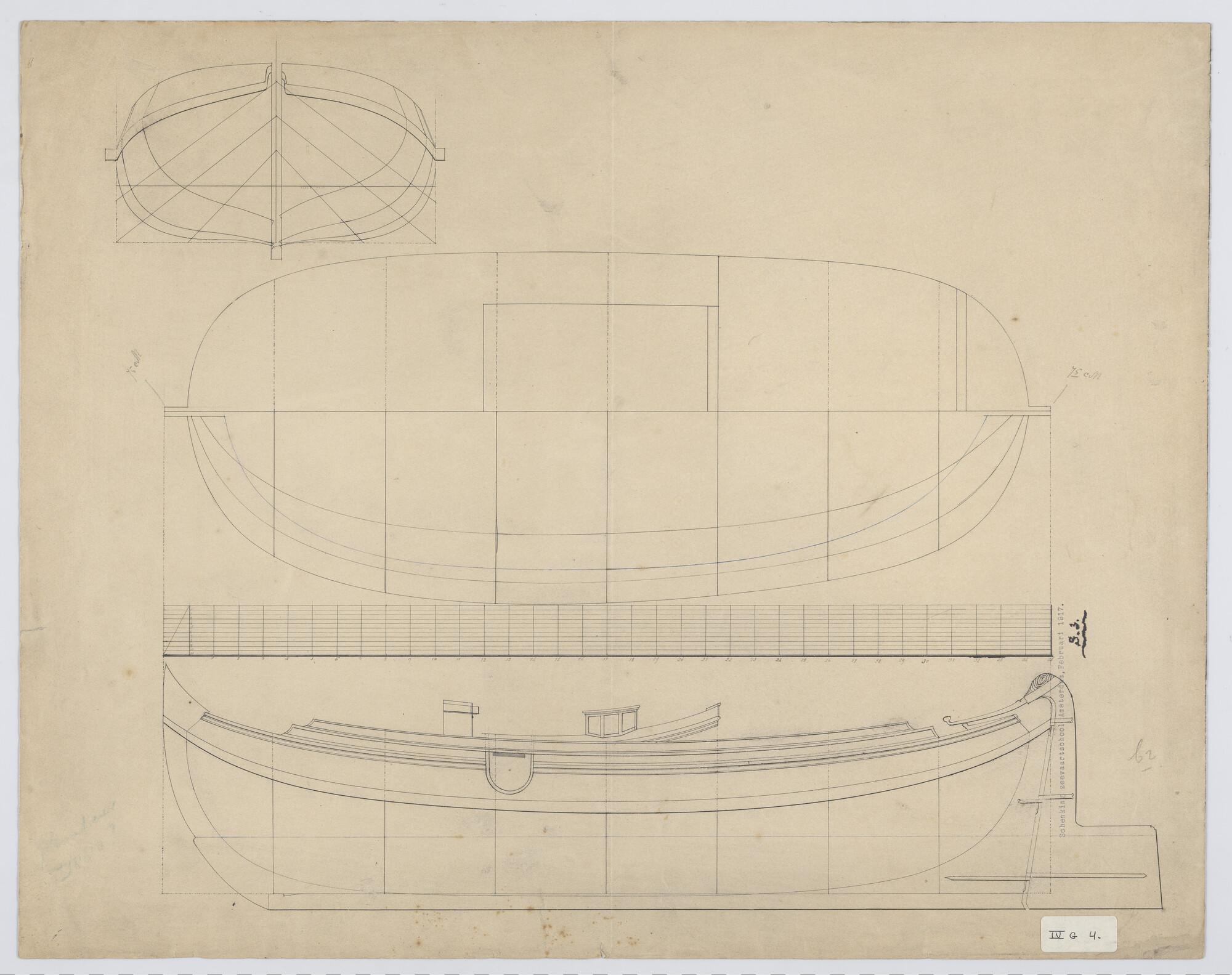 Zij-, boven-, voor- en achteraanzicht, senten van een boeier