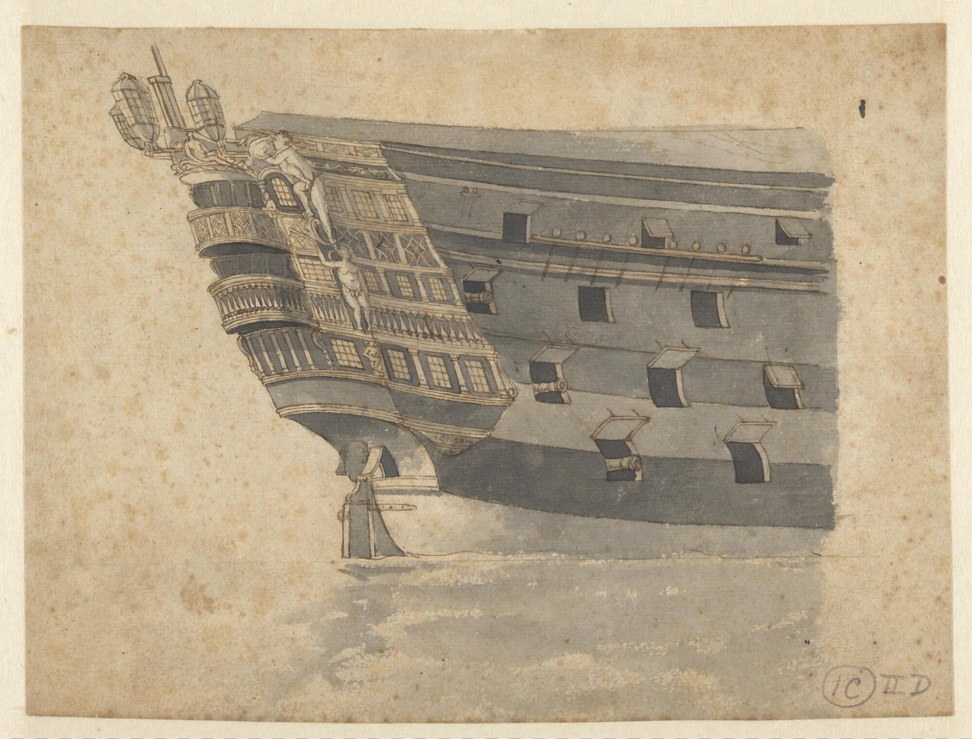 Een achterschip van een driedekker met rijk bewerkte spiegel