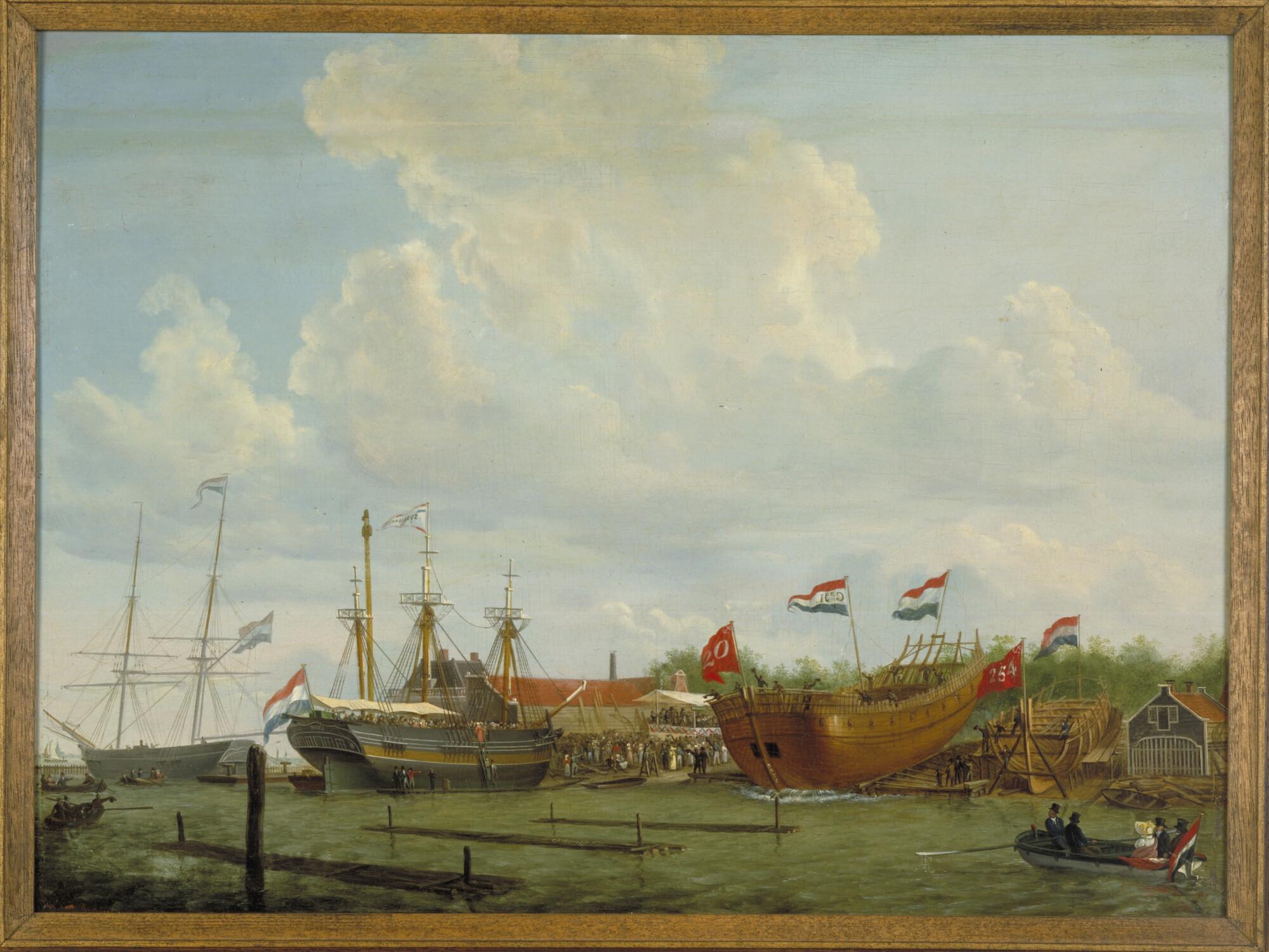 De tewaterlating van het fregatschip Olivier van Noort op de werf Hollandia te Amsterdam, 14 juli 1828.