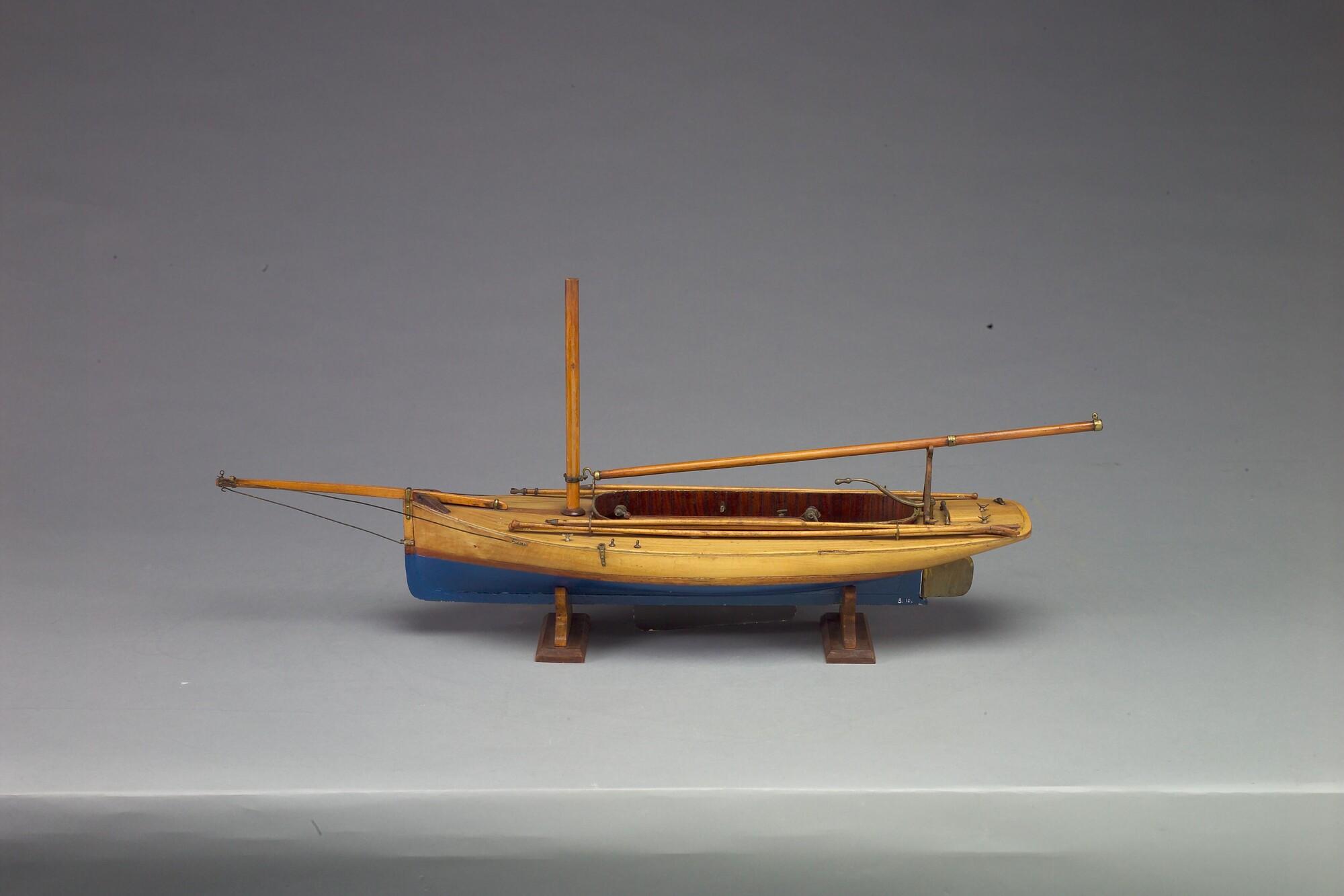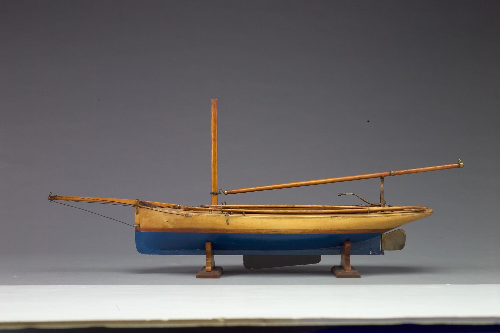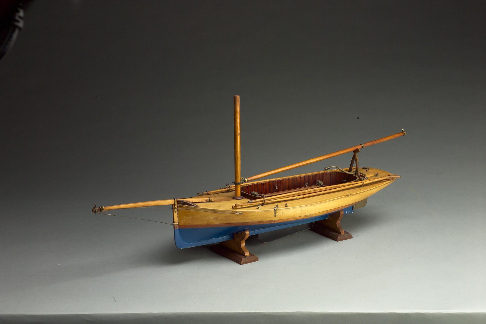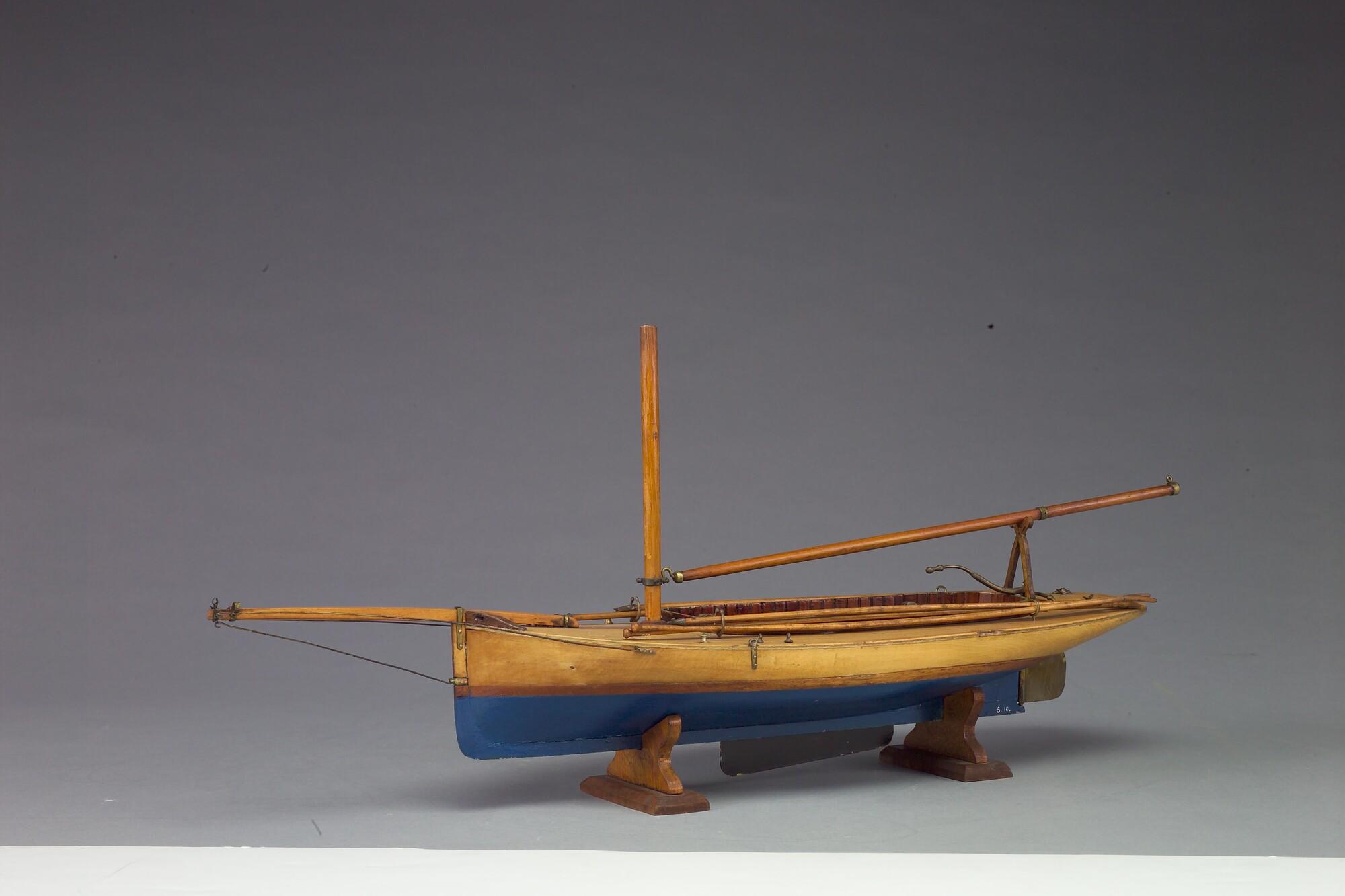 Model van een midzwaardjacht, omstreeks 1885. Het model is uitgerust met de bun met midzwaard en met twee handspilletjes, twee metalen pompjes, giek, 2 pikhaken, 2 vaarbomen. Het model heeft de loodrecht staande voorsteven, die tot in de negentiger jaren (van de negentiende eeuw) werd toegepast.