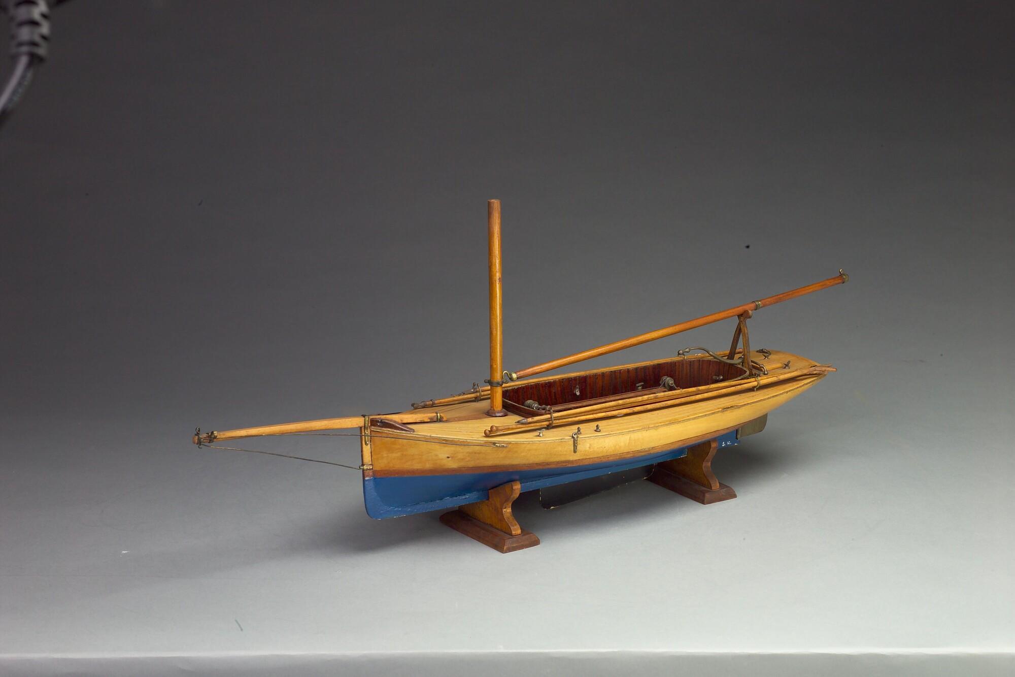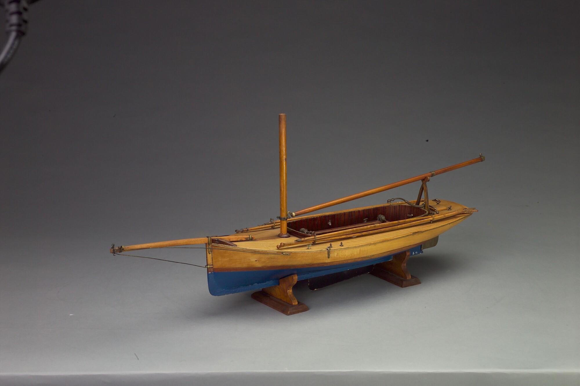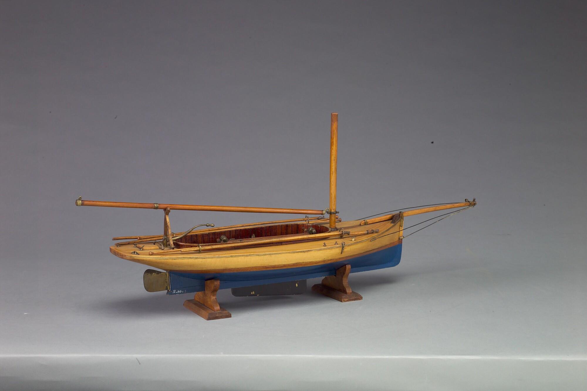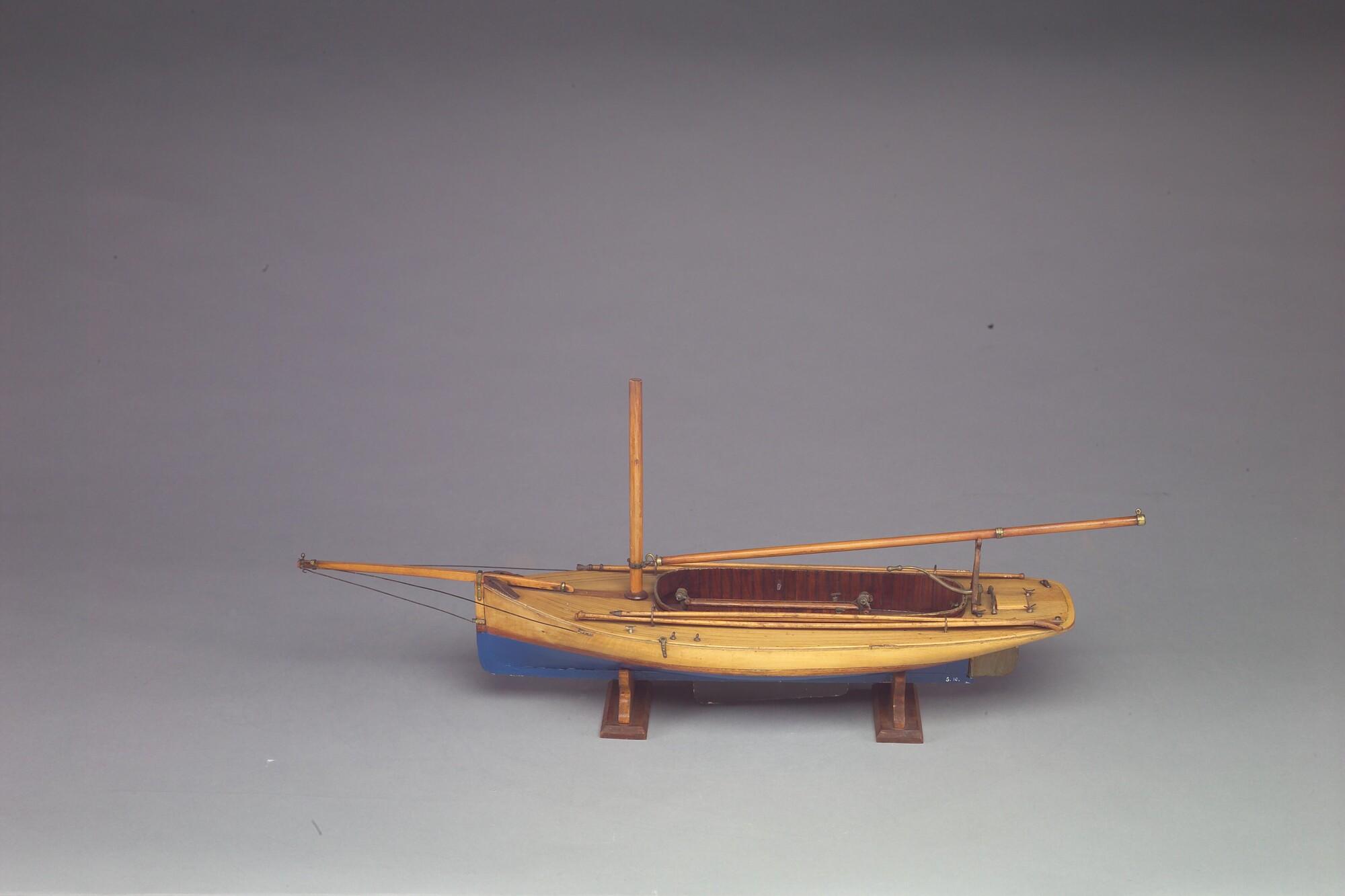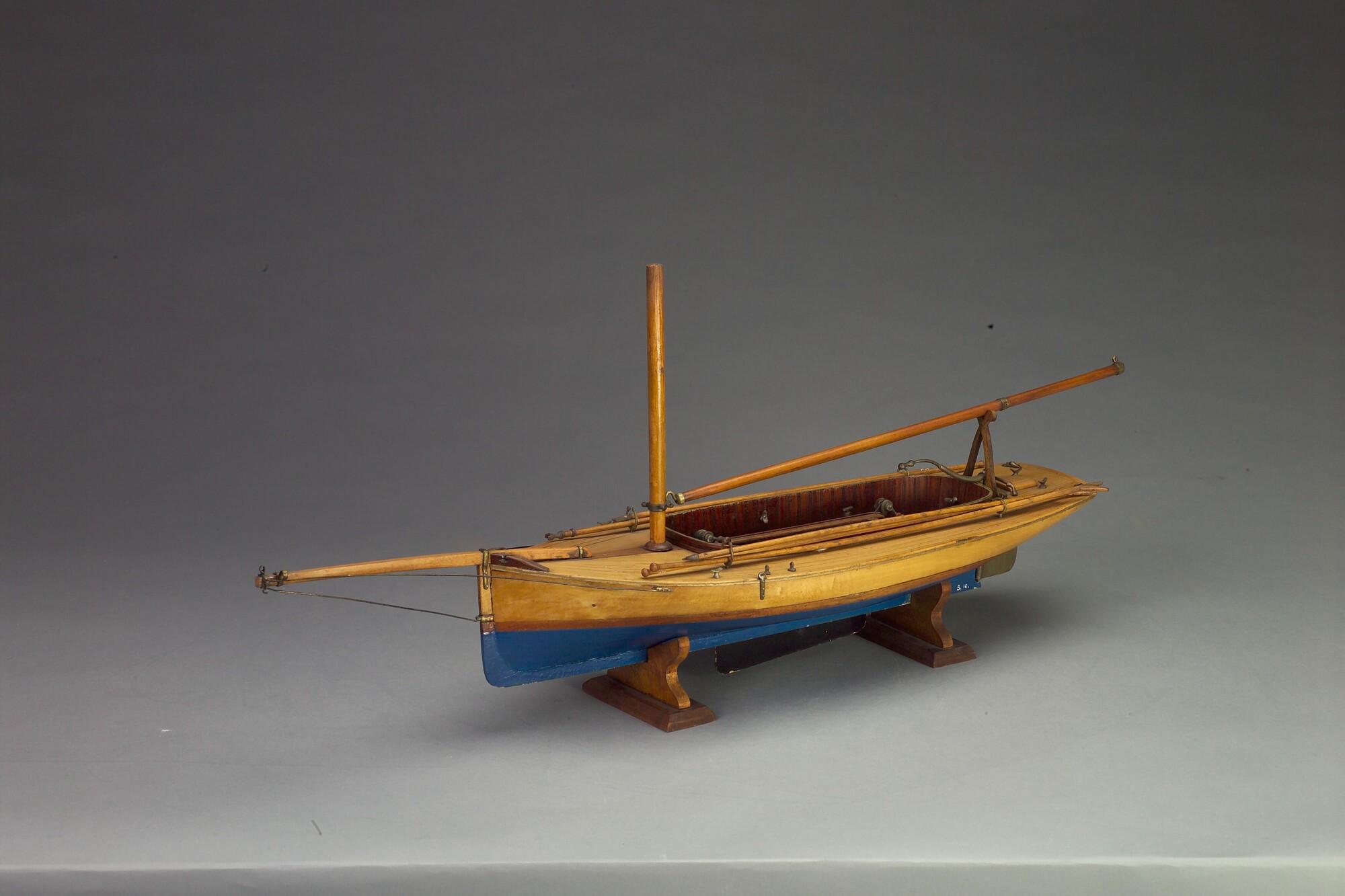 Model van een midzwaardjacht, omstreeks 1885. Het model is uitgerust met de bun met midzwaard en met twee handspilletjes, twee metalen pompjes, giek, 2 pikhaken, 2 vaarbomen. Het model heeft de loodrecht staande voorsteven, die tot in de negentiger jaren (van de negentiende eeuw) werd toegepast.