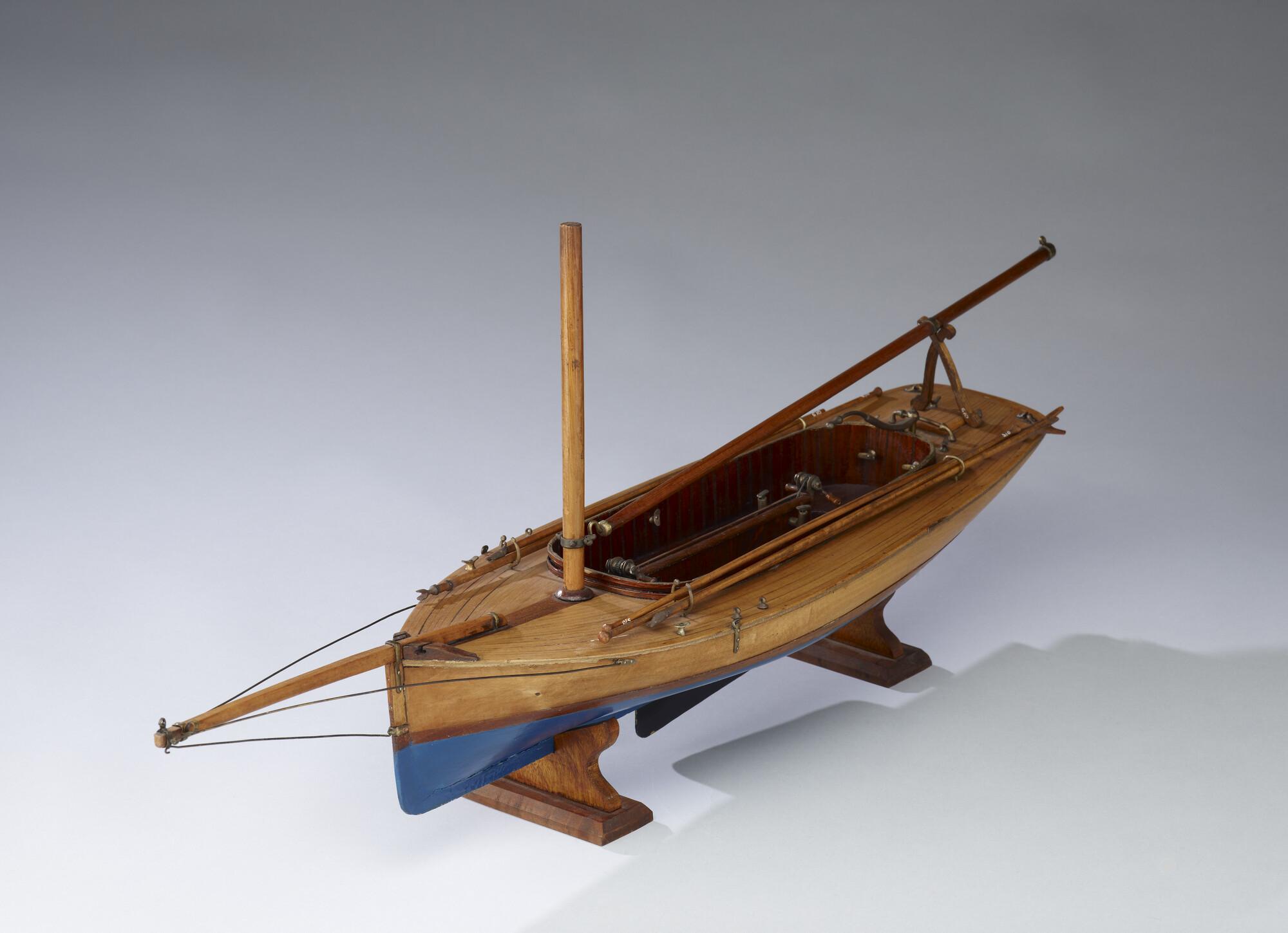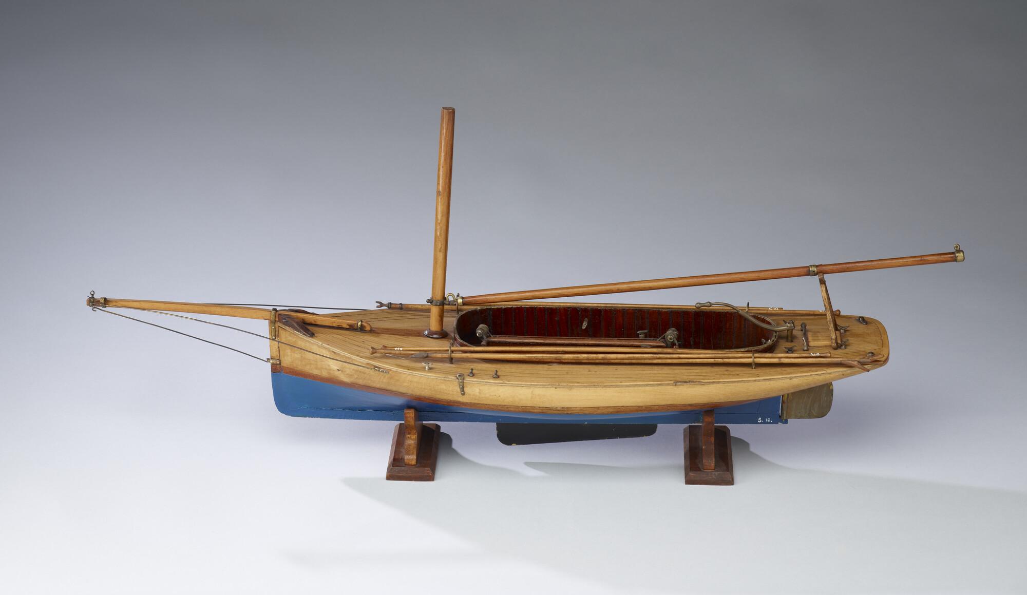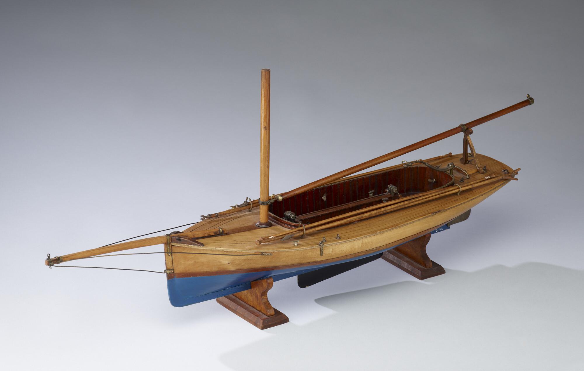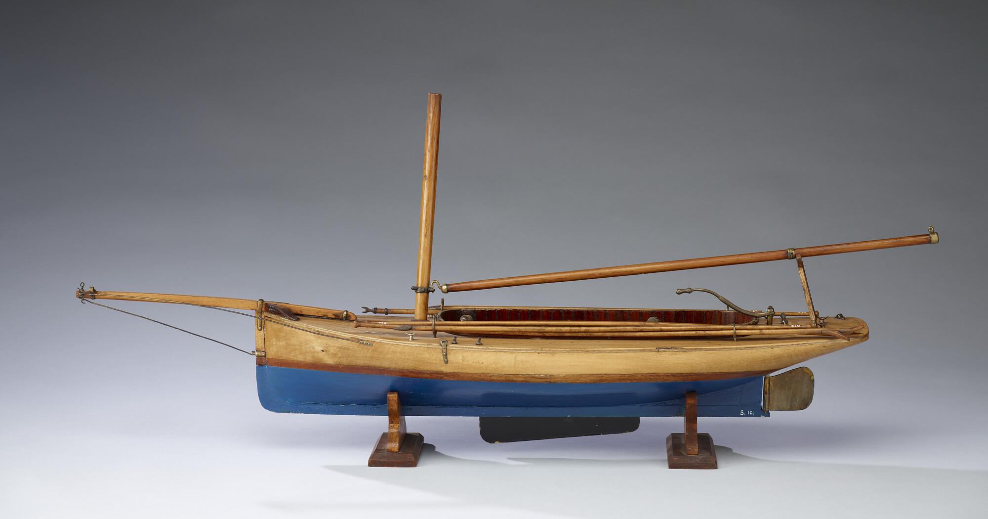 Model van een midzwaardjacht, omstreeks 1885. Het model is uitgerust met de bun met midzwaard en met twee handspilletjes, twee metalen pompjes, giek, 2 pikhaken, 2 vaarbomen. Het model heeft de loodrecht staande voorsteven, die tot in de negentiger jaren (van de negentiende eeuw) werd toegepast.