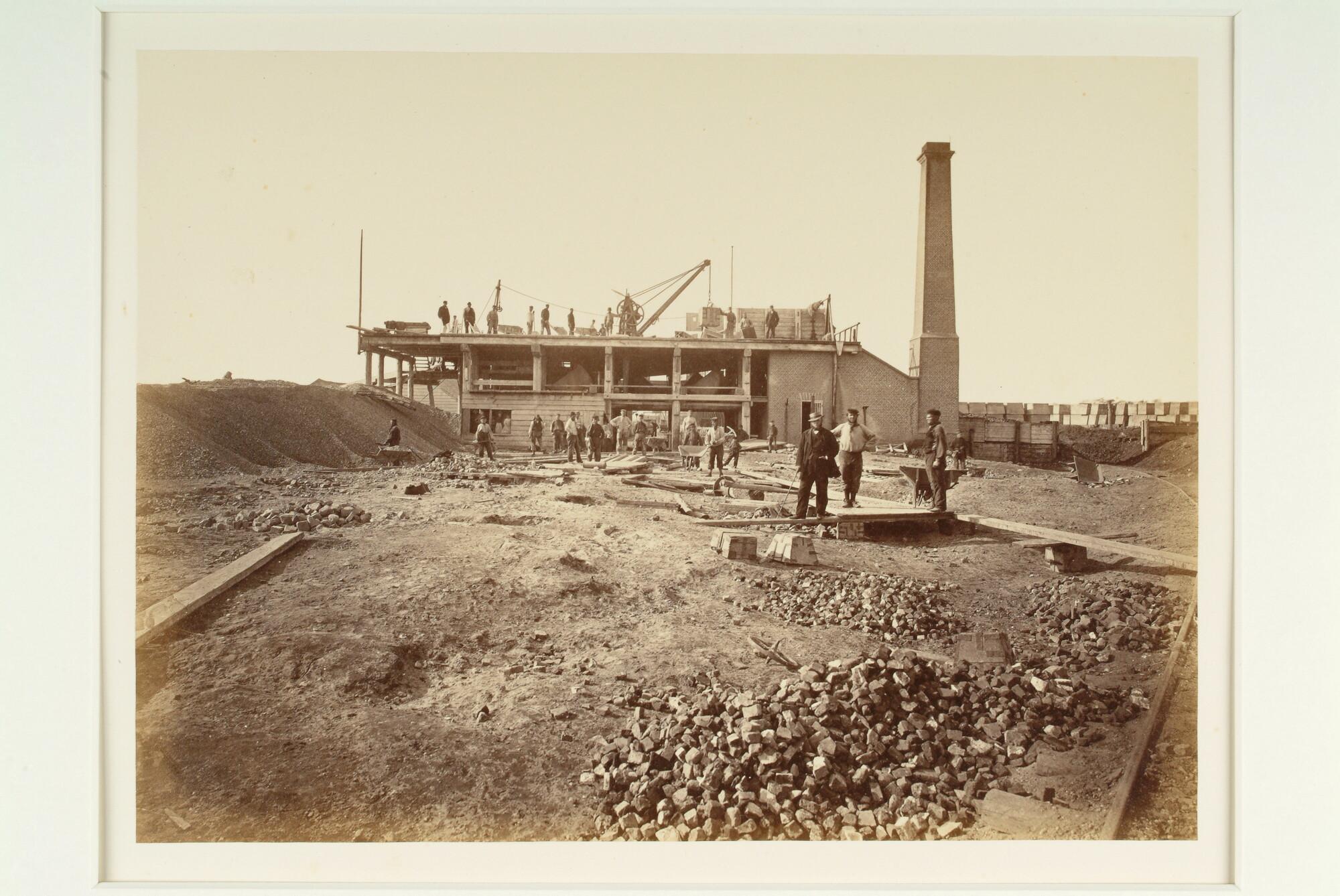 De werkzaamheden voor de bouw van de havenhoofden bij IJmuiden als onderdeel van de aanleg van het Noordzeekanaal: gezicht op onbekend werkterrein.