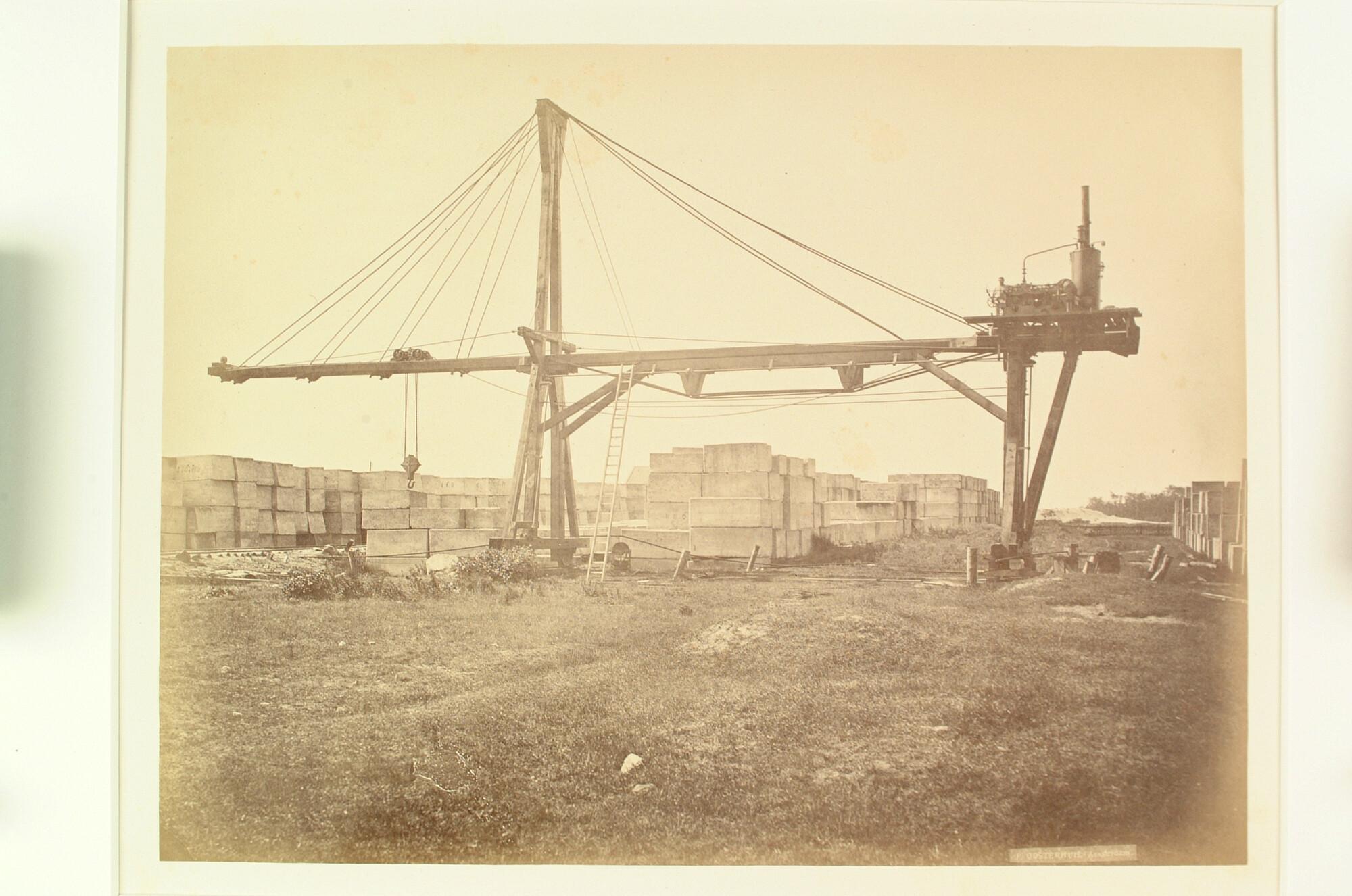 De werkzaamheden voor de bouw van de havenhoofden bij IJmuiden als onderdeel van de aanleg van het Noordzeekanaal: gezicht op de stapelplaats van betonblokken.