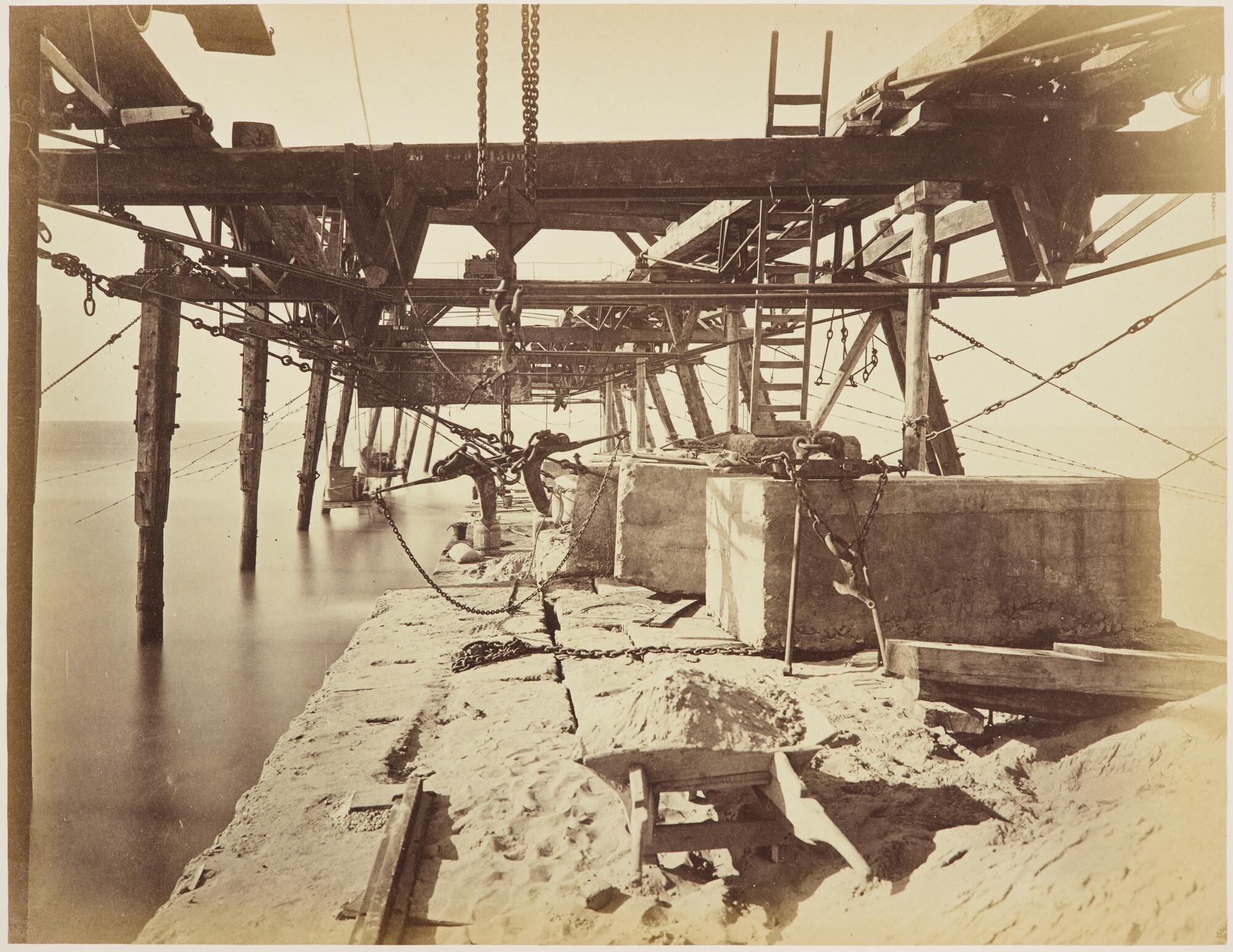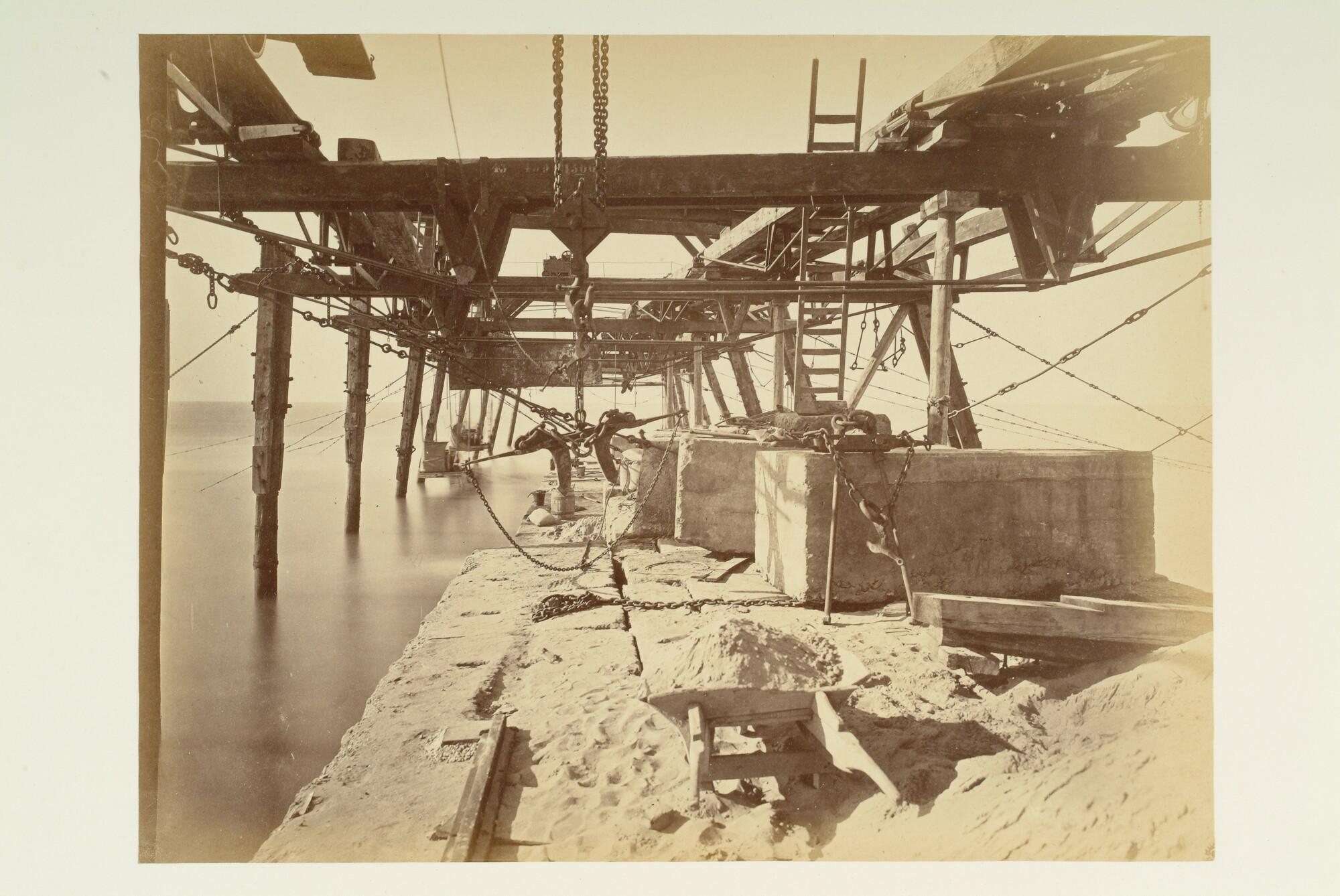 De werkzaamheden voor de bouw van de havenhoofden bij IJmuiden als onderdeel van de aanleg van het Noordzeekanaal: Noorderhavenhoofd met werksteiger, stormschade 1869.