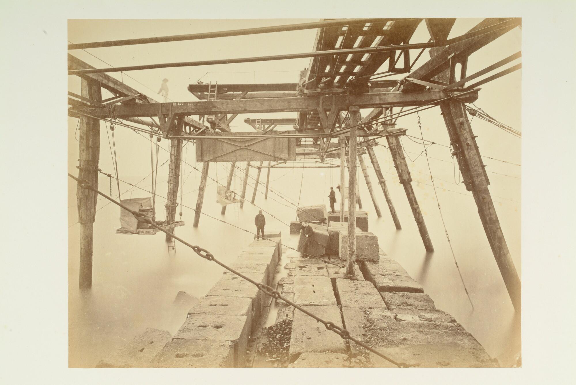De werkzaamheden voor de bouw van de havenhoofden bij IJmuiden als onderdeel van de aanleg van het Noordzeekanaal: Noorderhavenhoofd met werksteiger, stormschade, 1869.