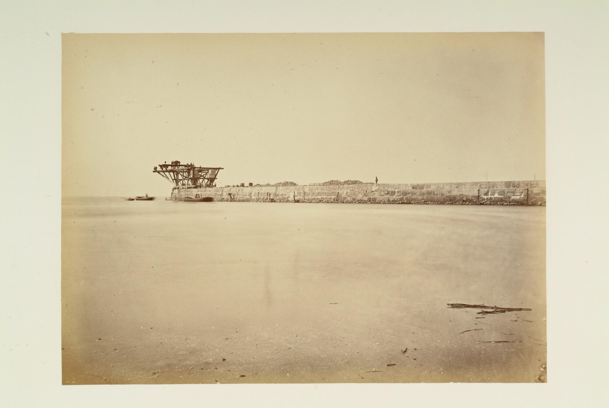De werkzaamheden voor de bouw van de havenhoofden bij IJmuiden als onderdeel van de aanleg van het Noordzeekanaal: Noorderhavenhoofd met "Titan".