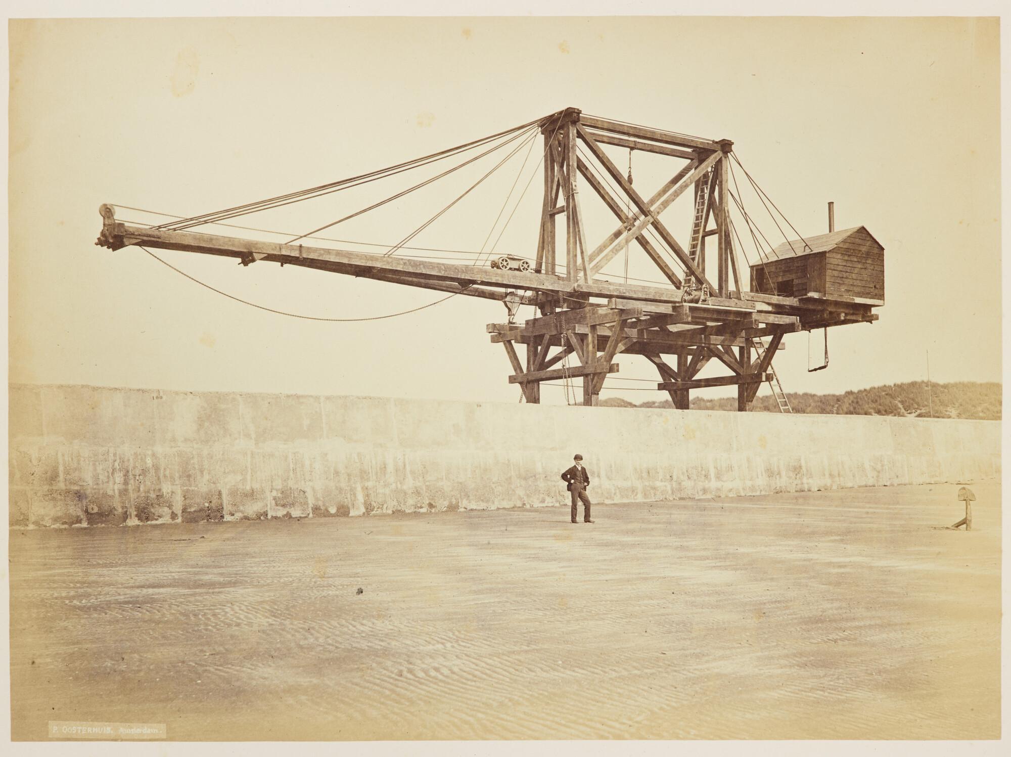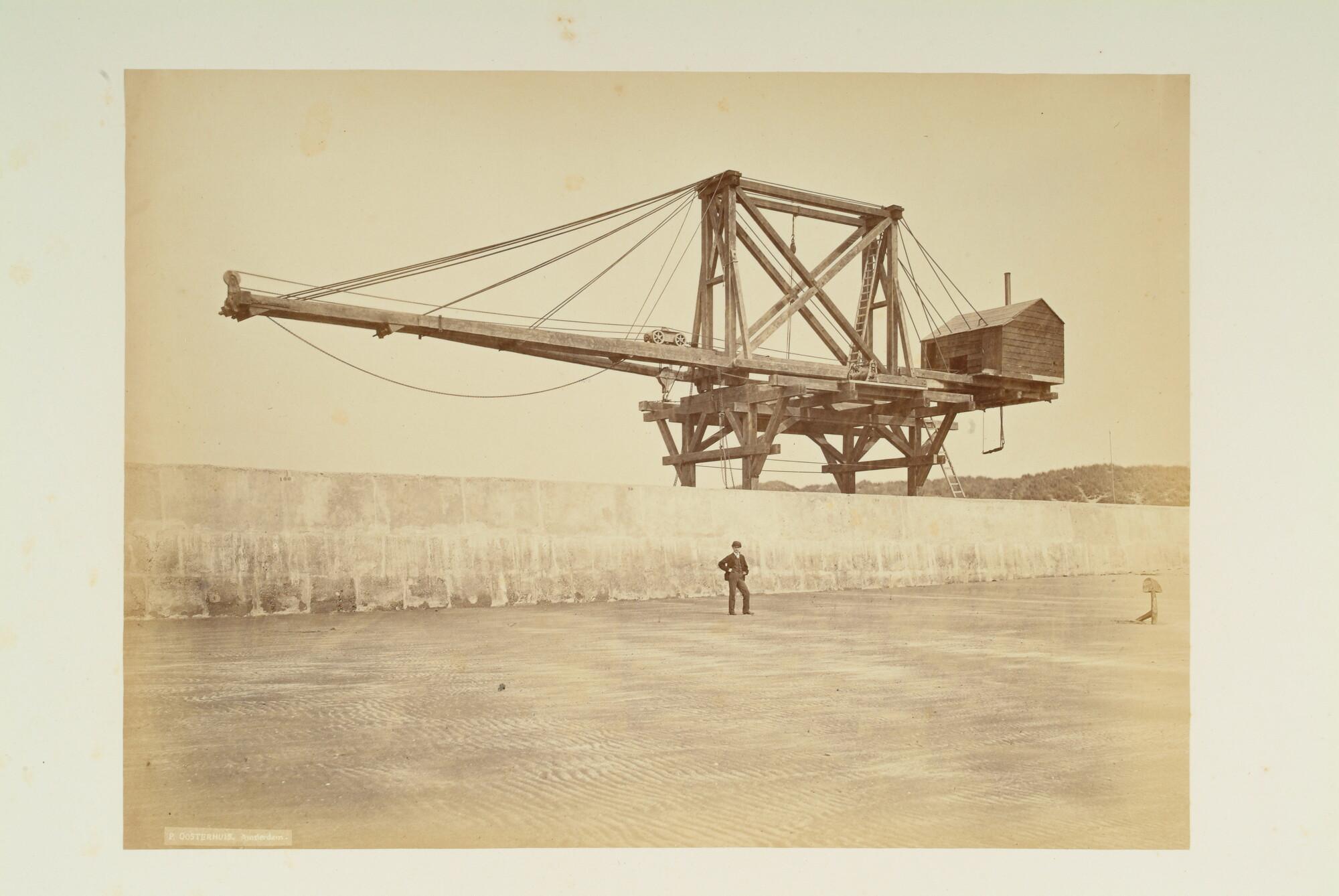 De werkzaamheden voor de bouw van de havenhoofden bij IJmuiden als onderdeel van de aanleg van het Noordzeekanaal: houten "Titan" gebruikt bij de bouw van het Zuiderhavenhoofd.