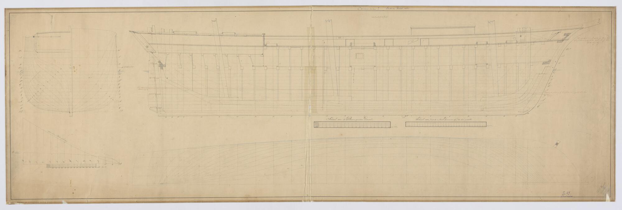 Verticale langsdoorsnede, spantenraam, waterlijnen, senten, verticalen van het fregatschip "India Packet". Afmetingen 156 x 36.3 x 24.4 voet.