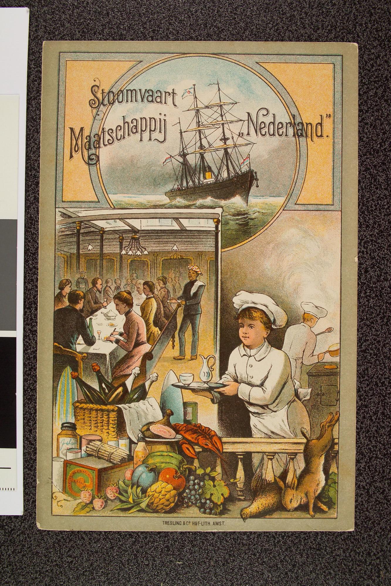 36 Menukaarten van 29 december 1897 t/m 21 januari 1898 van dejeuners en diners aan boord van het ss. Prins Alexander van de Stoomvaart-Maatschappij "Nederland" (SMN), met een afbeelding van een zeil stoomschip van de maatschappij een deel van de eetzaal en keuken.