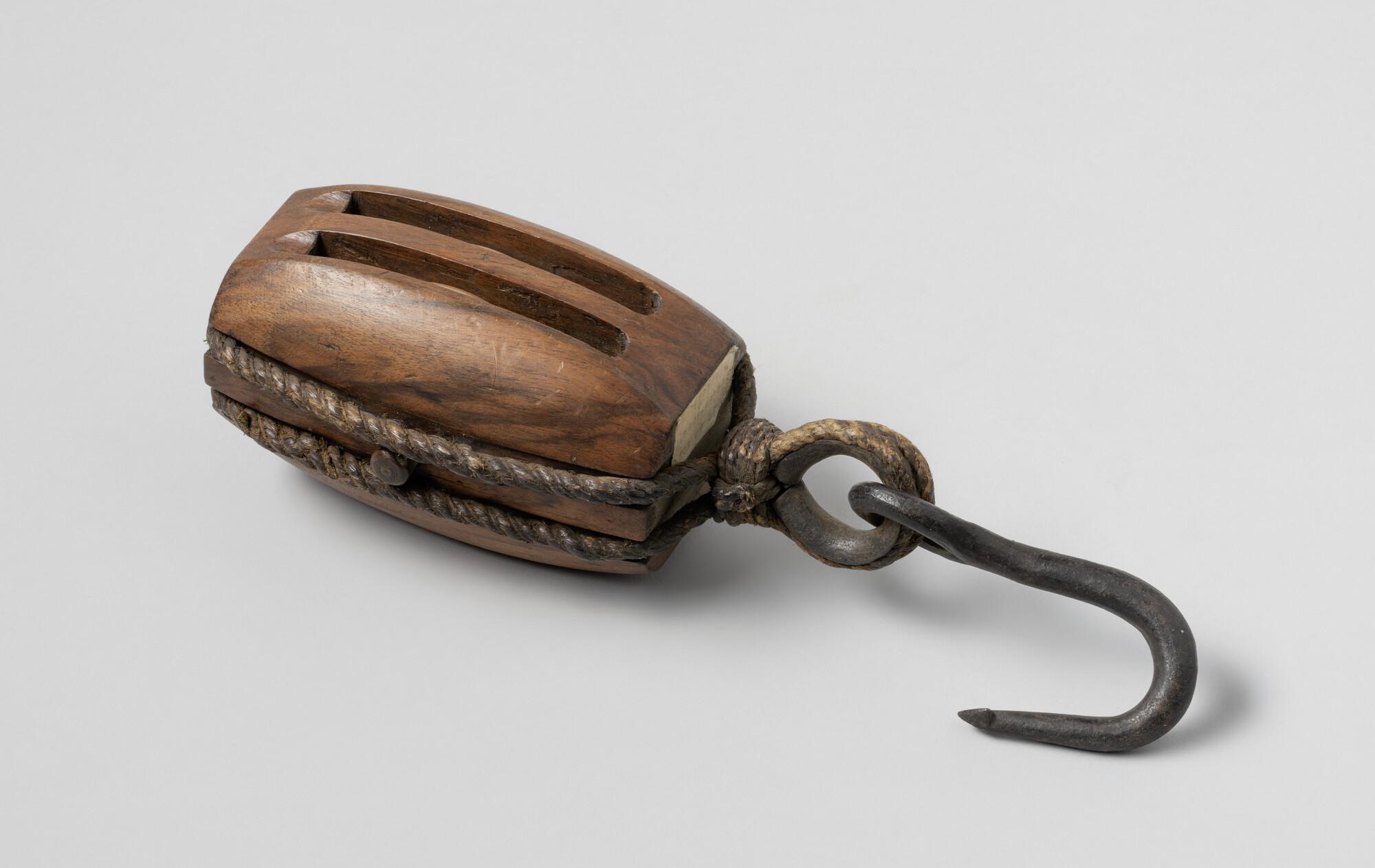 Iepenhouten blok met pokhouten schijven en houten nagel. Dubbel geneut en dubbel gestropt, met ingebonden kous (ijzer) en haak (ijzer). Vermoedelijk bestemd geweest voor gebruik in de batterij, niet voor in het tuig.