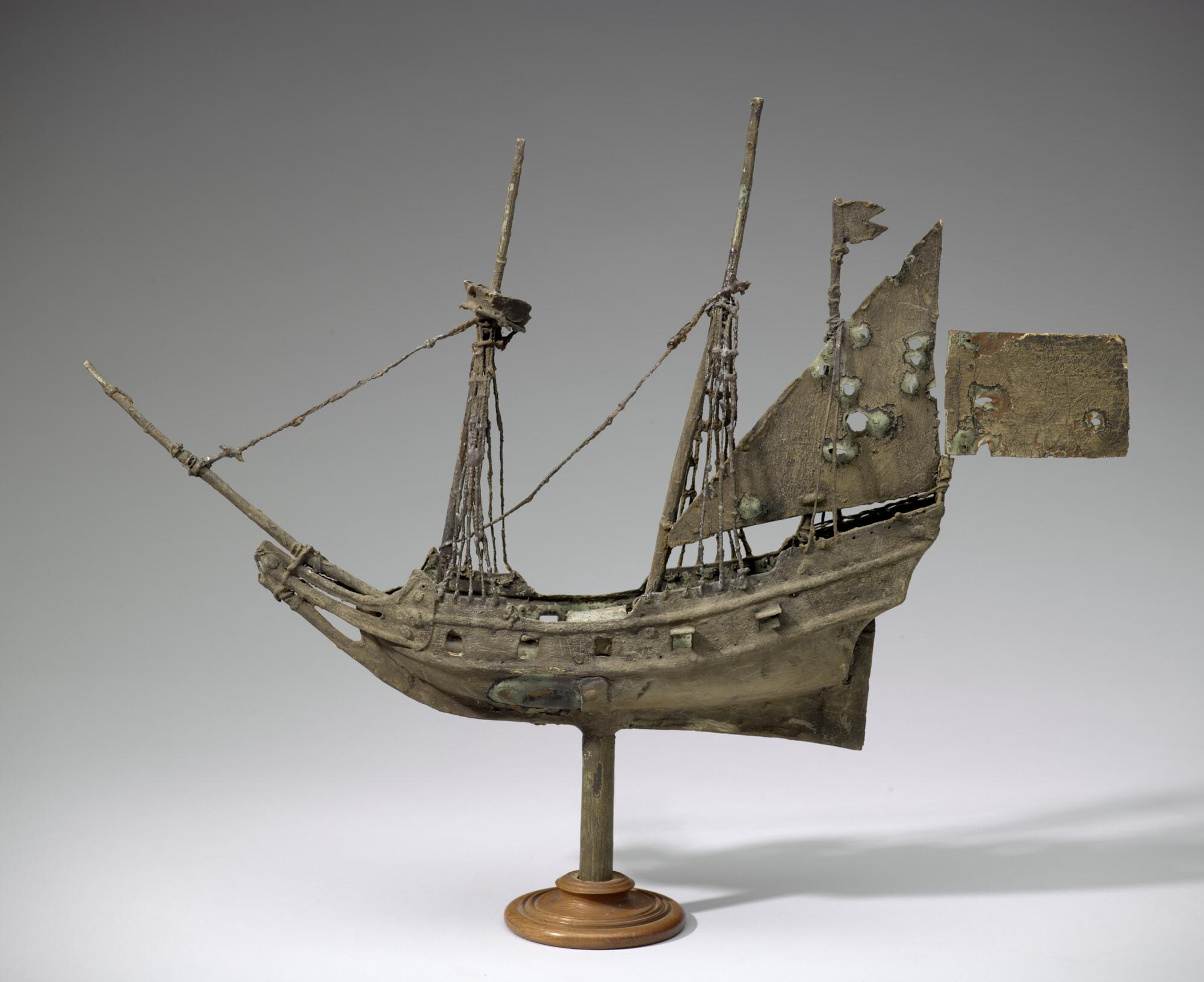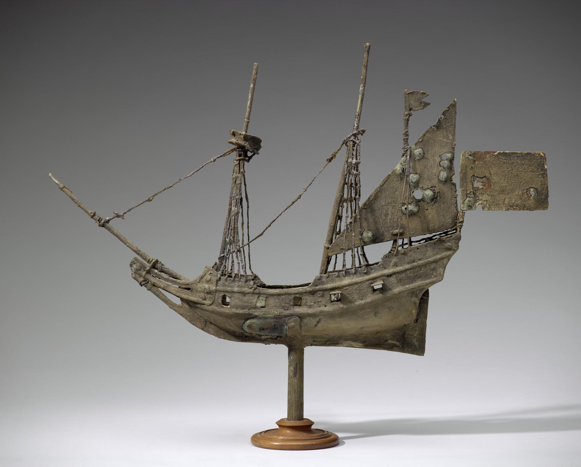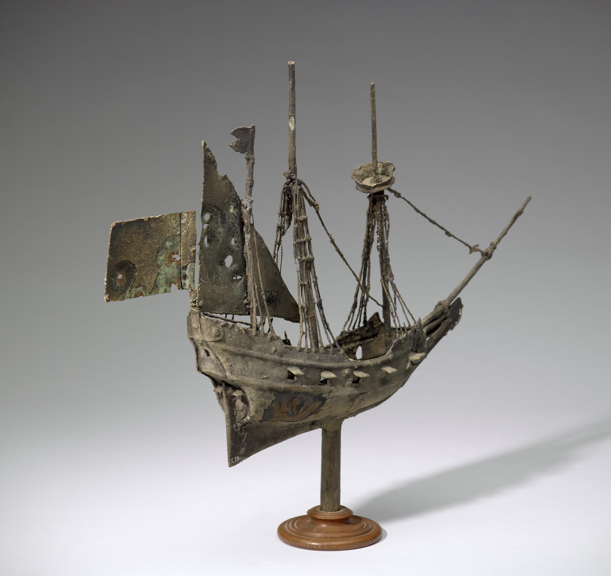 Windwijzer, uitgevoerd in koper, met de voorstelling van een bewapend driemastschip. Afkomstig van het Dordrechts schippersgilde. Gemonteerd op een voetstuk.