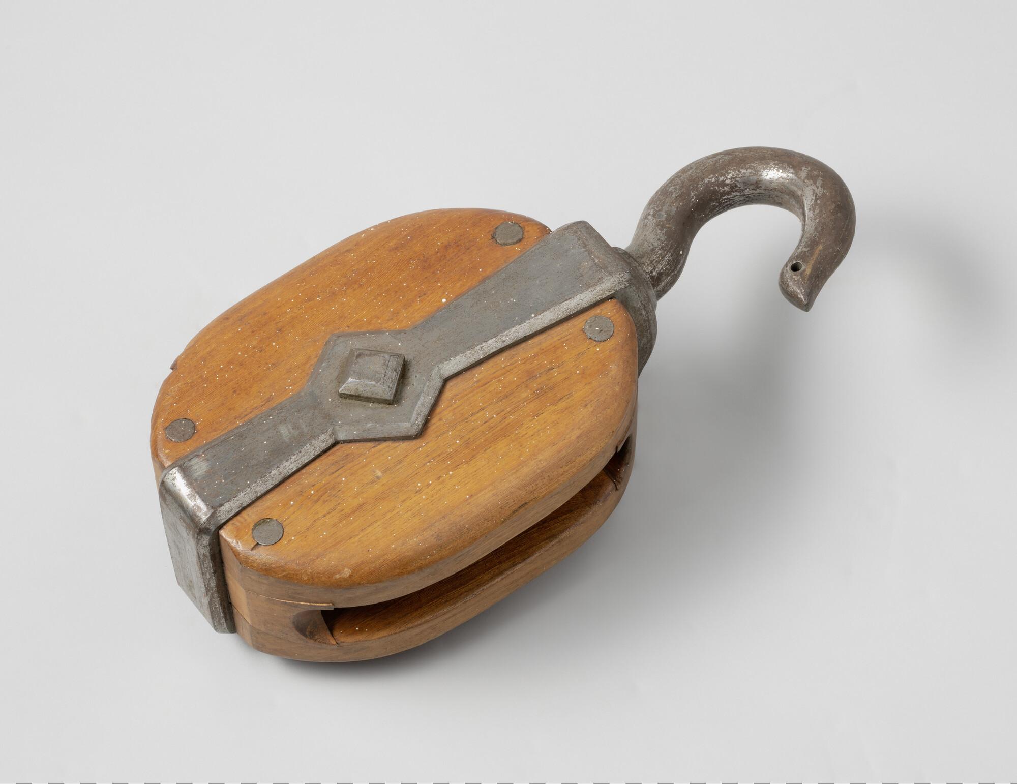 Iepenhouten blok met pokhouten schijf, ijzeren nagel en ijzerbeslag met draaihaak, haak met borging.