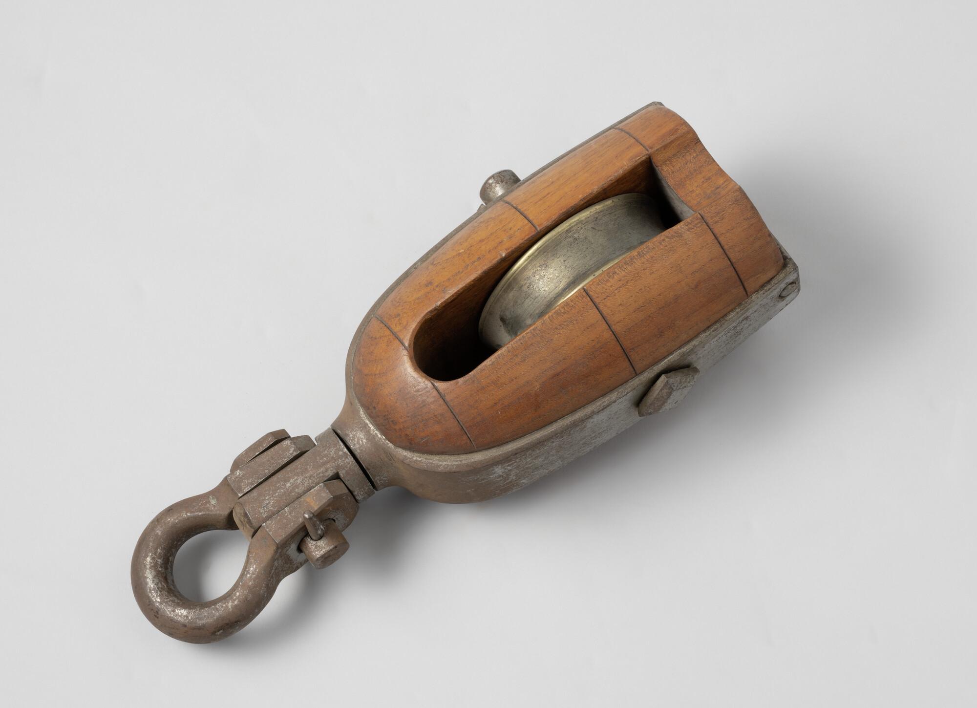 Iepenhouten blok met bronzen schijf, ijzeren nagel en ijzer beslag. Met draaioog. Blok is voor de boomschoot op schokkers.