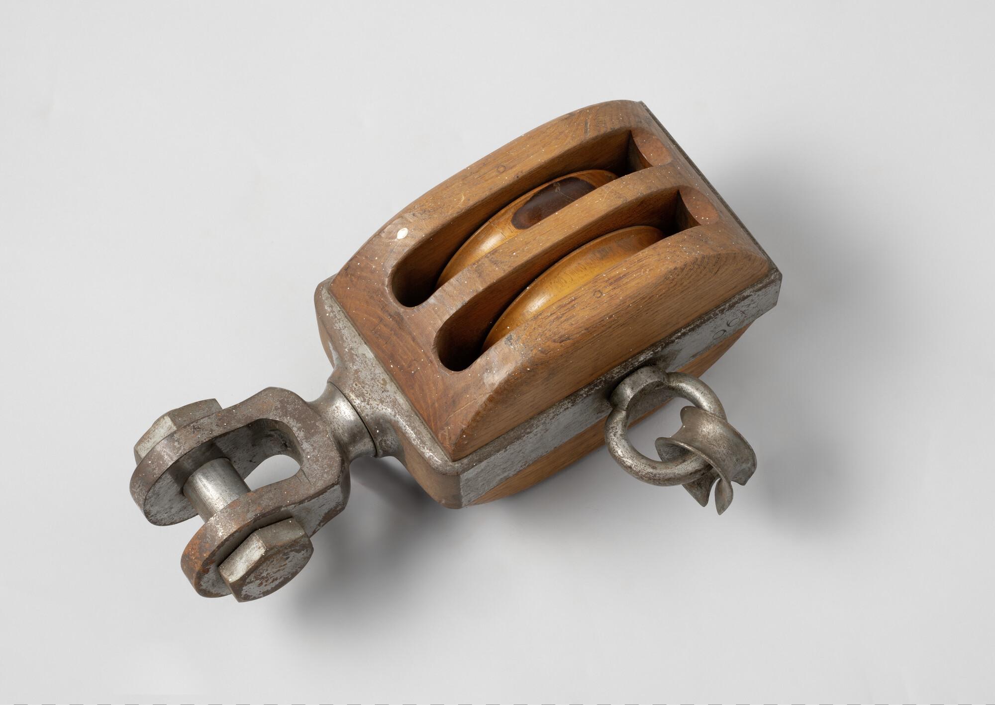 Iepenhouten blok met pokhouten schijven, ijzeren nagel. Ijzerbeslag. Aan één kant verlengde nagels met oog, waaraan ovale kous. Met draaivork. Gemerkt met twee maal gekruiste ankers, 18 en jaartal 1877, in metaal 96A. Bovenblok van een sloeptakel voor lo.