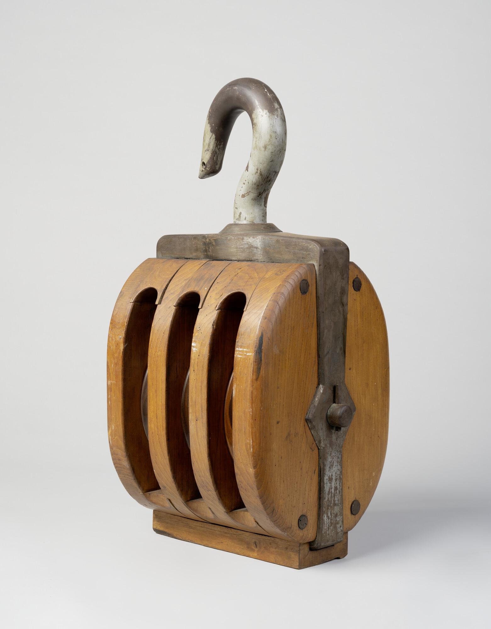 Drieschijfsblok ofwel gijnblok met pokhouten schijven, ijzeren nagel en ijzerbeslag. Gemerkt met een gekruist anker. Dit soort blokken werd gebruikt om kanonnen mee te hijsen, masten in te zetten en dergelijke.