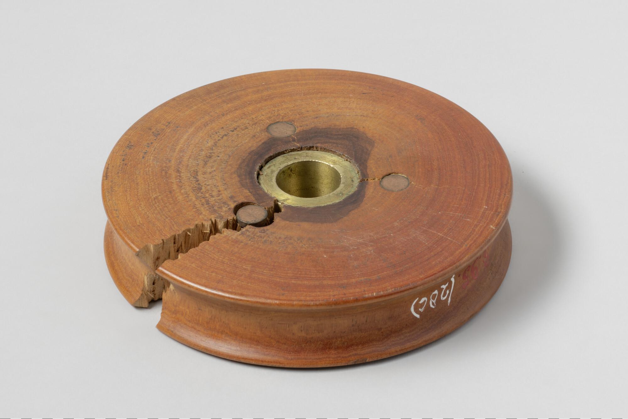 Pokhouten schijf met bosplaat (brons) geklonken met koperen boutjes. Gescheurd.