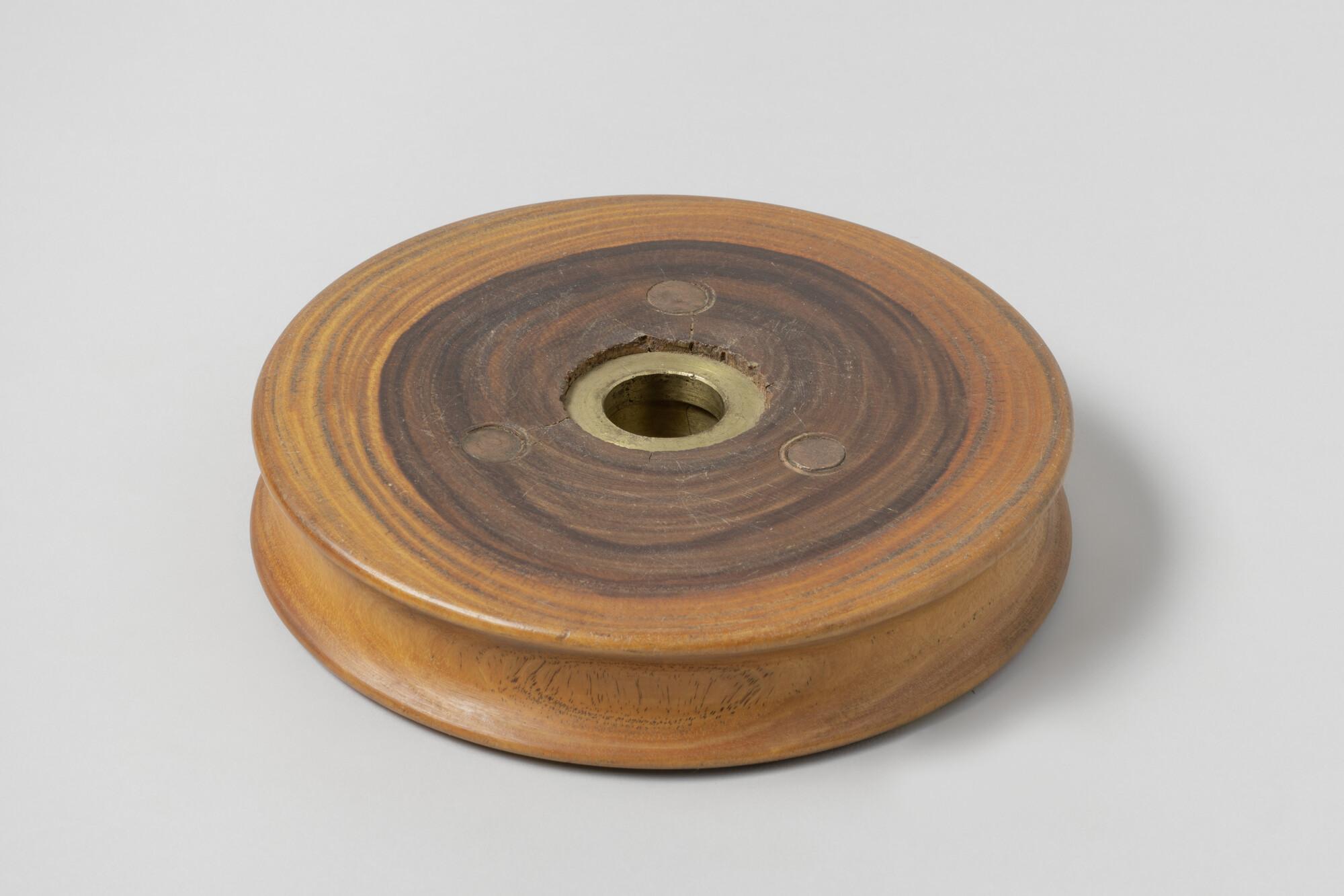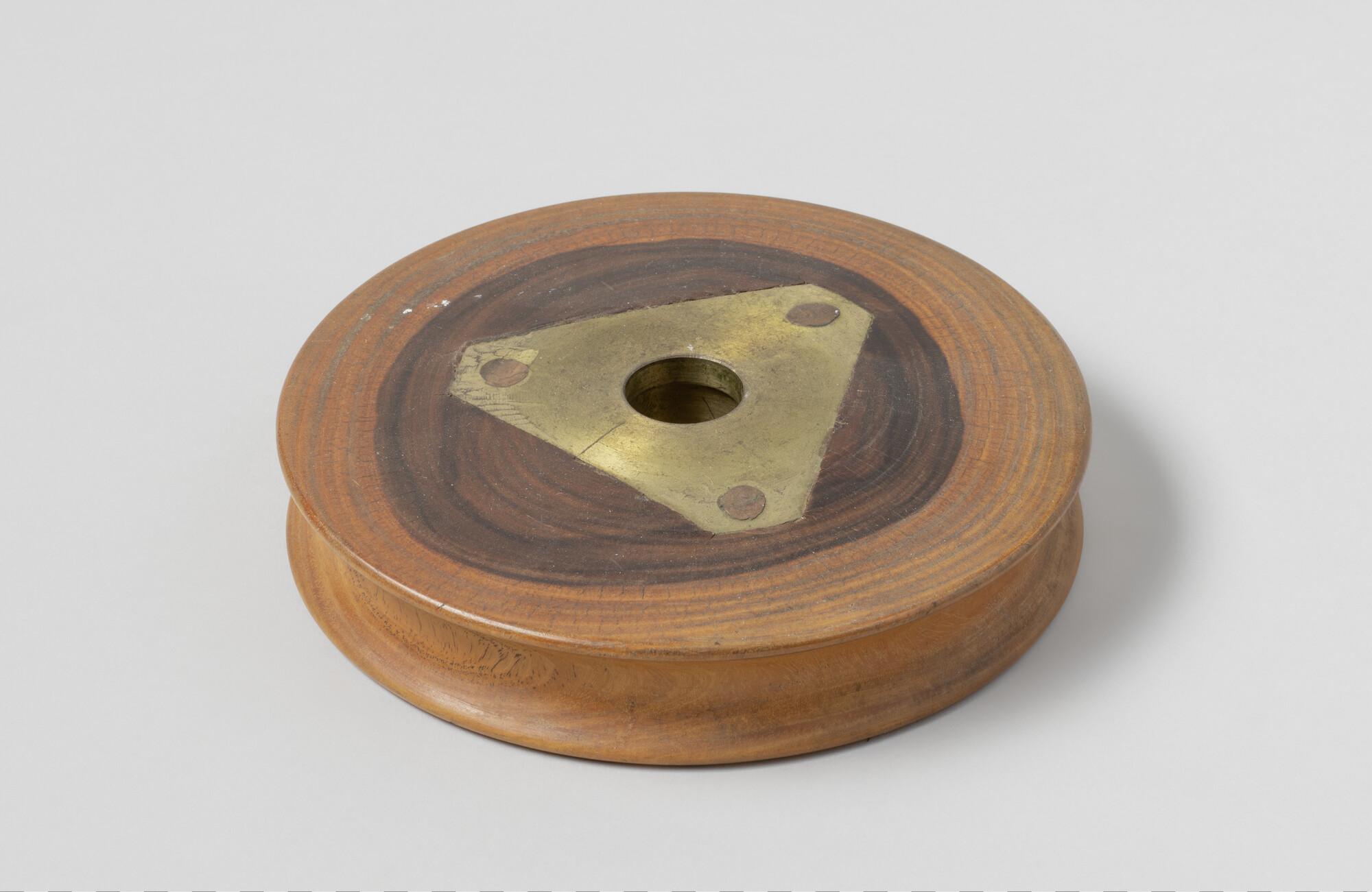 Pokhouten schijf met bosplaat (brons) geklonken met koperen boutjes. Gescheurd.