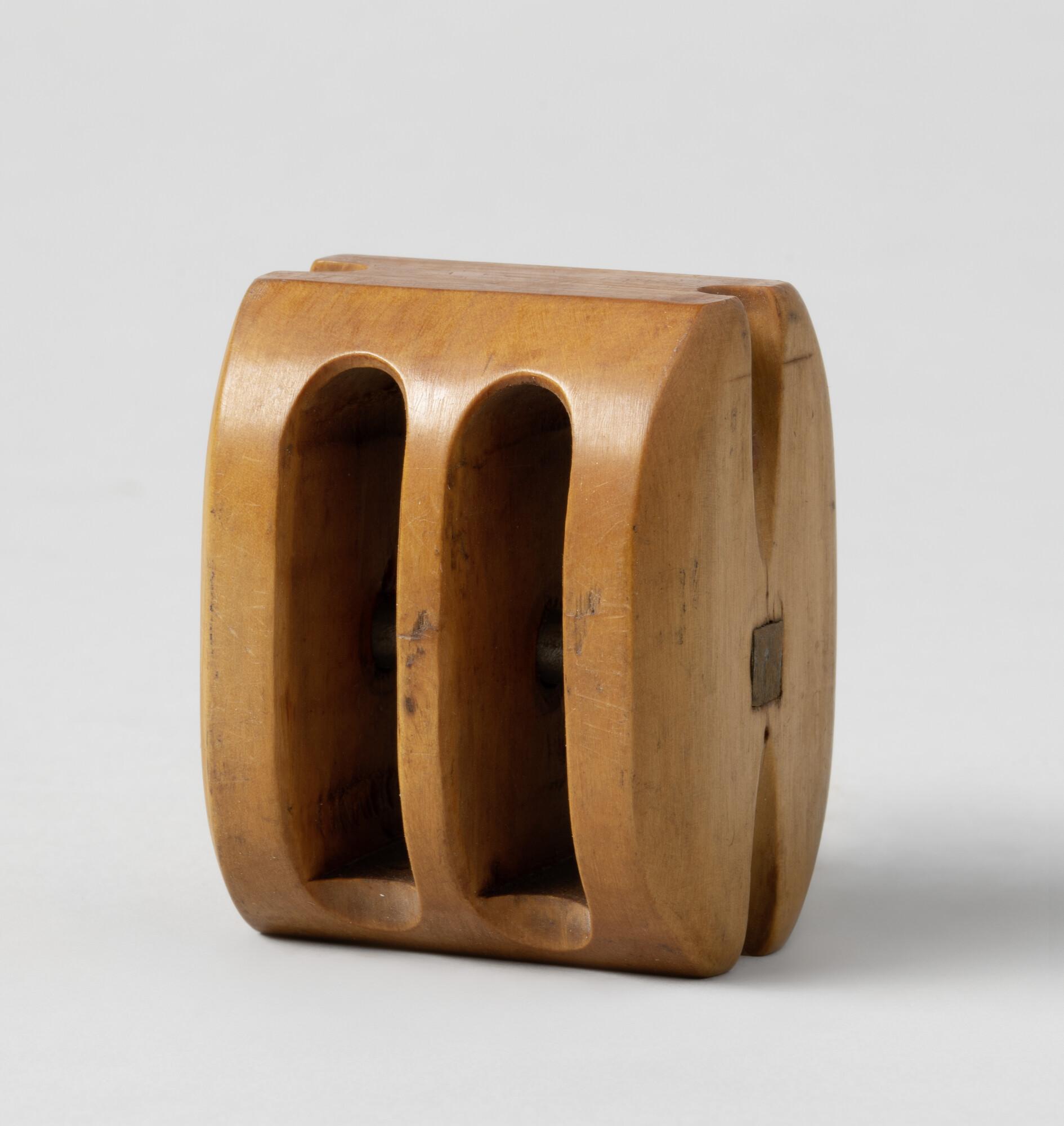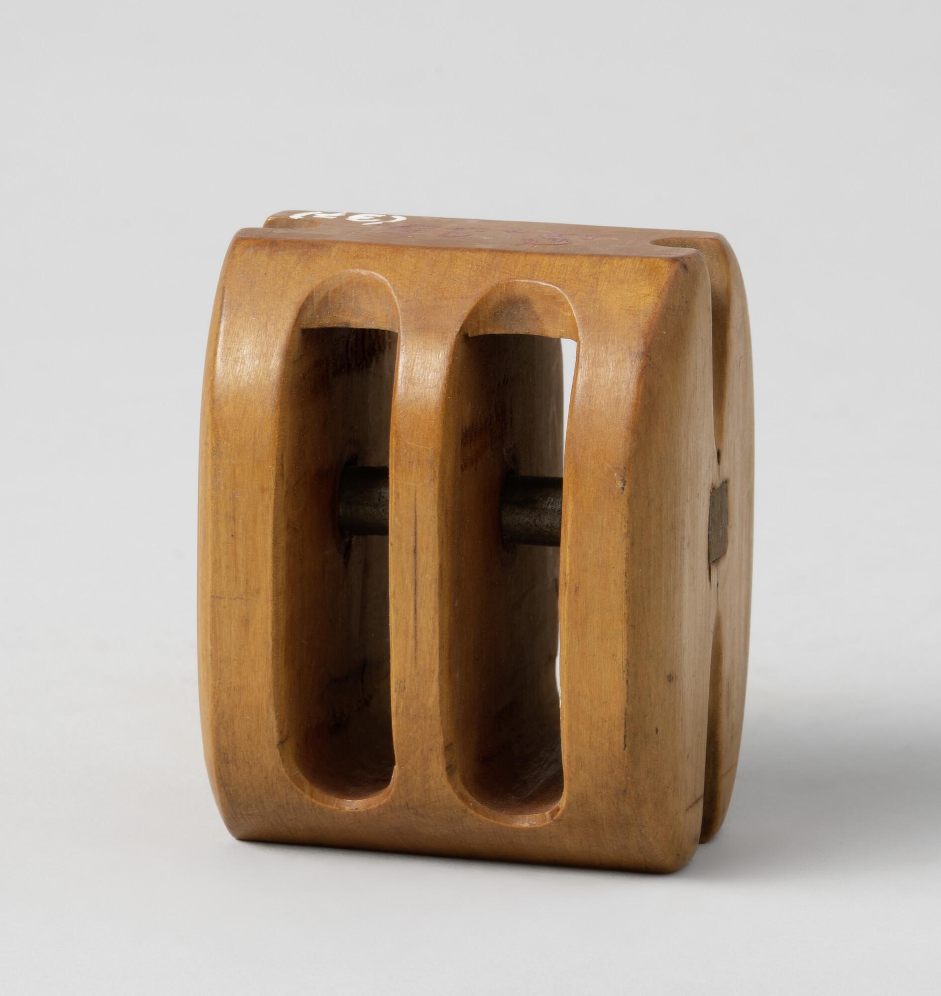 Iepenhouten blok, twee bronzen schijven ontbreken, wel is de ijzeren nagel aanwezig.