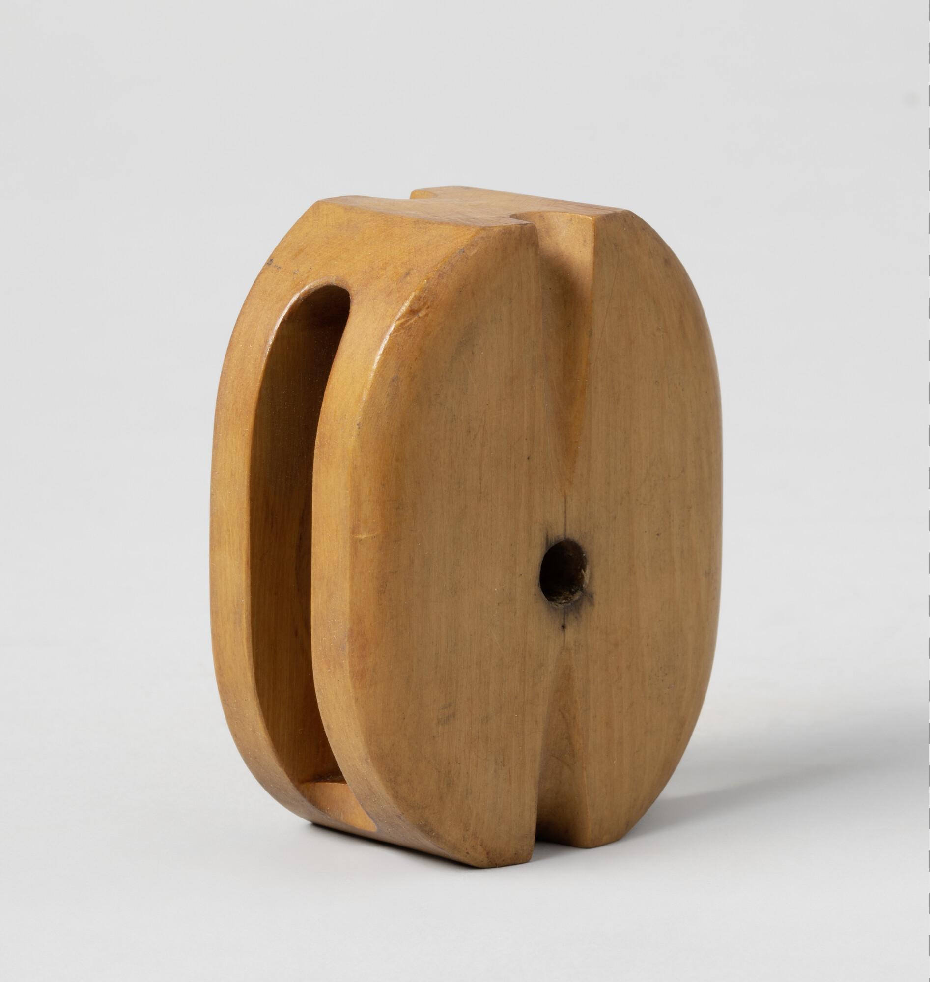 Enkelschijfsblok, vruchtboomhout, bronzen schijf en ijzeren nagel ontbreken.